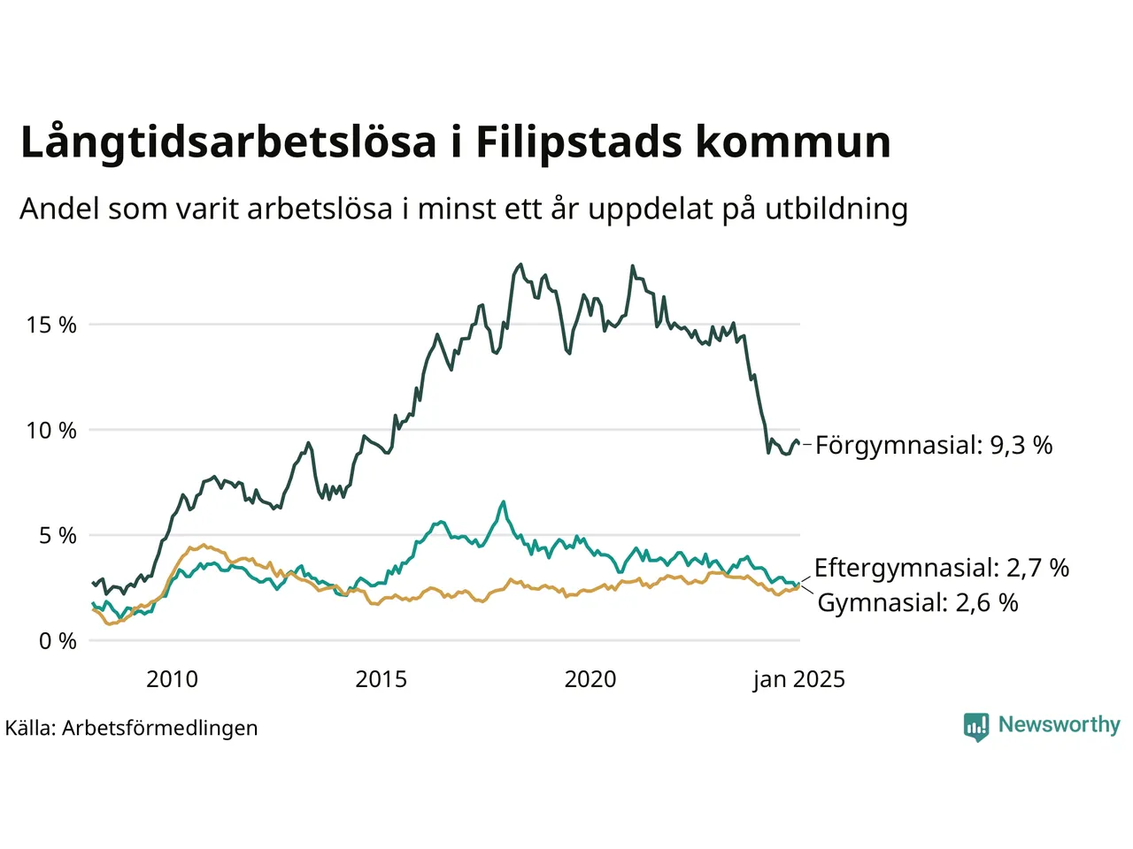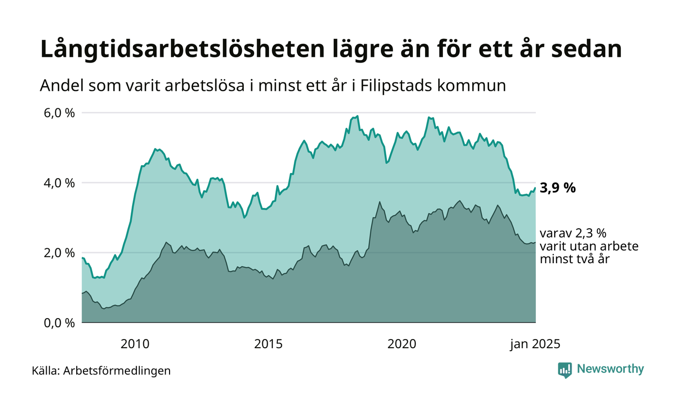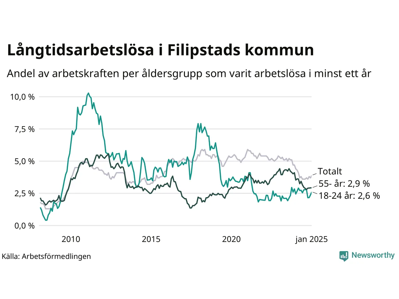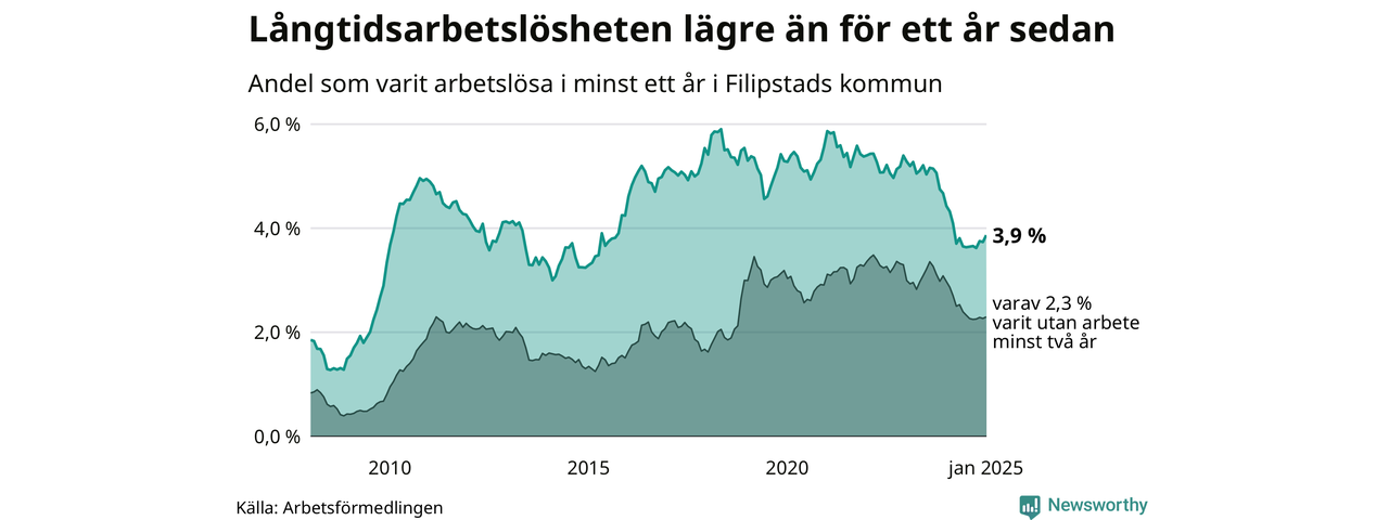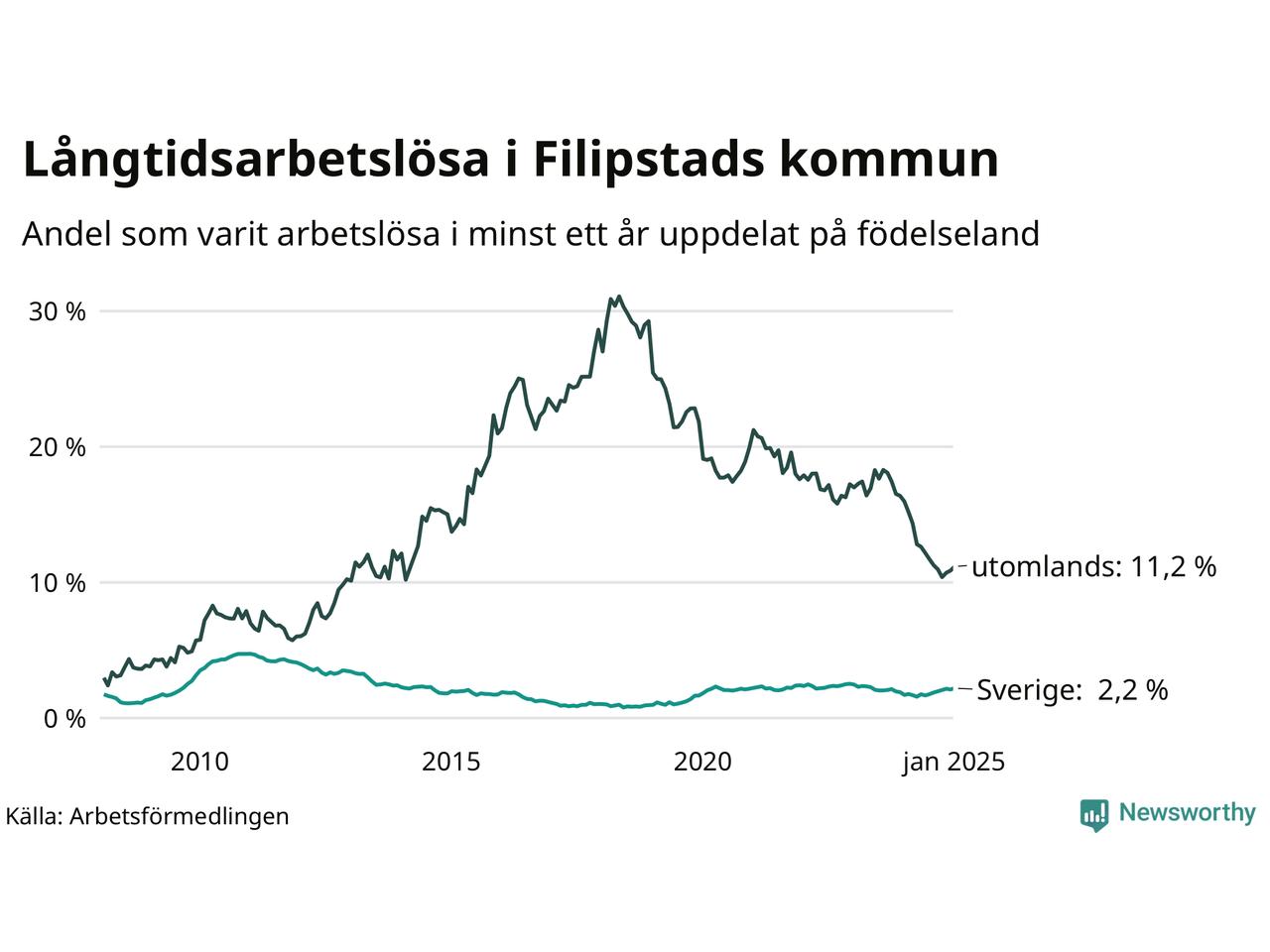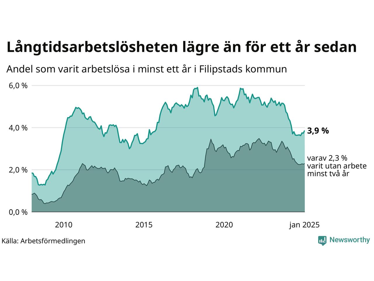 I januari hade 160 Filipstadsbor varit arbetslösa i minst ett år, vilket är fem fler än månaden innan. 160 personer motsvarar 3,9 procent av arbetskraften i kommunen – andelen långtidsarbetslösa är 0,5 procentenheter lägre än samma månad för ett år sedan.