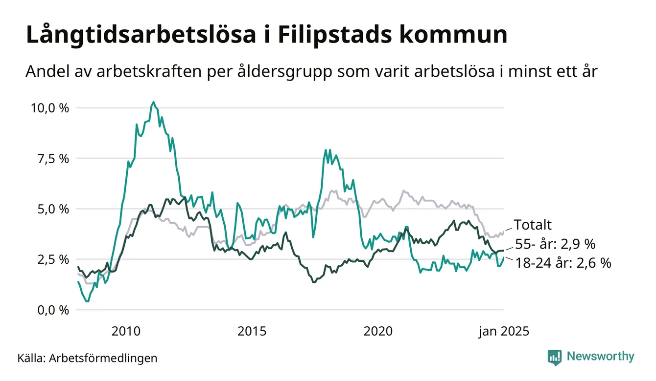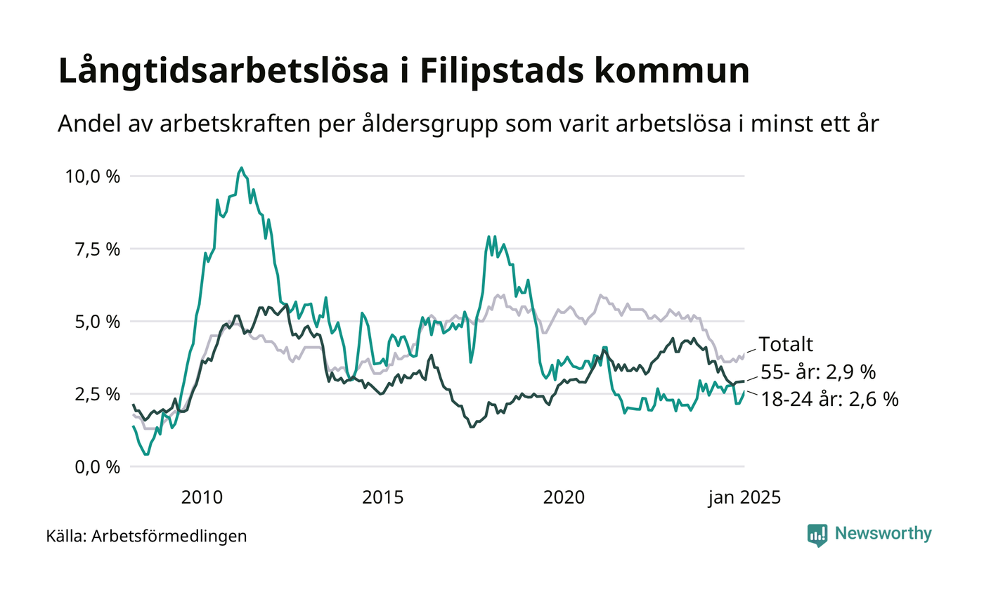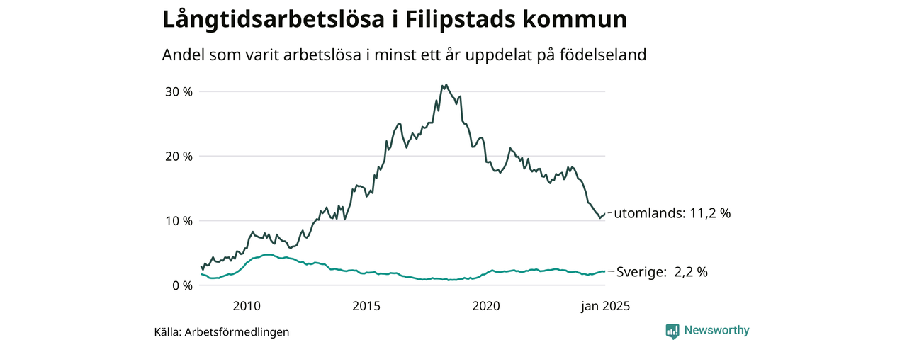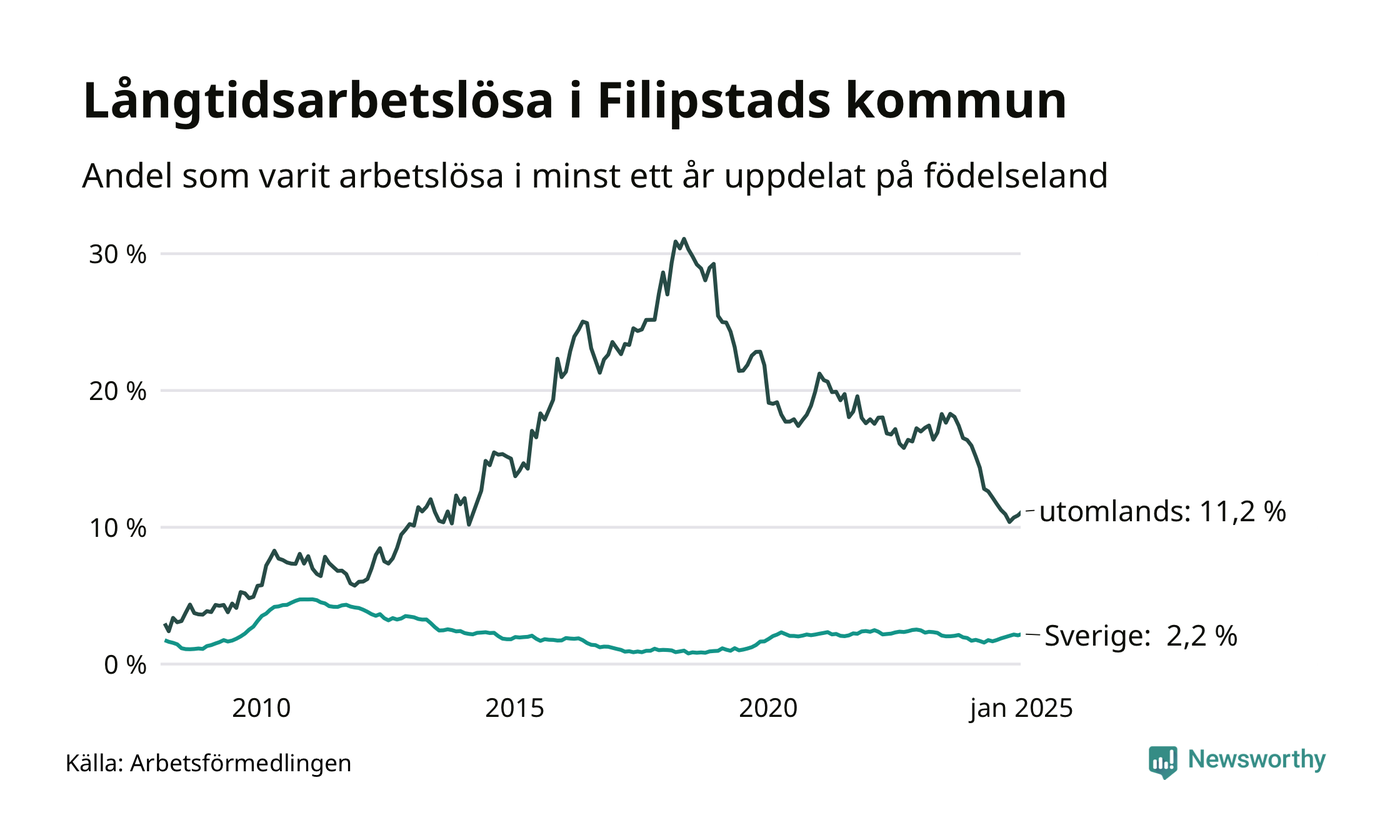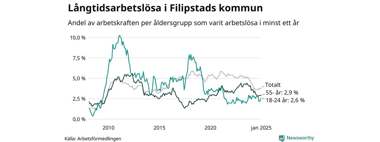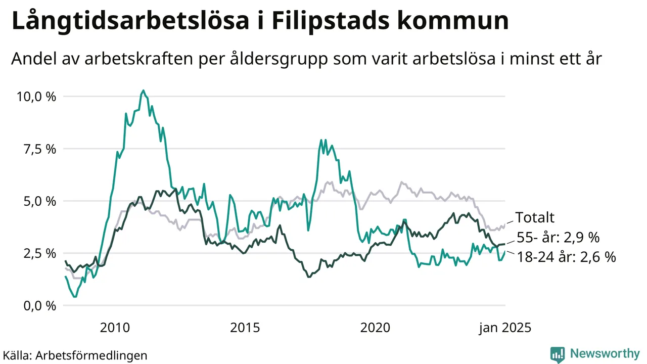 I januari hade 160 Filipstadsbor varit arbetslösa i minst ett år, vilket är fem fler än månaden innan. 160 personer motsvarar 3,9 procent av arbetskraften i kommunen – andelen långtidsarbetslösa är 0,5 procentenheter lägre än samma månad för ett år sedan.