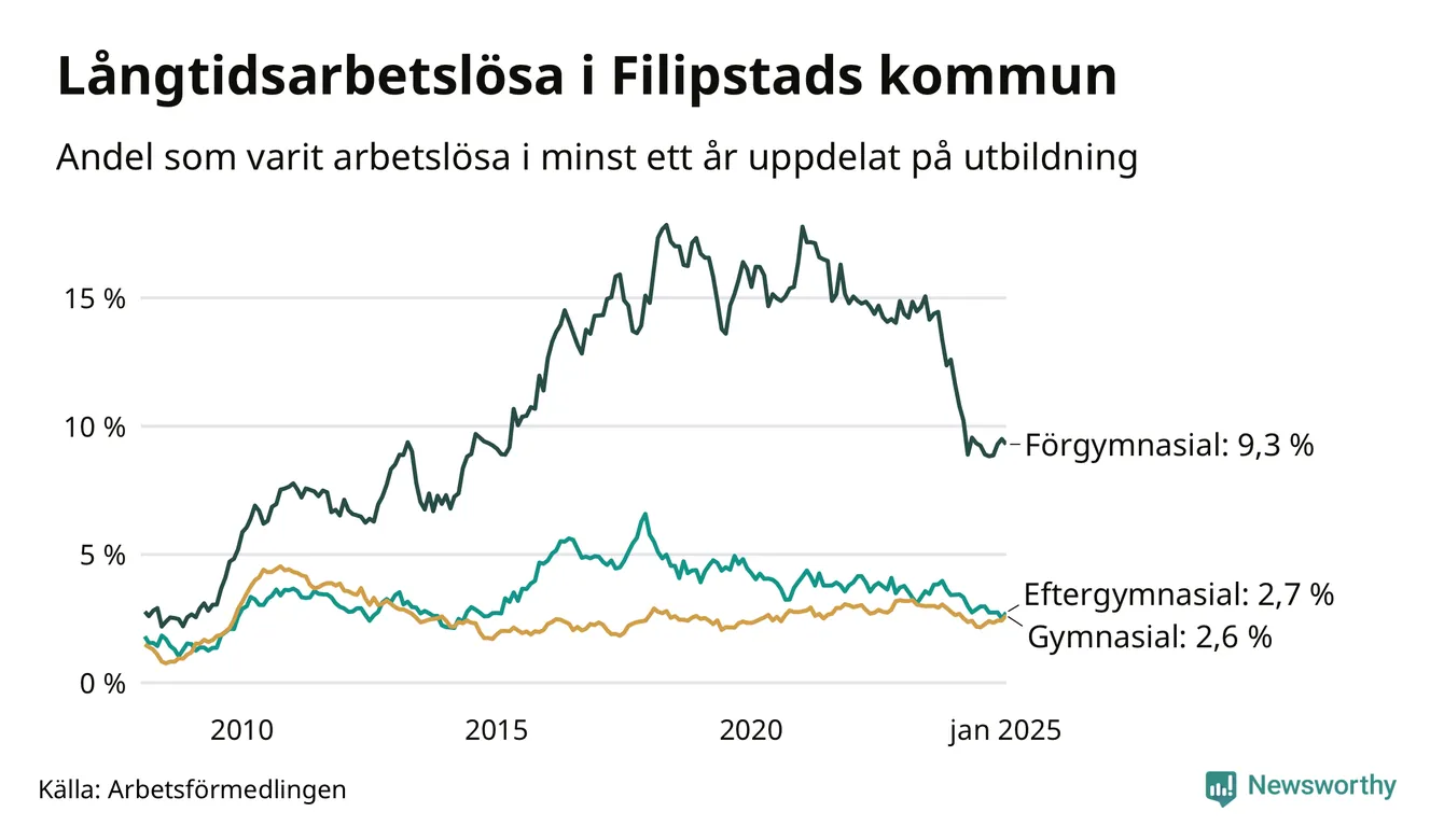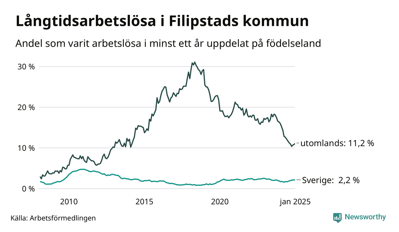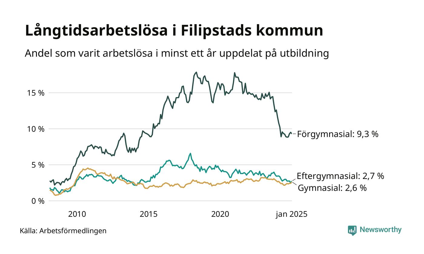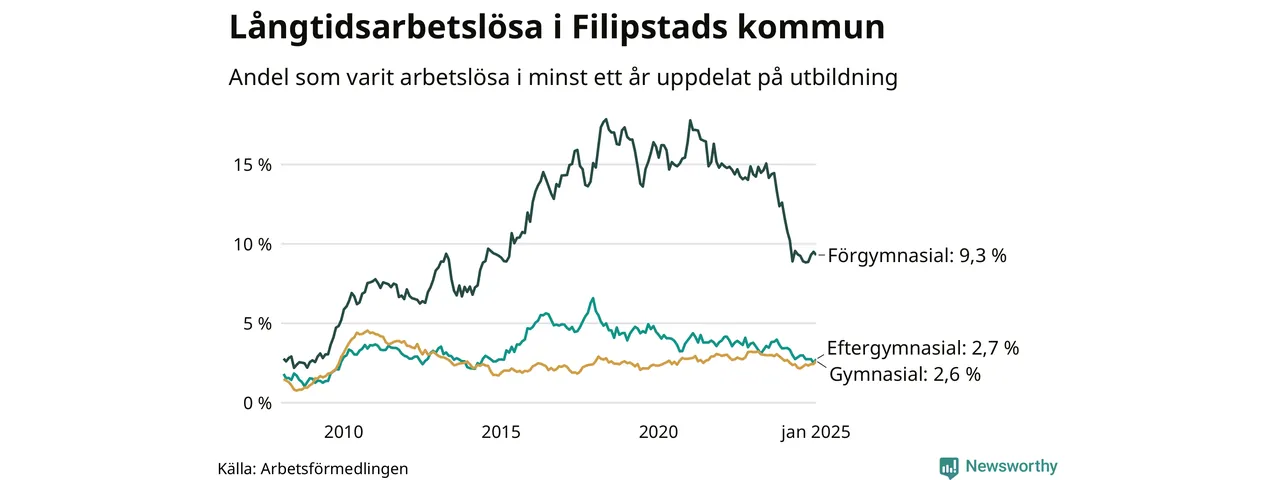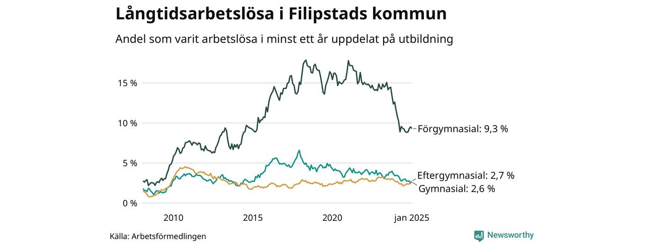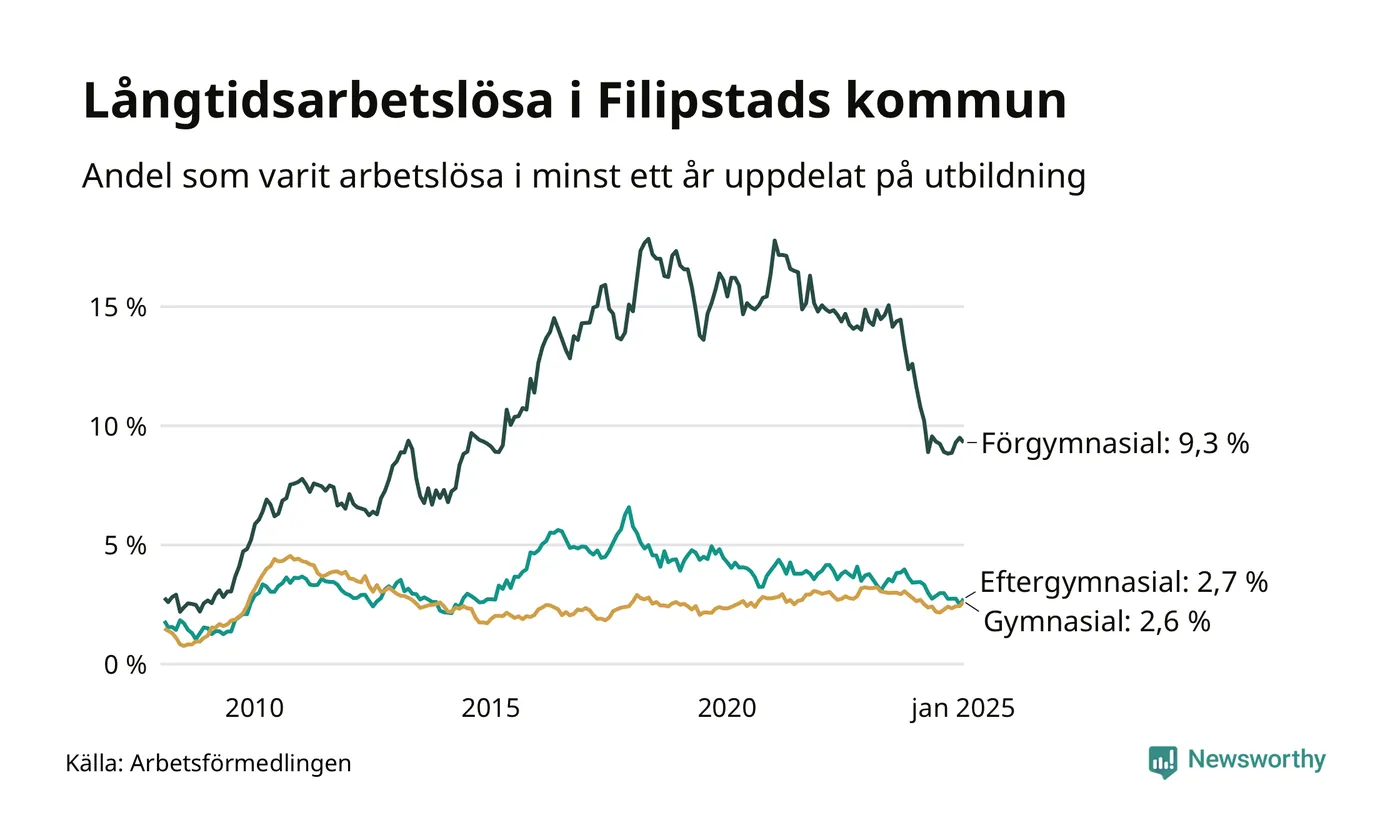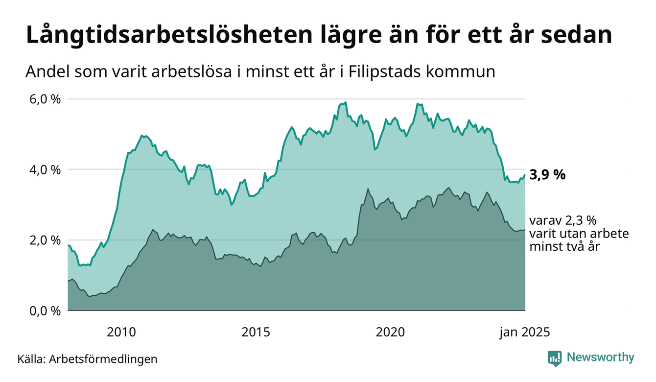 I januari hade 160 Filipstadsbor varit arbetslösa i minst ett år, vilket är fem fler än månaden innan. 160 personer motsvarar 3,9 procent av arbetskraften i kommunen – andelen långtidsarbetslösa är 0,5 procentenheter lägre än samma månad för ett år sedan.