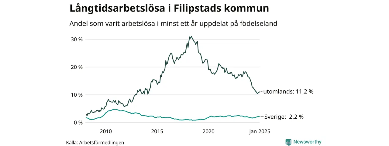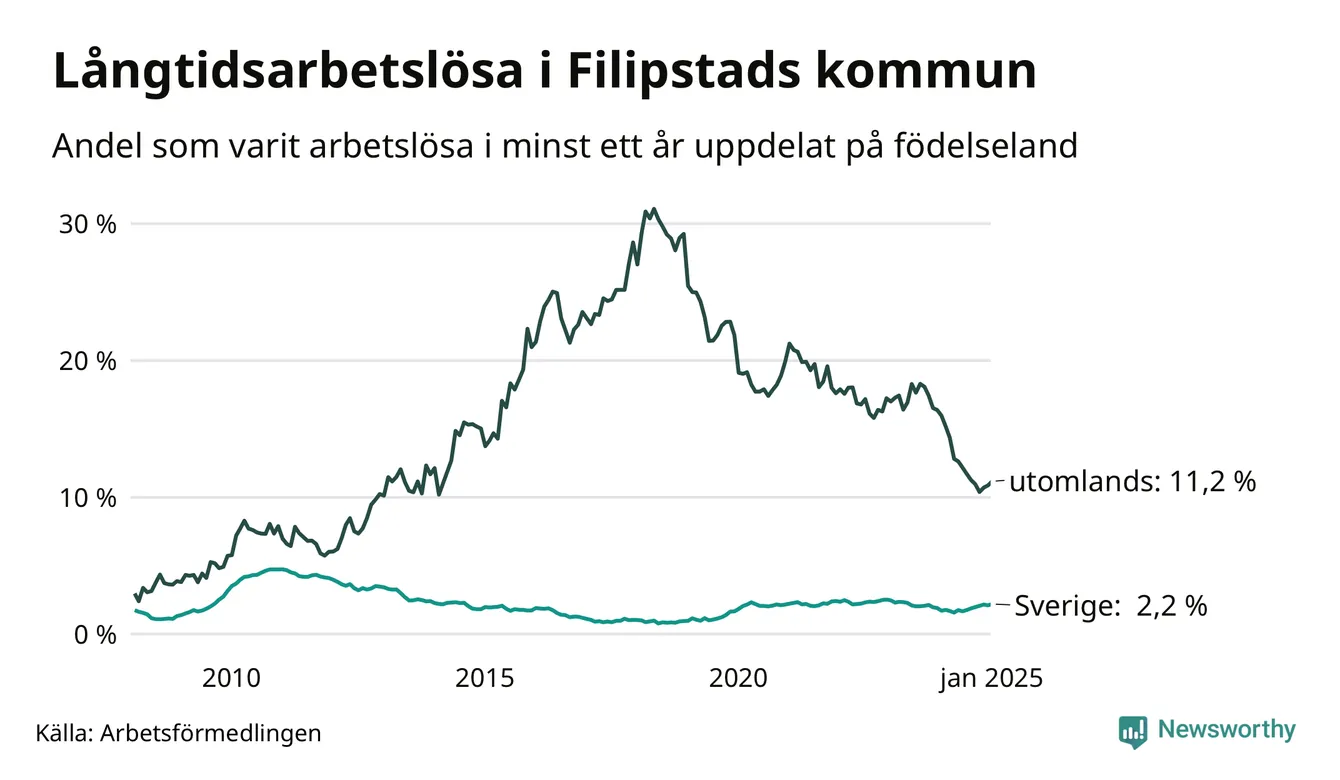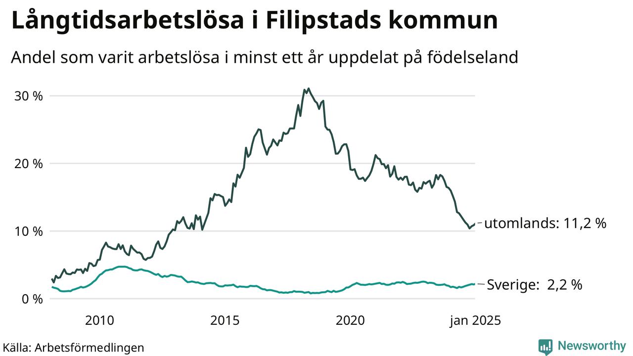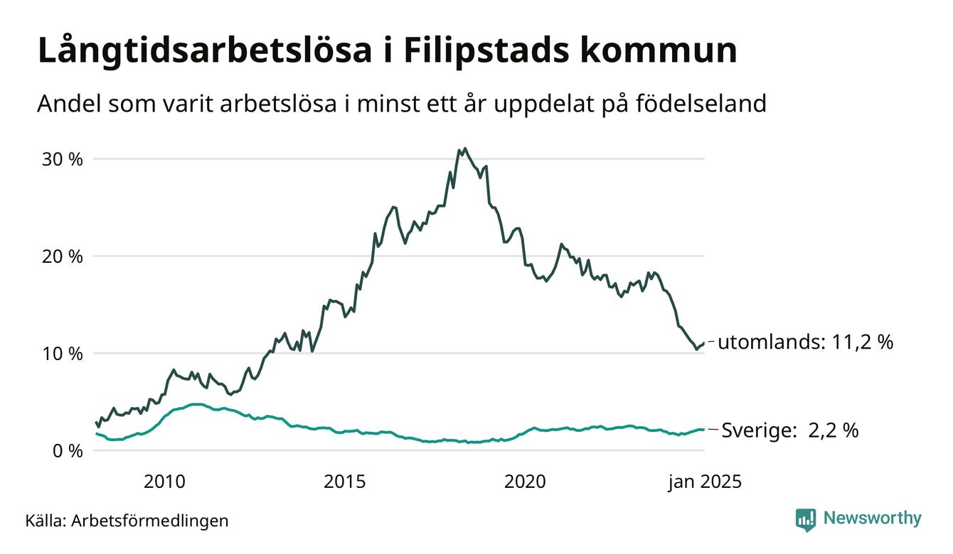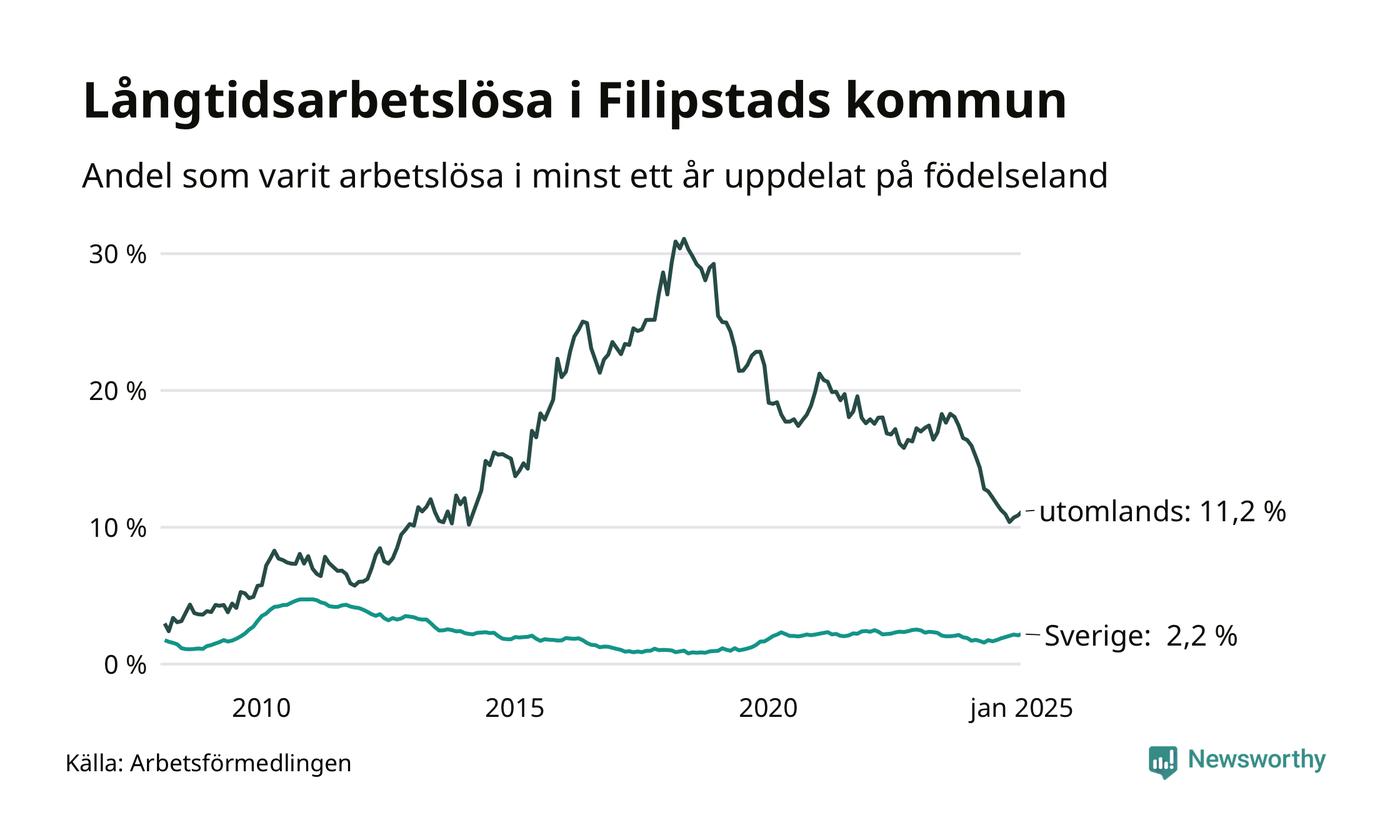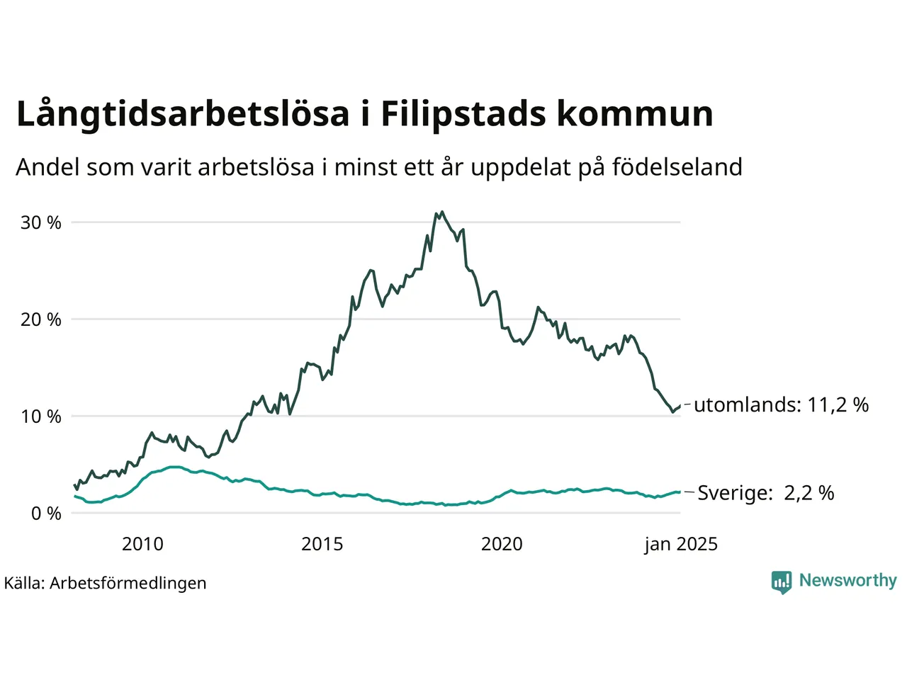 74 av de långtidsarbetslösa i Filipstad är födda i Sverige, medan 86 är födda utomlands. Det innebär att långtidsarbetslösheten bland Sverigefödda är 2,2 procent, medan den är fem gånger så hög – 11,2 procent – bland födda utomlands. Även i riket som helhet är arbetslösheten högre bland utrikesfödda.