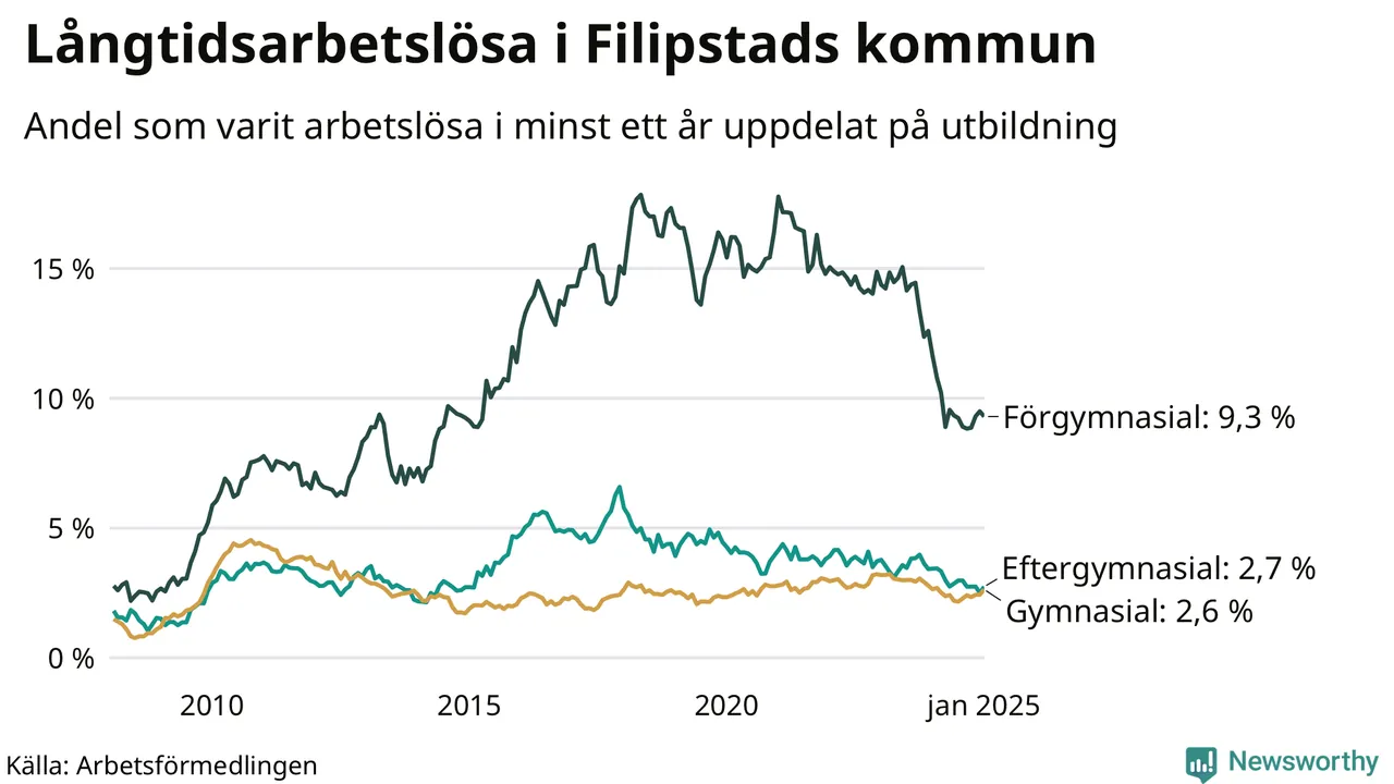 Andelen som varit utan arbete i minst ett år i Filipstad i januari var lägre än för ett år sedan. Men jämfört med i december har antalet långtidsarbetslösa ökat.