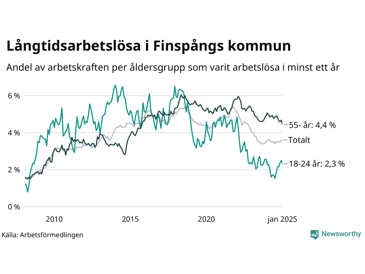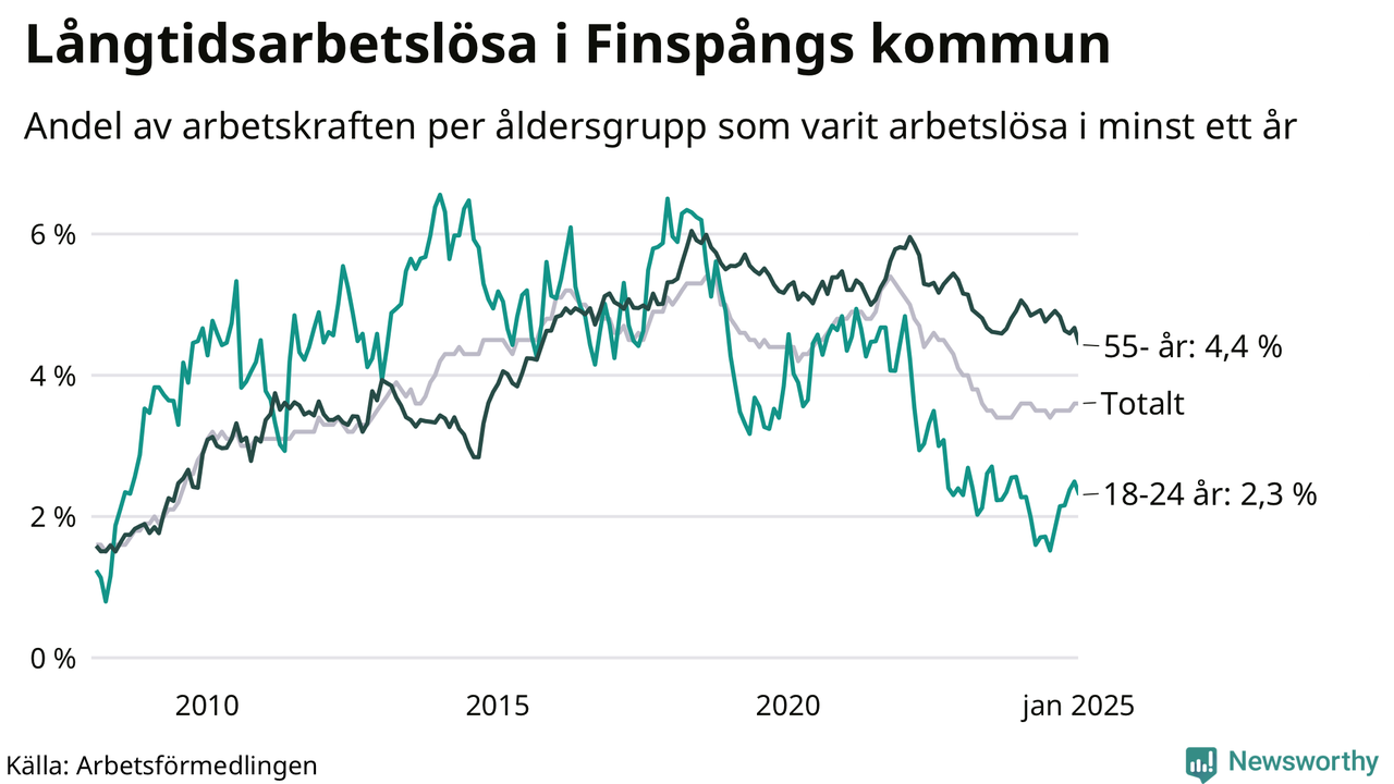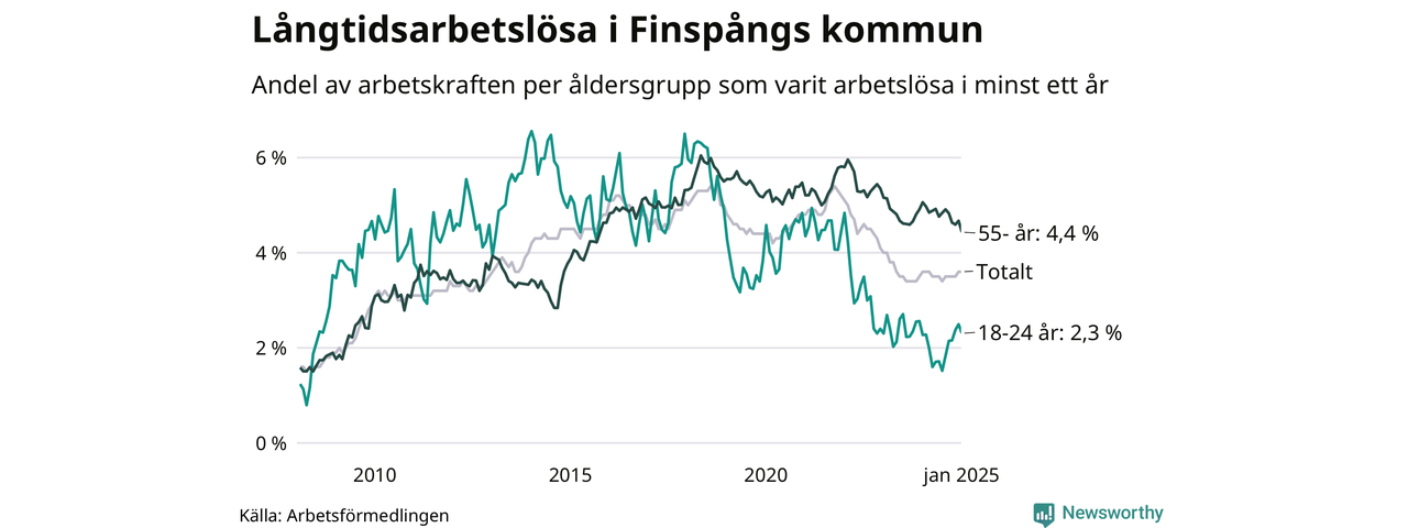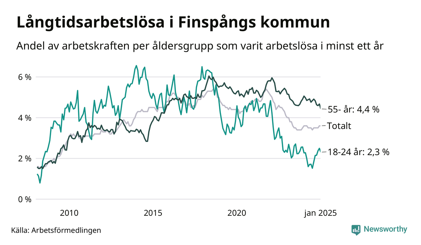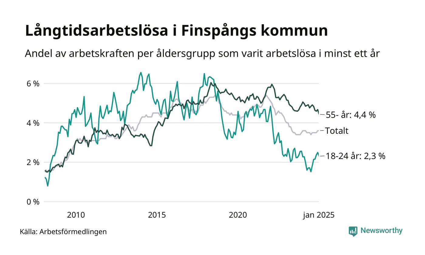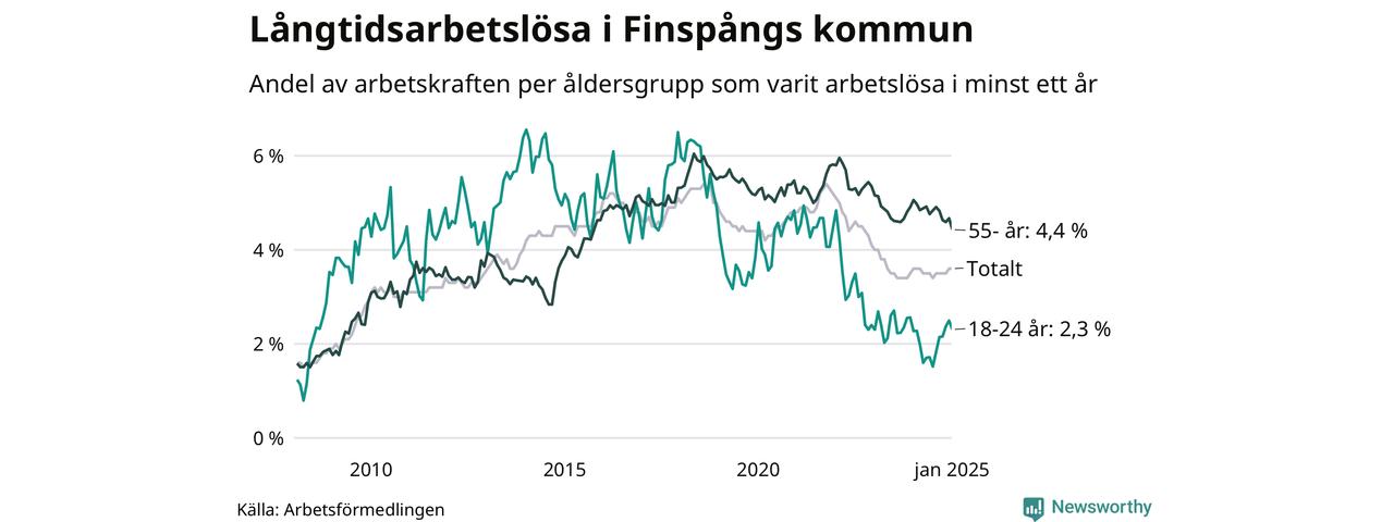 Av de 375 personerna som varit arbetslösa i mer än ett år i Finspångs kommun är 112 personer mellan 55 och 651 år och 22 är mellan 18 och 24 år. För den äldre gruppen är andelen arbetslösa 4,4 procent medan den i den yngre gruppen är 2,3 procent. Även i riket som helhet är långtidsarbetslösheten högre i gruppen äldre.