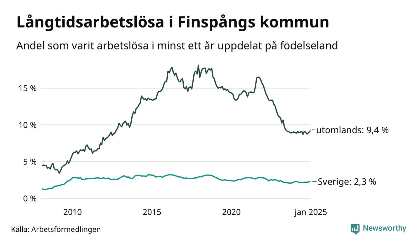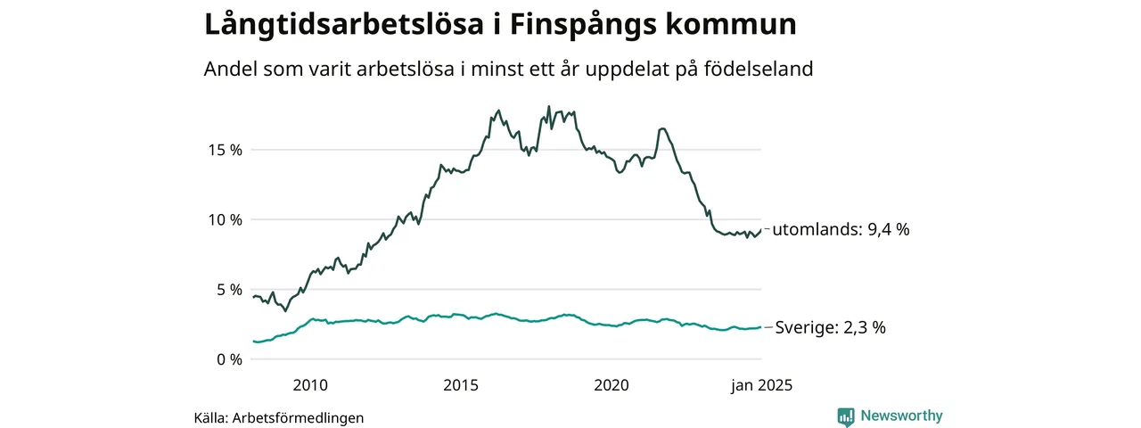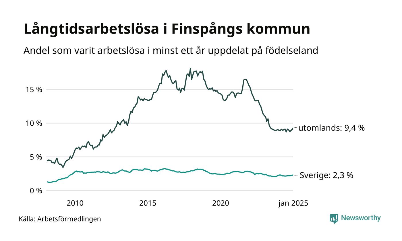 188 av de långtidsarbetslösa i Finspång är födda i Sverige, medan 187 är födda utomlands. Det innebär att långtidsarbetslösheten bland Sverigefödda är 2,3 procent, medan den är fyra gånger så hög – 9,4 procent – bland födda utomlands. Även i riket som helhet är arbetslösheten högre bland utrikesfödda.