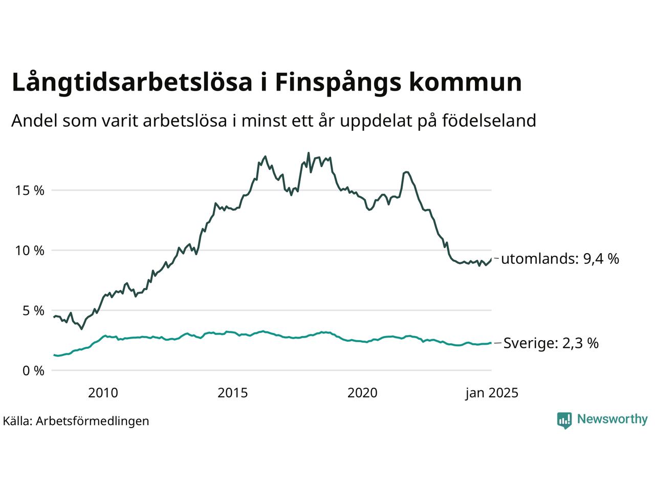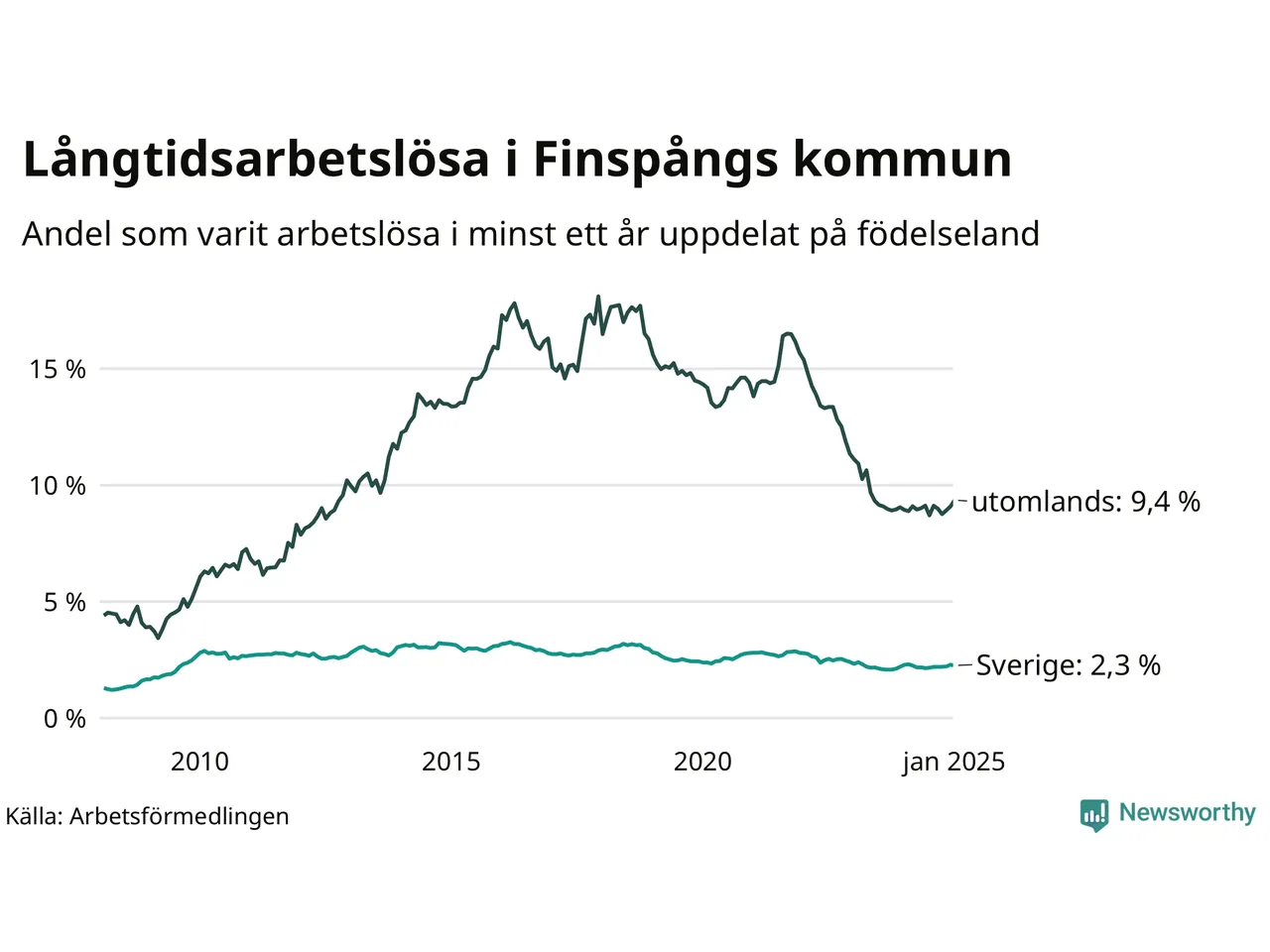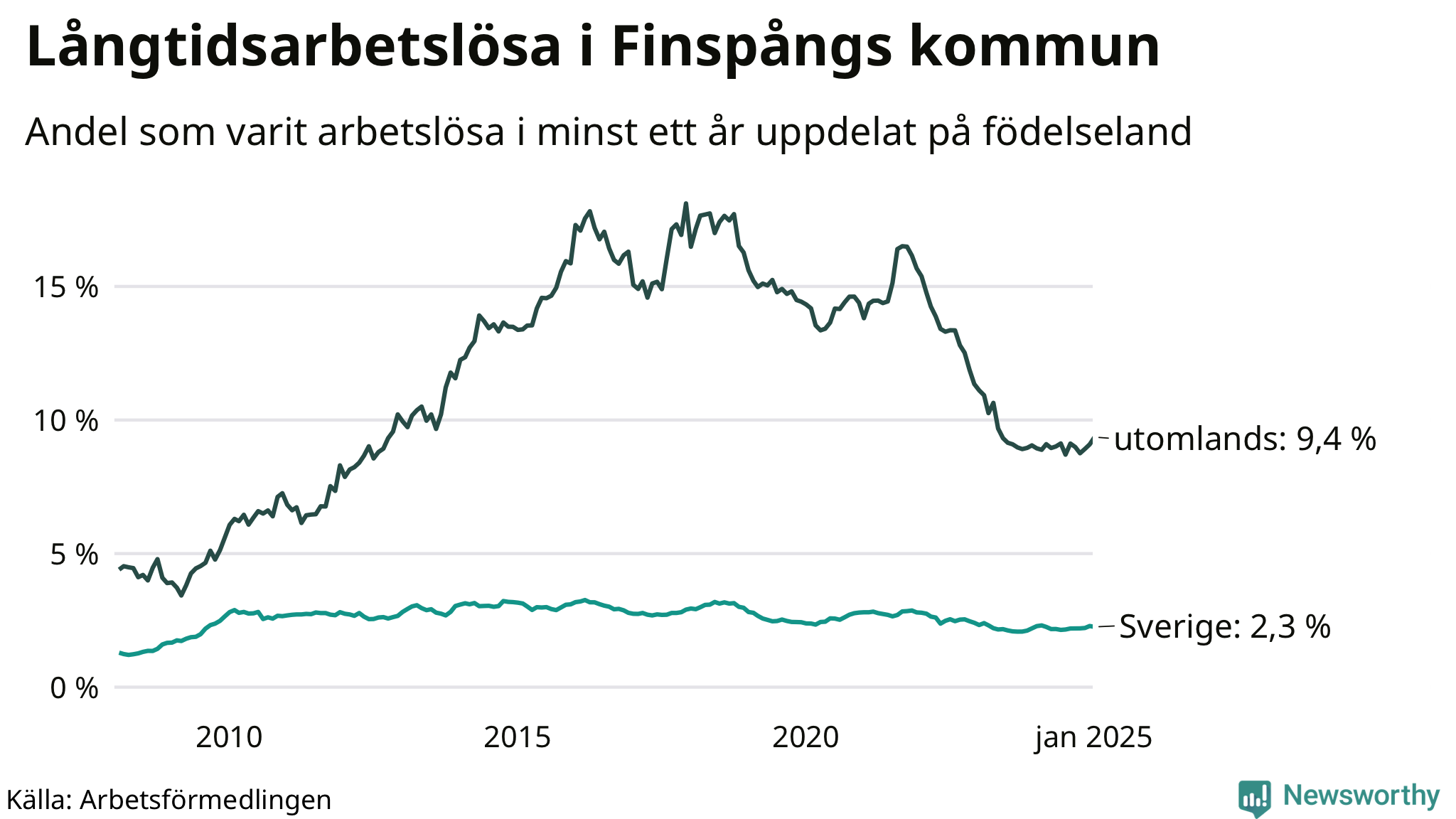 188 av de långtidsarbetslösa i Finspång är födda i Sverige, medan 187 är födda utomlands. Det innebär att långtidsarbetslösheten bland Sverigefödda är 2,3 procent, medan den är fyra gånger så hög – 9,4 procent – bland födda utomlands. Även i riket som helhet är arbetslösheten högre bland utrikesfödda.