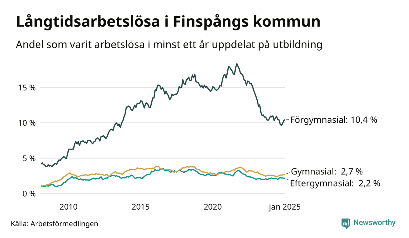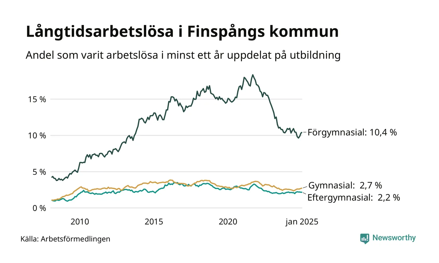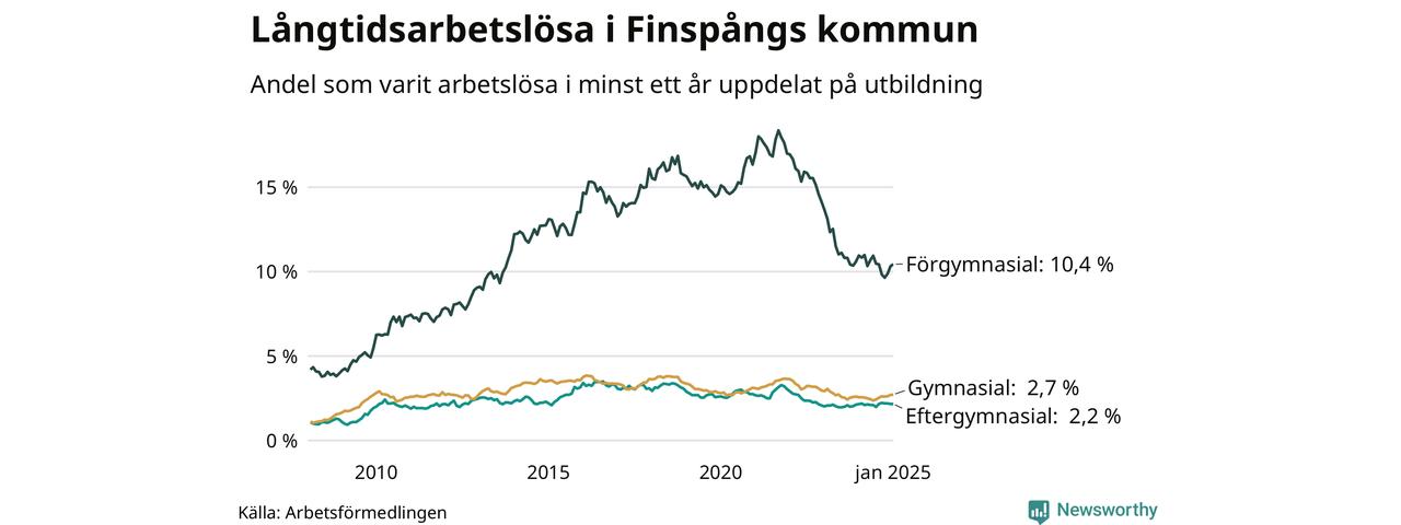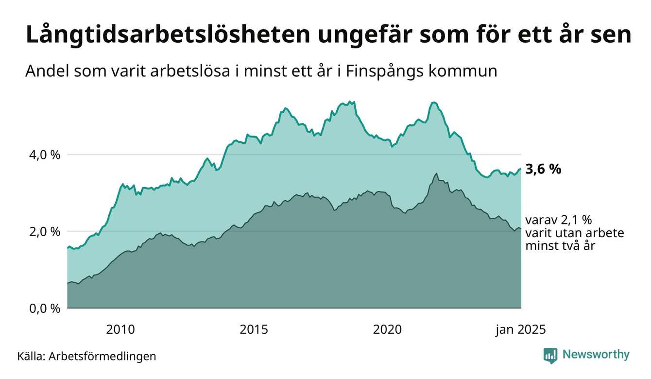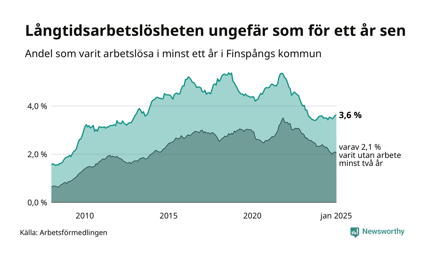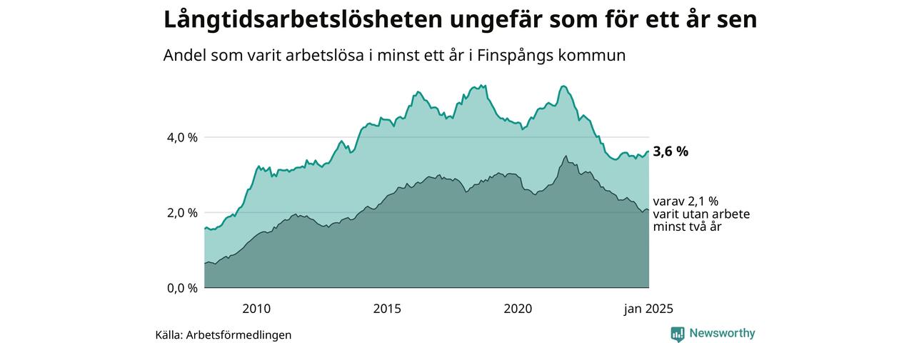 I januari hade 375 Finspångsbor varit arbetslösa i minst ett år, vilket är två fler än månaden innan. 375 personer motsvarar 3,6 procent av arbetskraften i kommunen – andelen långtidsarbetslösa är ungefär på samma nivå som för ett år sedan.