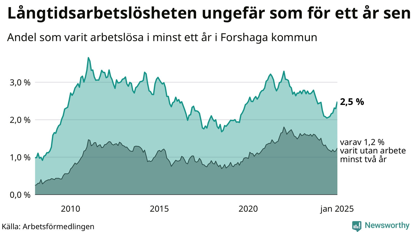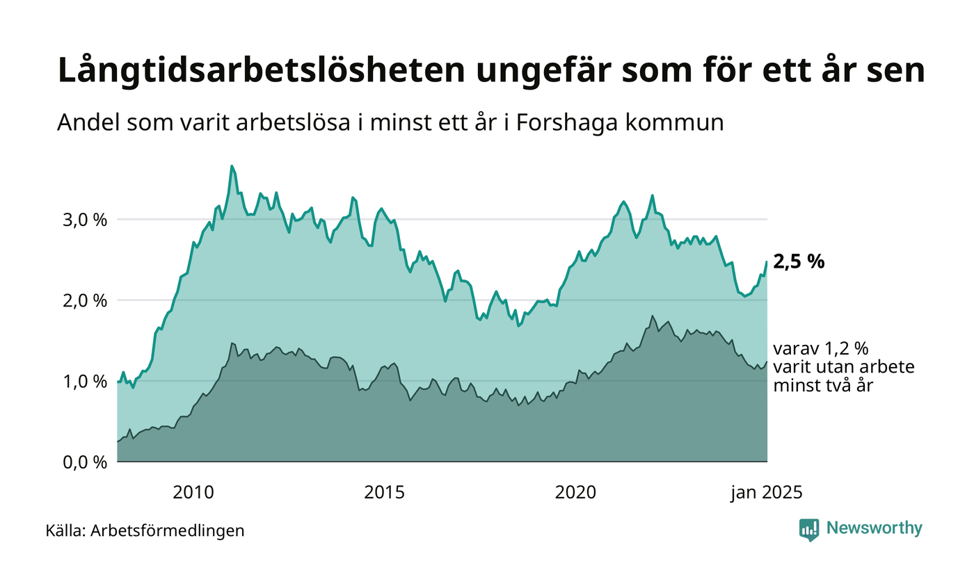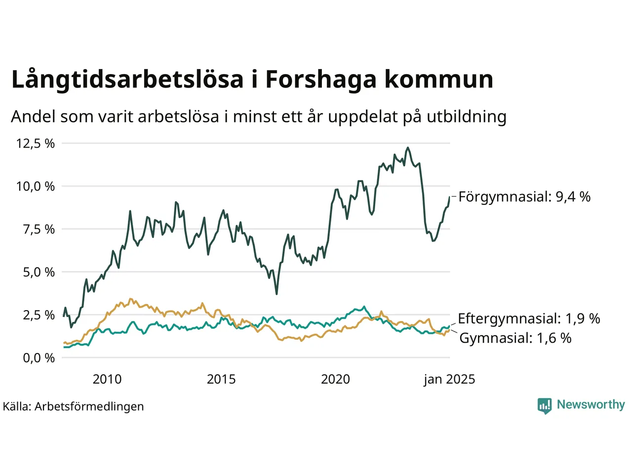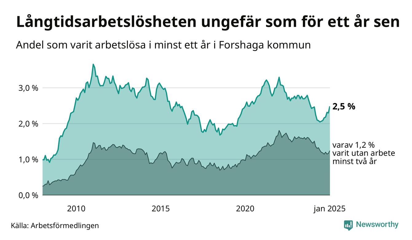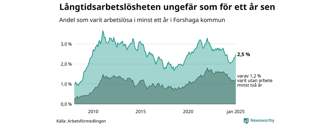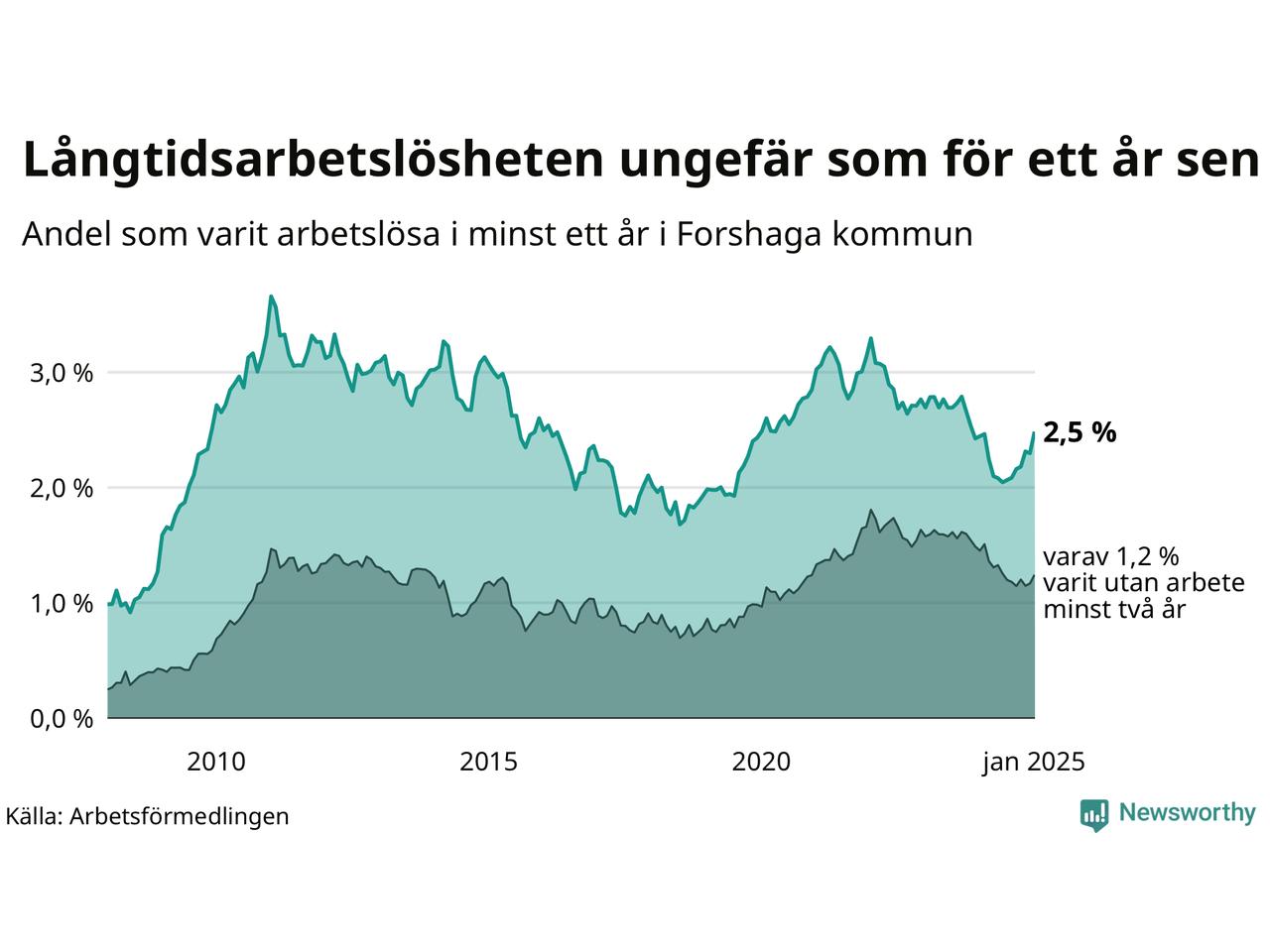 I januari hade 134 Forshagabor varit arbetslösa i minst ett år, vilket är tio fler än månaden innan. 134 personer motsvarar 2,5 procent av arbetskraften i kommunen – andelen långtidsarbetslösa är ungefär på samma nivå som för ett år sedan.