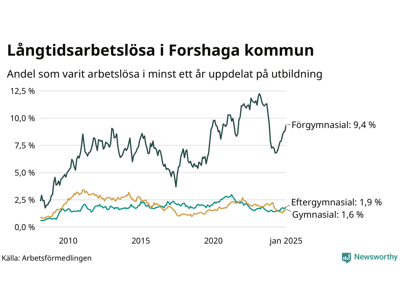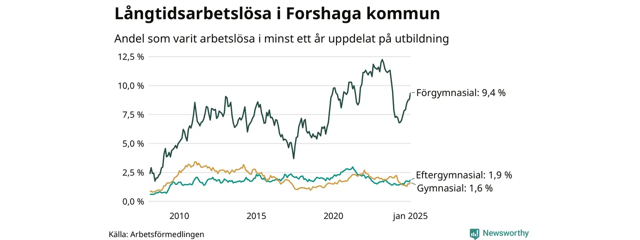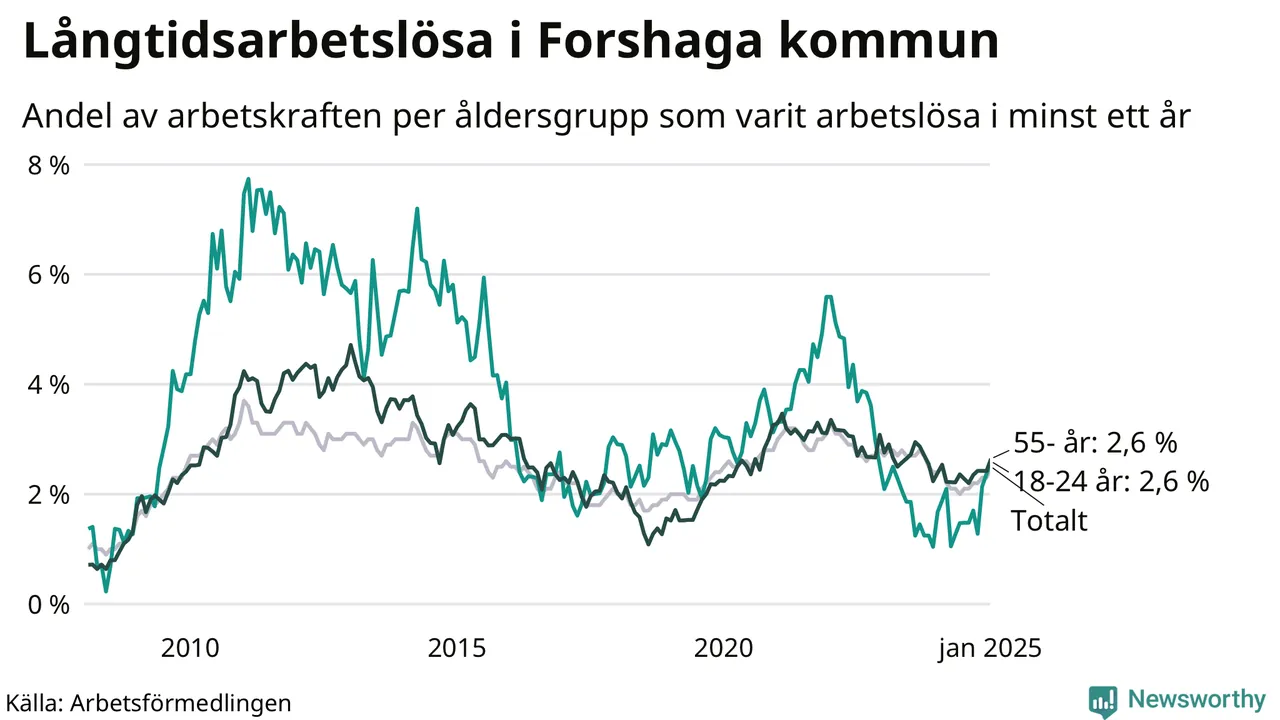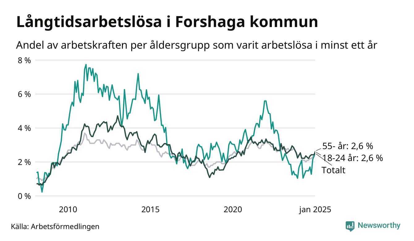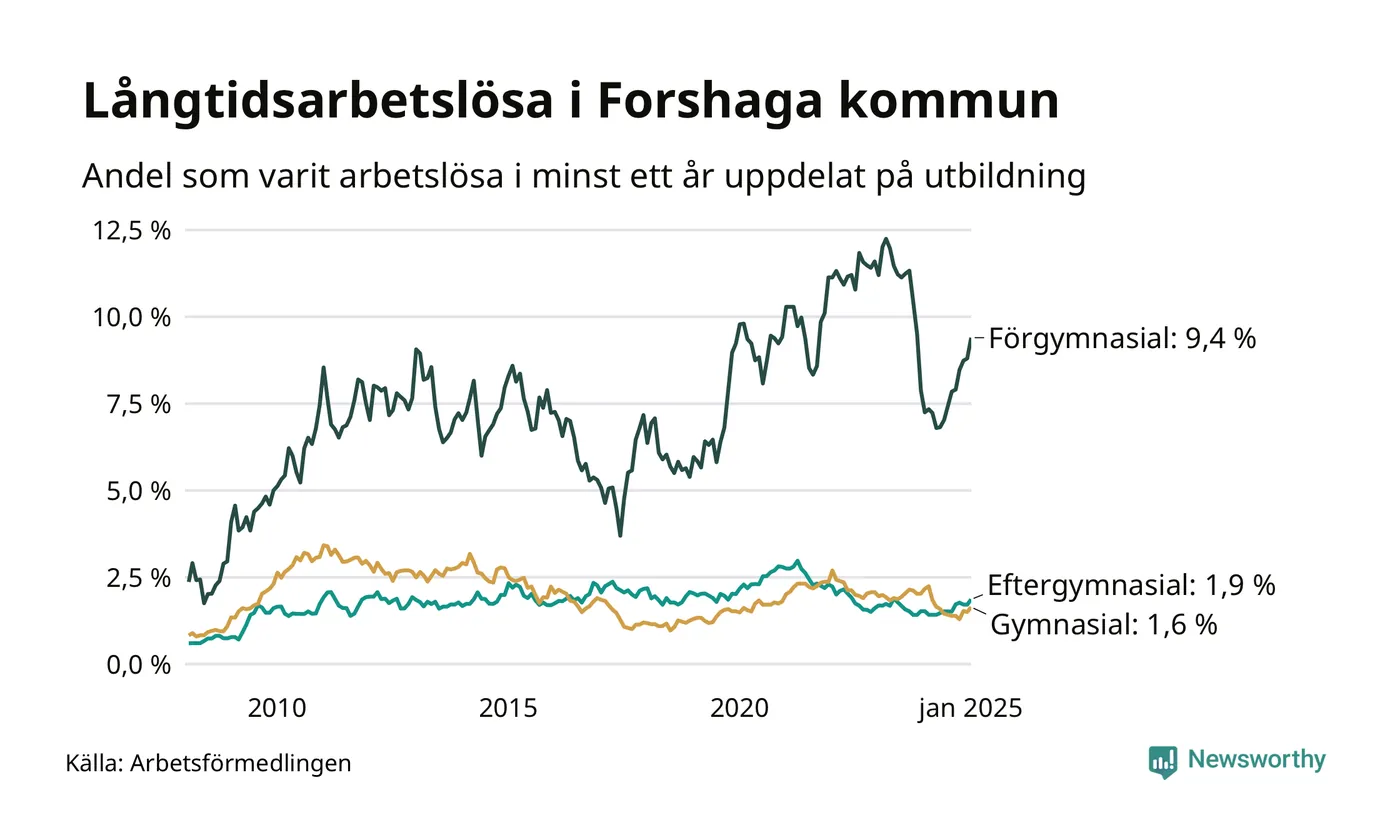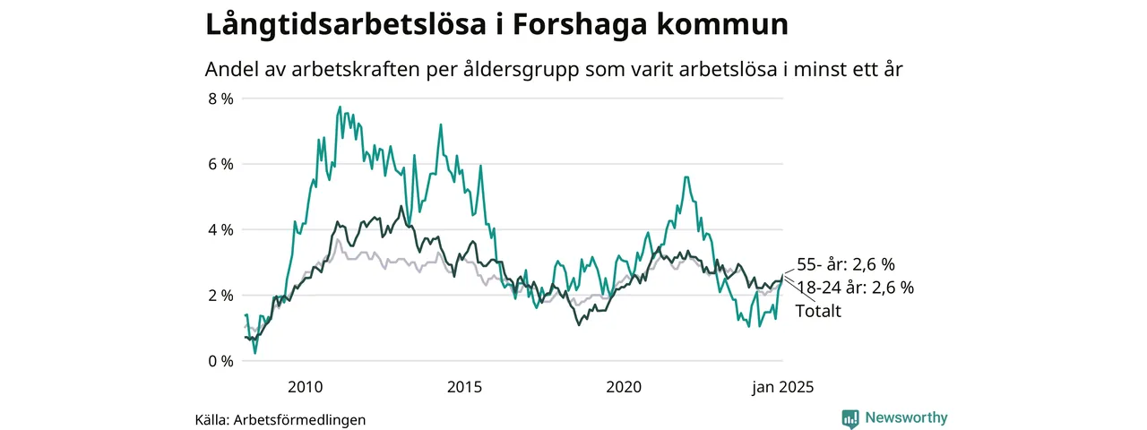 I januari hade 134 Forshagabor varit arbetslösa i minst ett år, vilket är tio fler än månaden innan. 134 personer motsvarar 2,5 procent av arbetskraften i kommunen – andelen långtidsarbetslösa är ungefär på samma nivå som för ett år sedan.