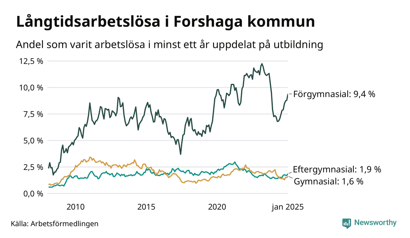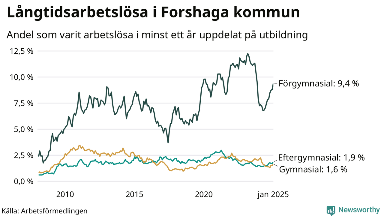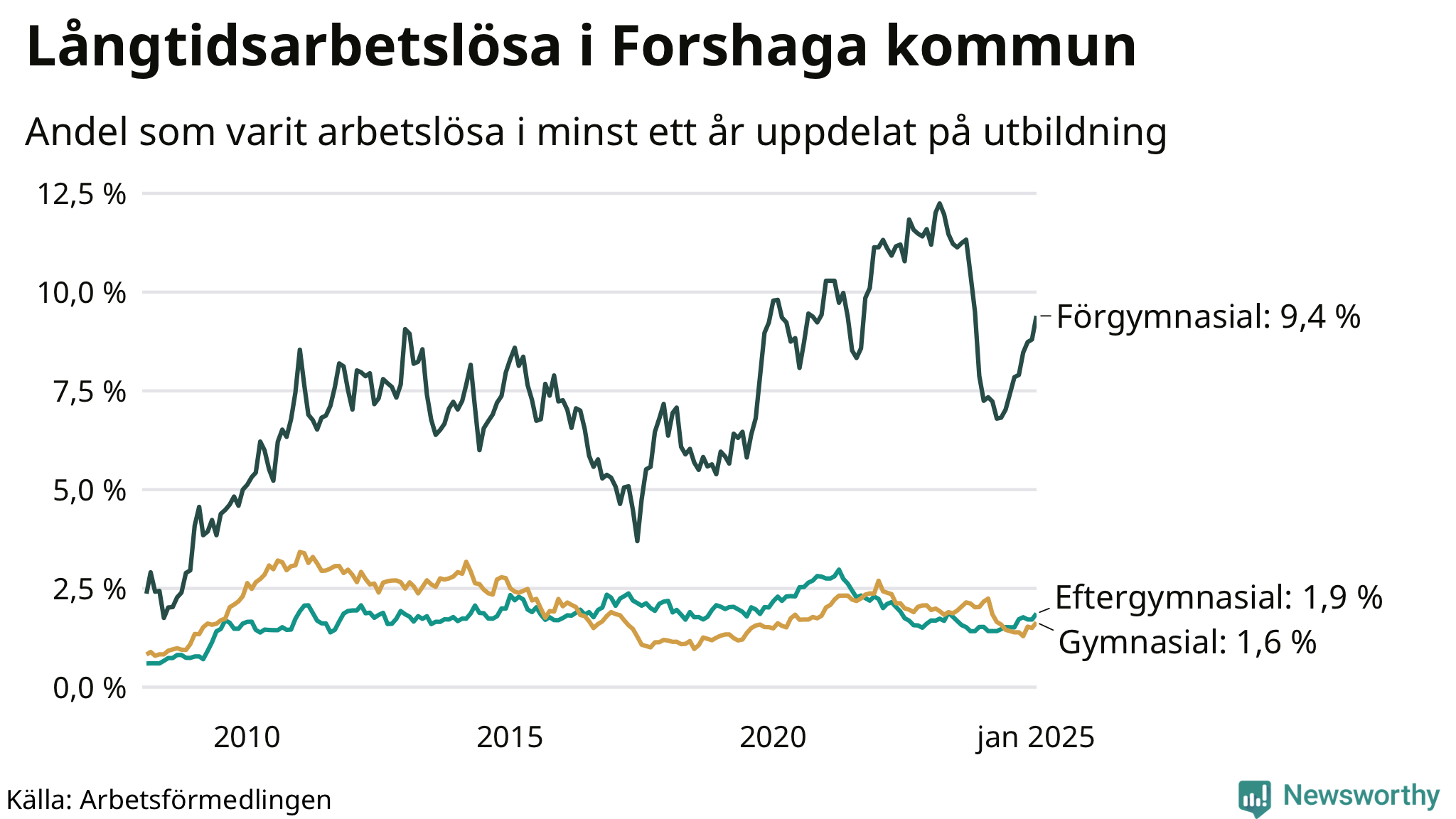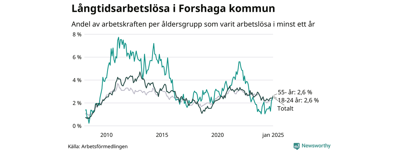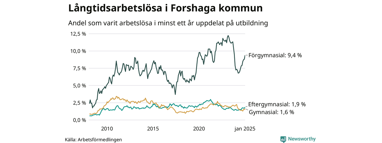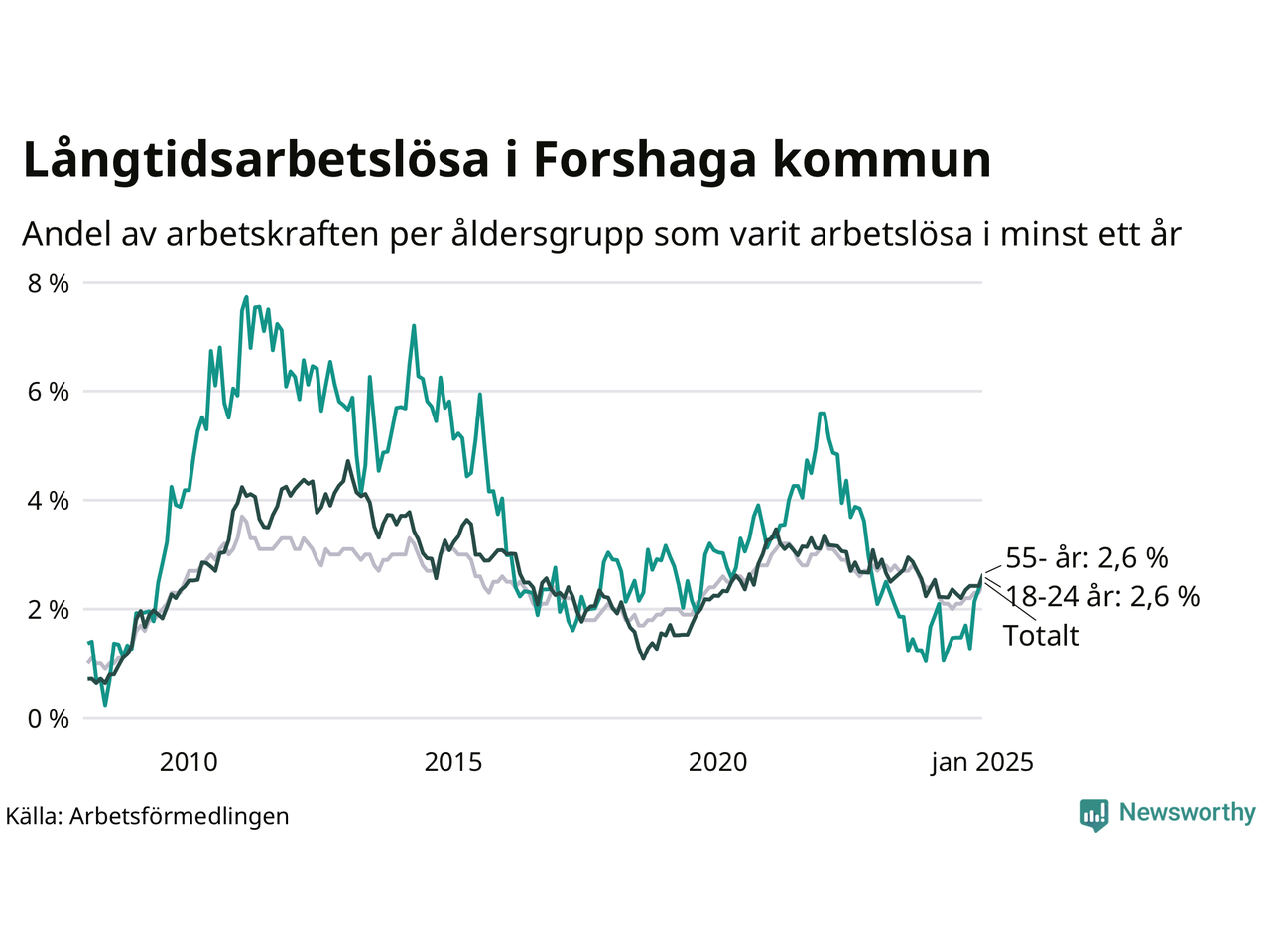 I januari hade 134 Forshagabor varit arbetslösa i minst ett år, vilket är tio fler än månaden innan. 134 personer motsvarar 2,5 procent av arbetskraften i kommunen – andelen långtidsarbetslösa är ungefär på samma nivå som för ett år sedan.