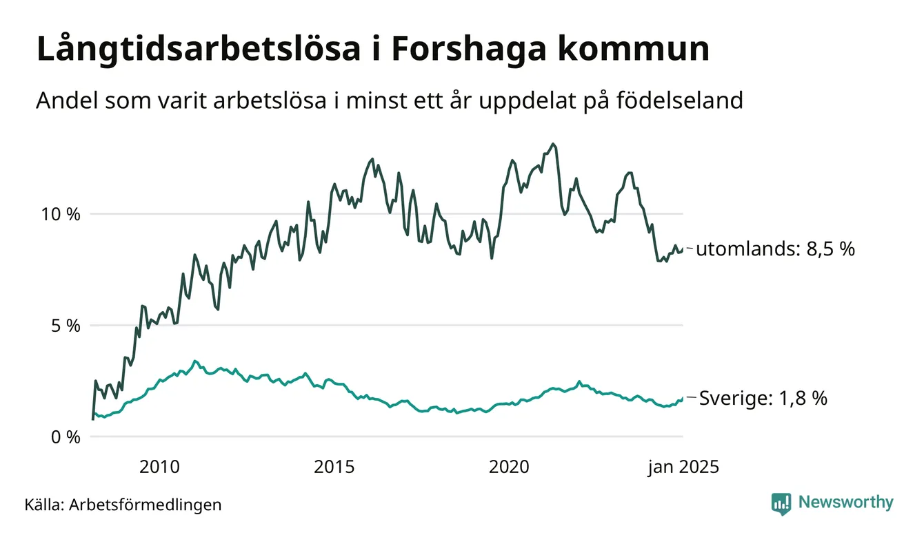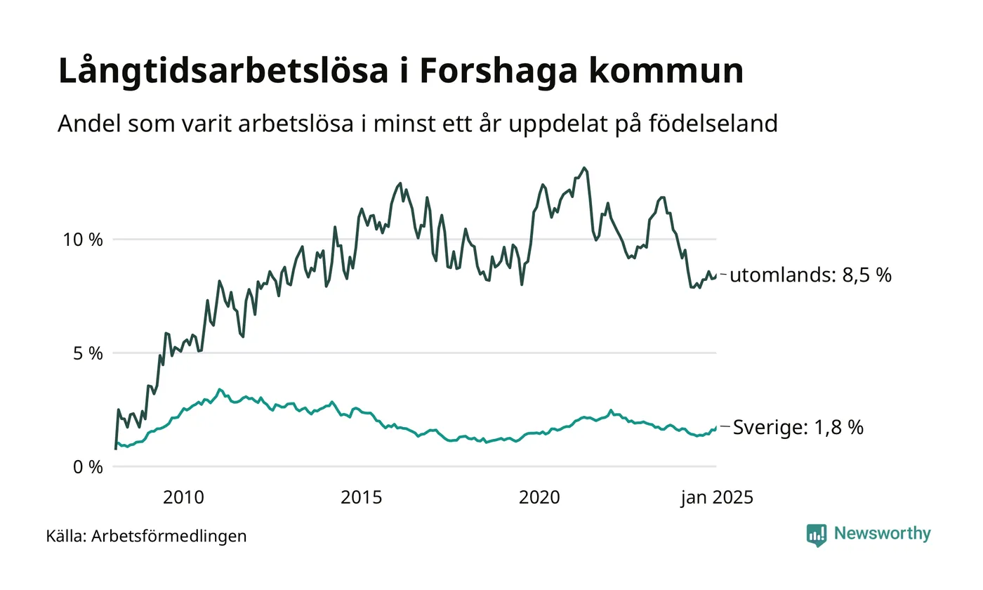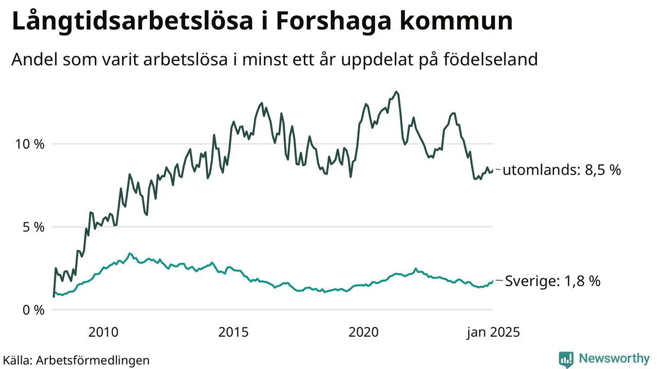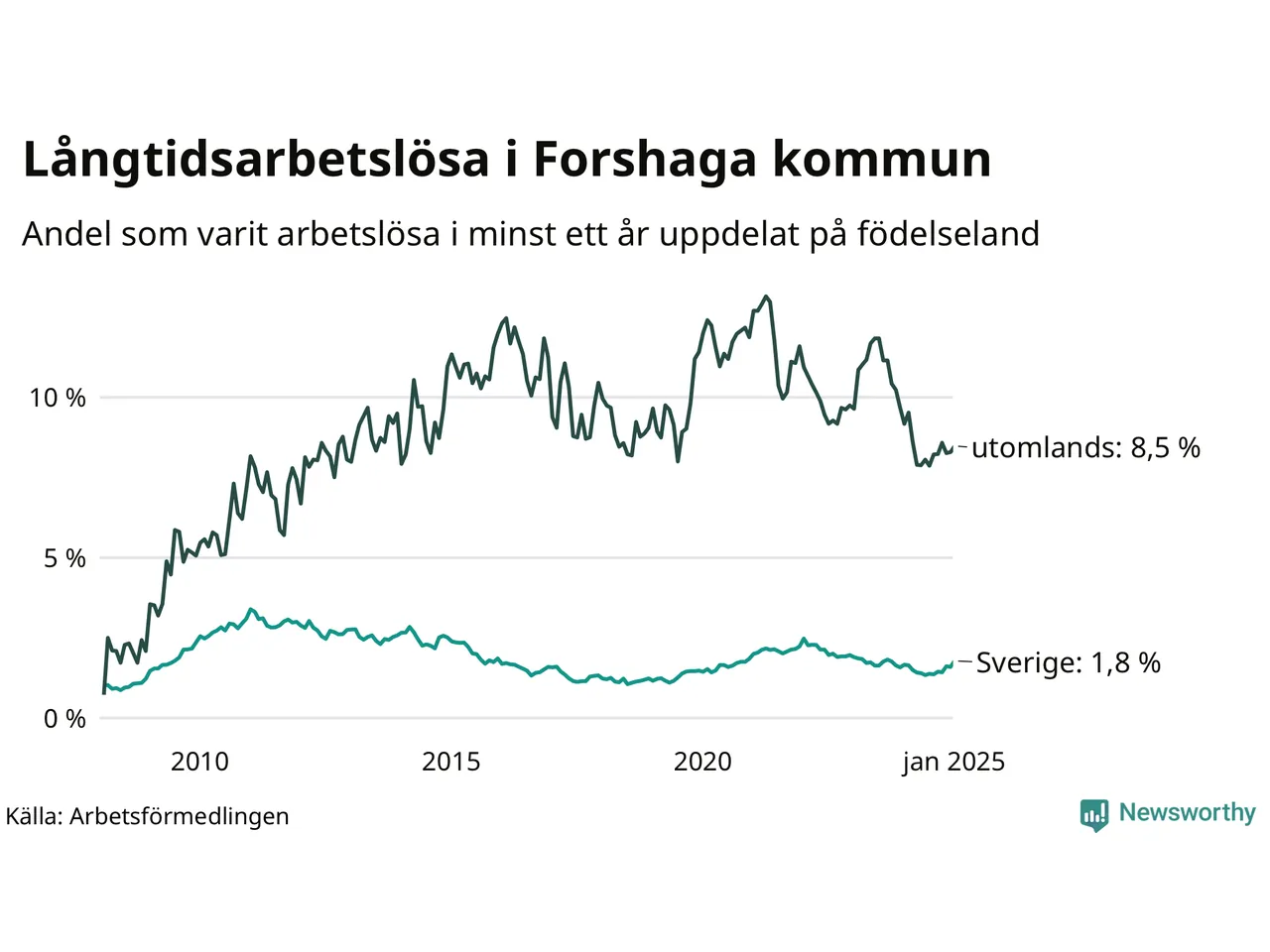 86 av de långtidsarbetslösa i Forshaga är födda i Sverige, medan 48 är födda utomlands. Det innebär att långtidsarbetslösheten bland Sverigefödda är 1,8 procent, medan den är fem gånger så hög – 8,5 procent – bland födda utomlands. Även i riket som helhet är arbetslösheten högre bland utrikesfödda.