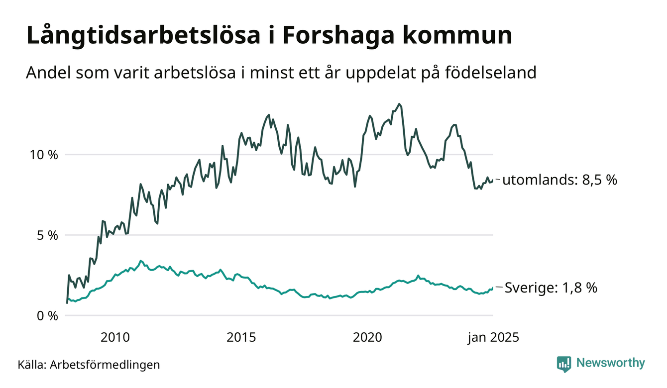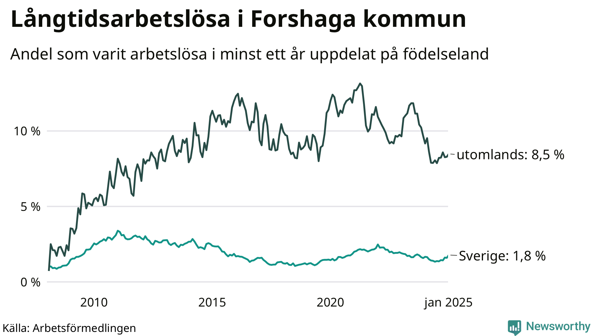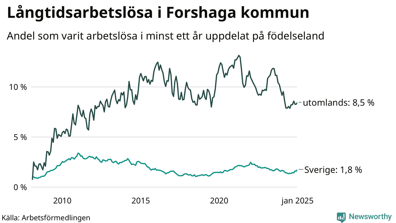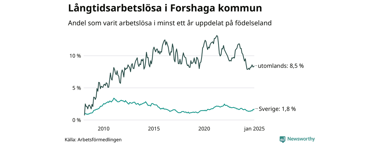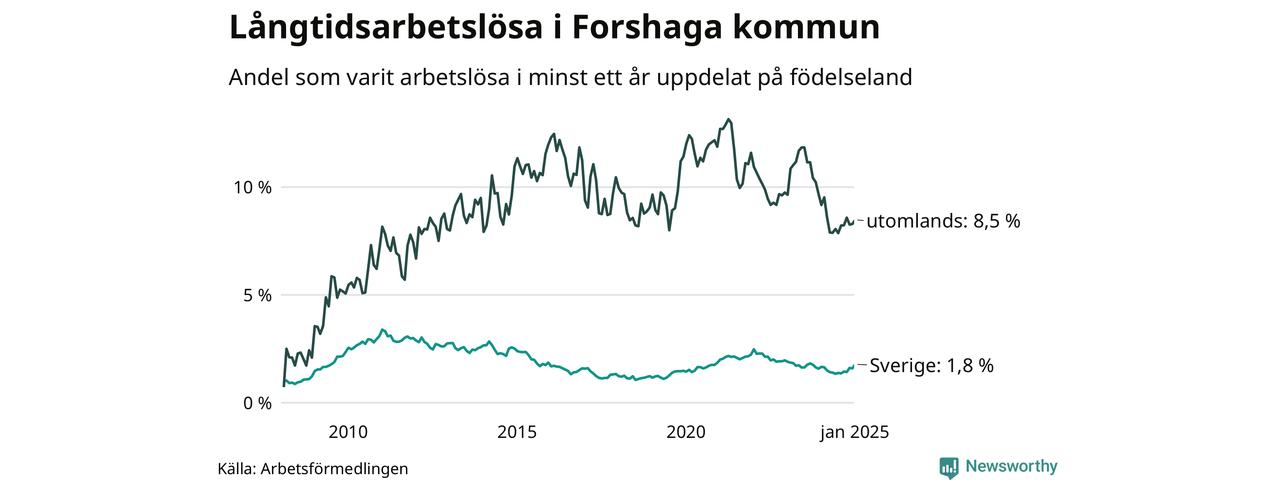 86 av de långtidsarbetslösa i Forshaga är födda i Sverige, medan 48 är födda utomlands. Det innebär att långtidsarbetslösheten bland Sverigefödda är 1,8 procent, medan den är fem gånger så hög – 8,5 procent – bland födda utomlands. Även i riket som helhet är arbetslösheten högre bland utrikesfödda.