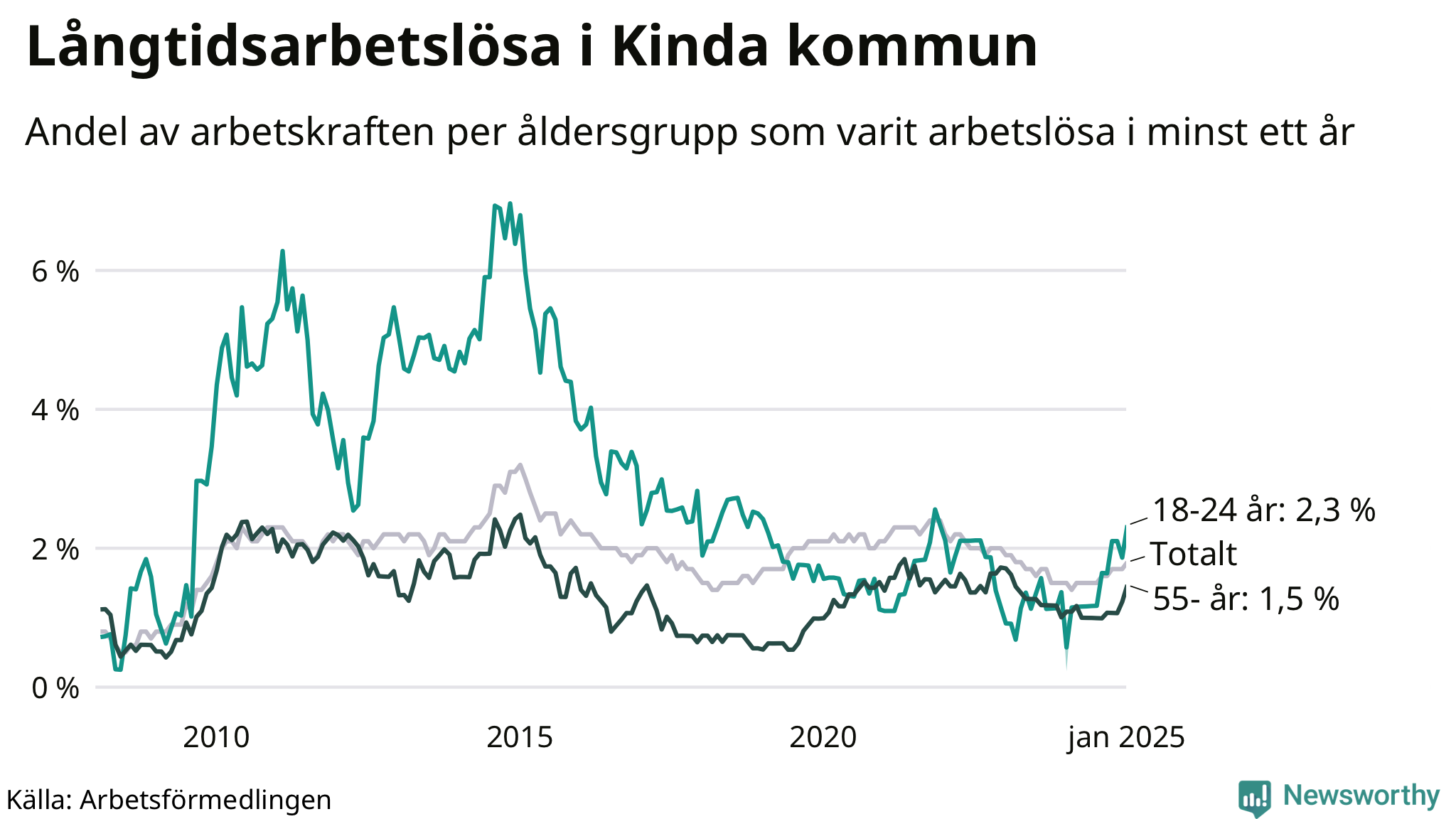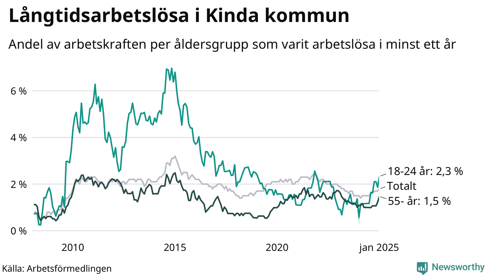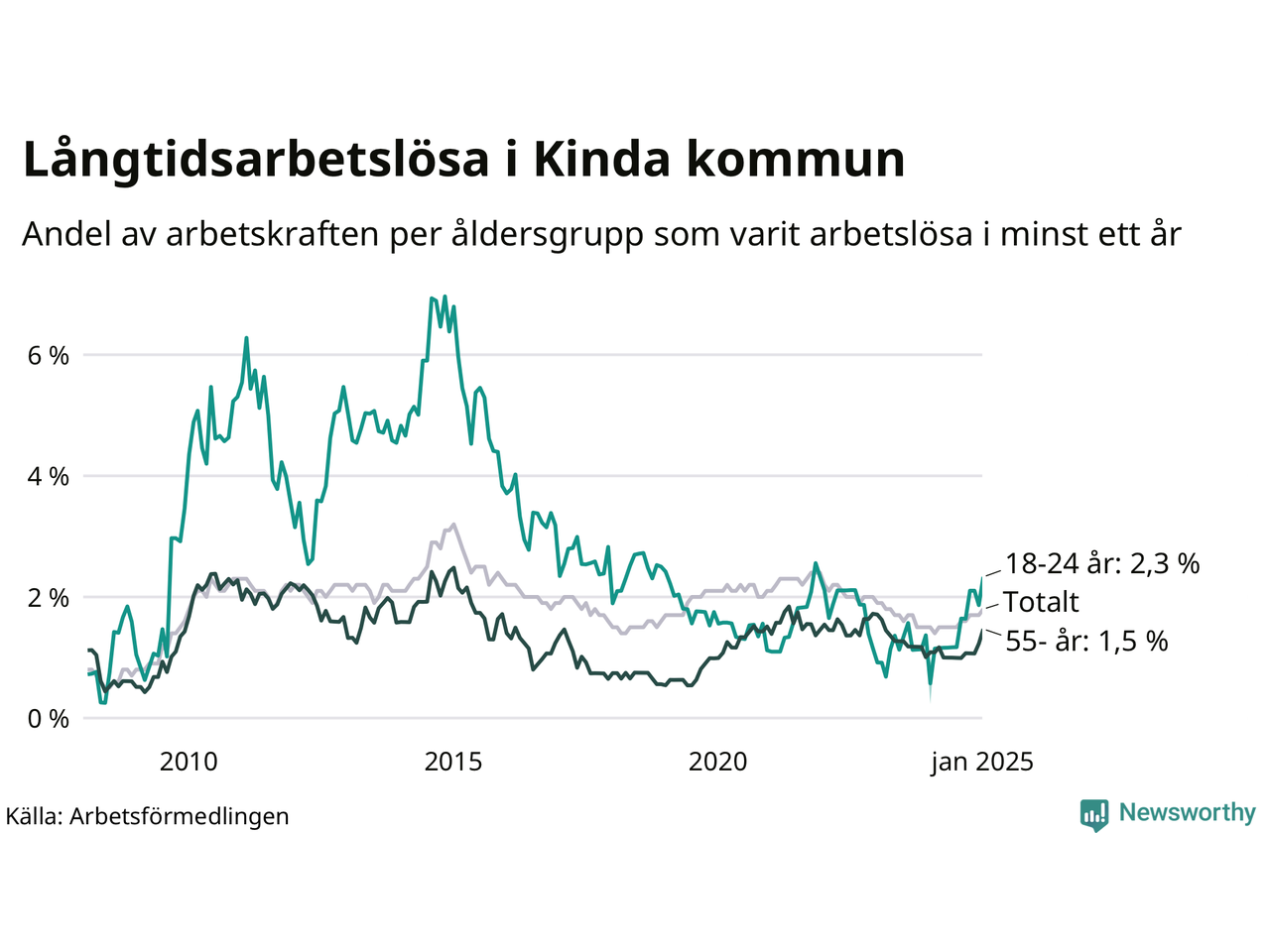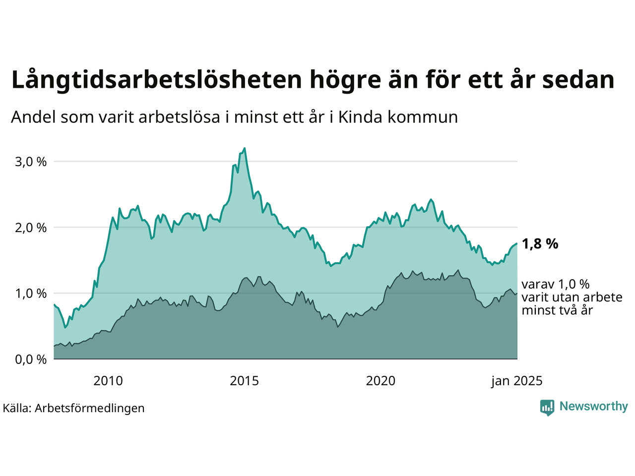 | Andel arbetslösa i minst två år | 1,0 % | 1,8 % | 1,5 % |