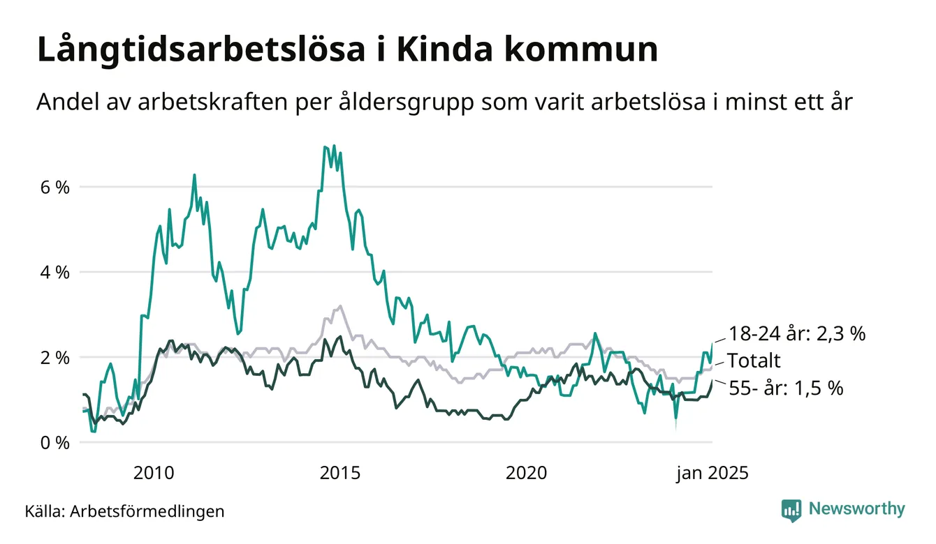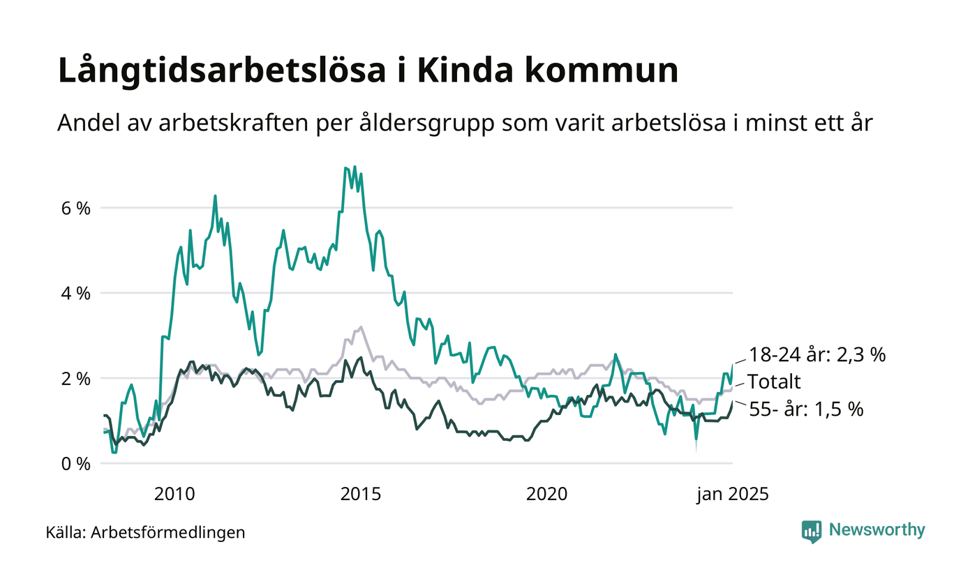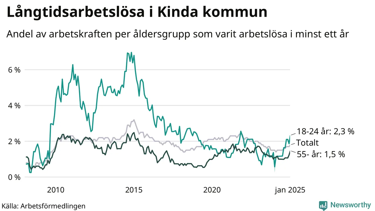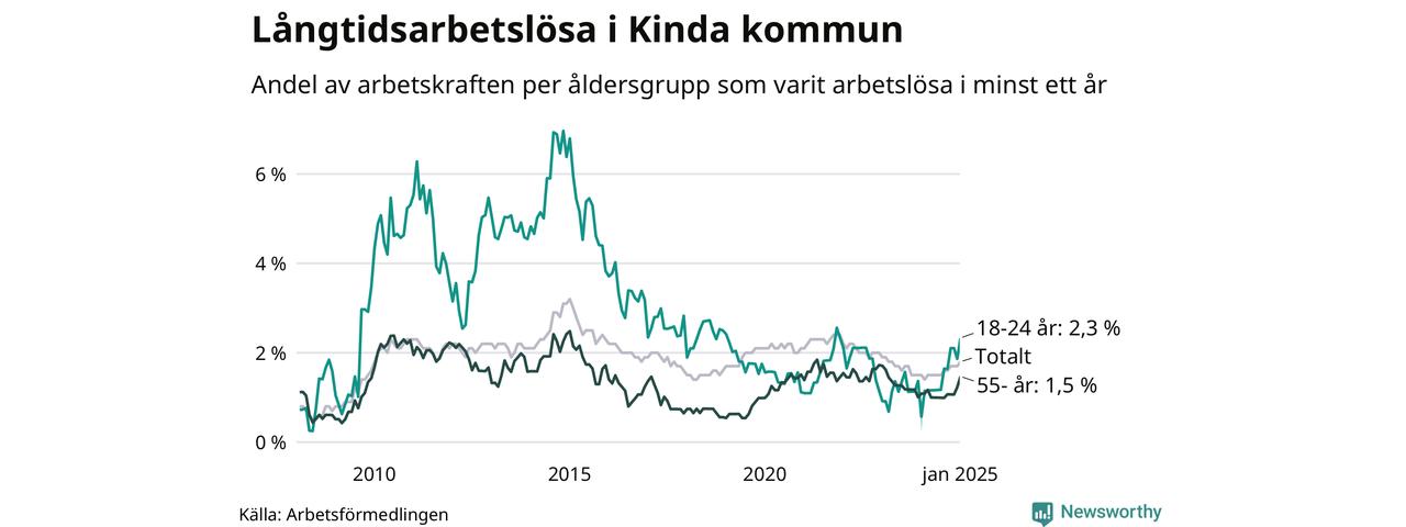 Av de 81 personerna som varit arbetslösa i mer än ett år i Kinda kommun är 18 personer mellan 55 och 651 år och tio är mellan 18 och 24 år.