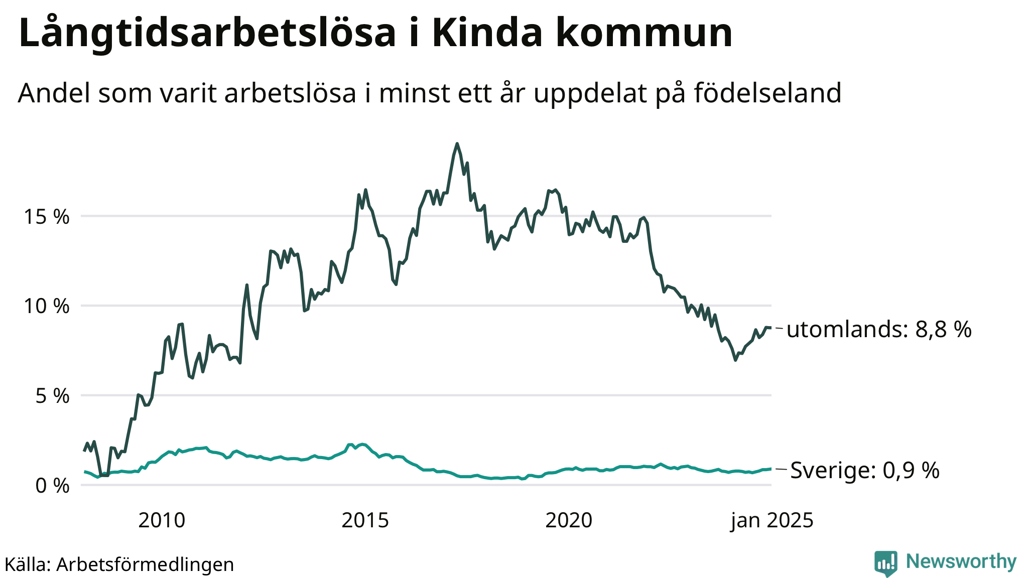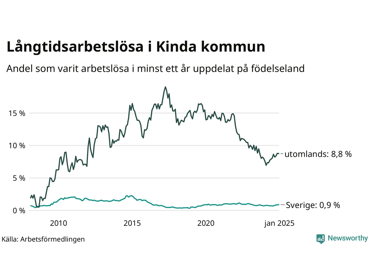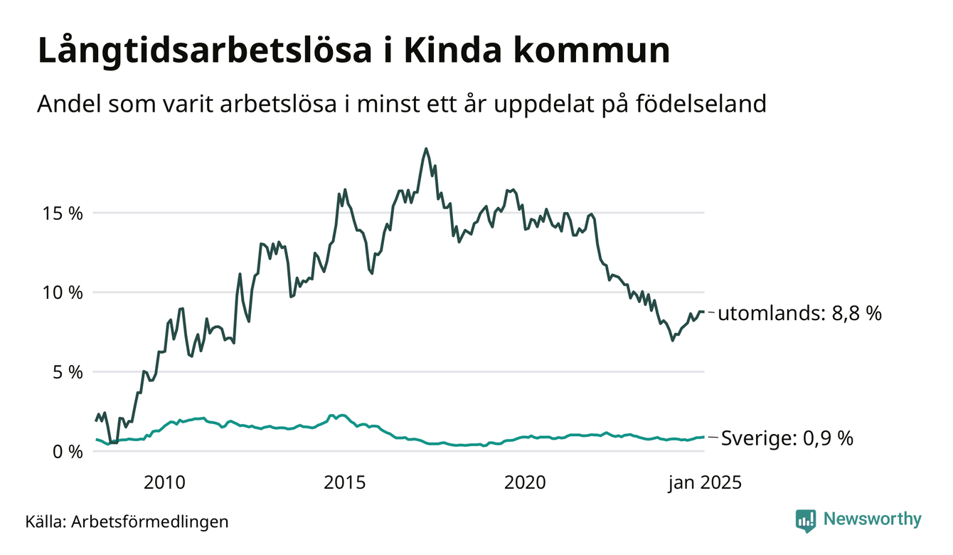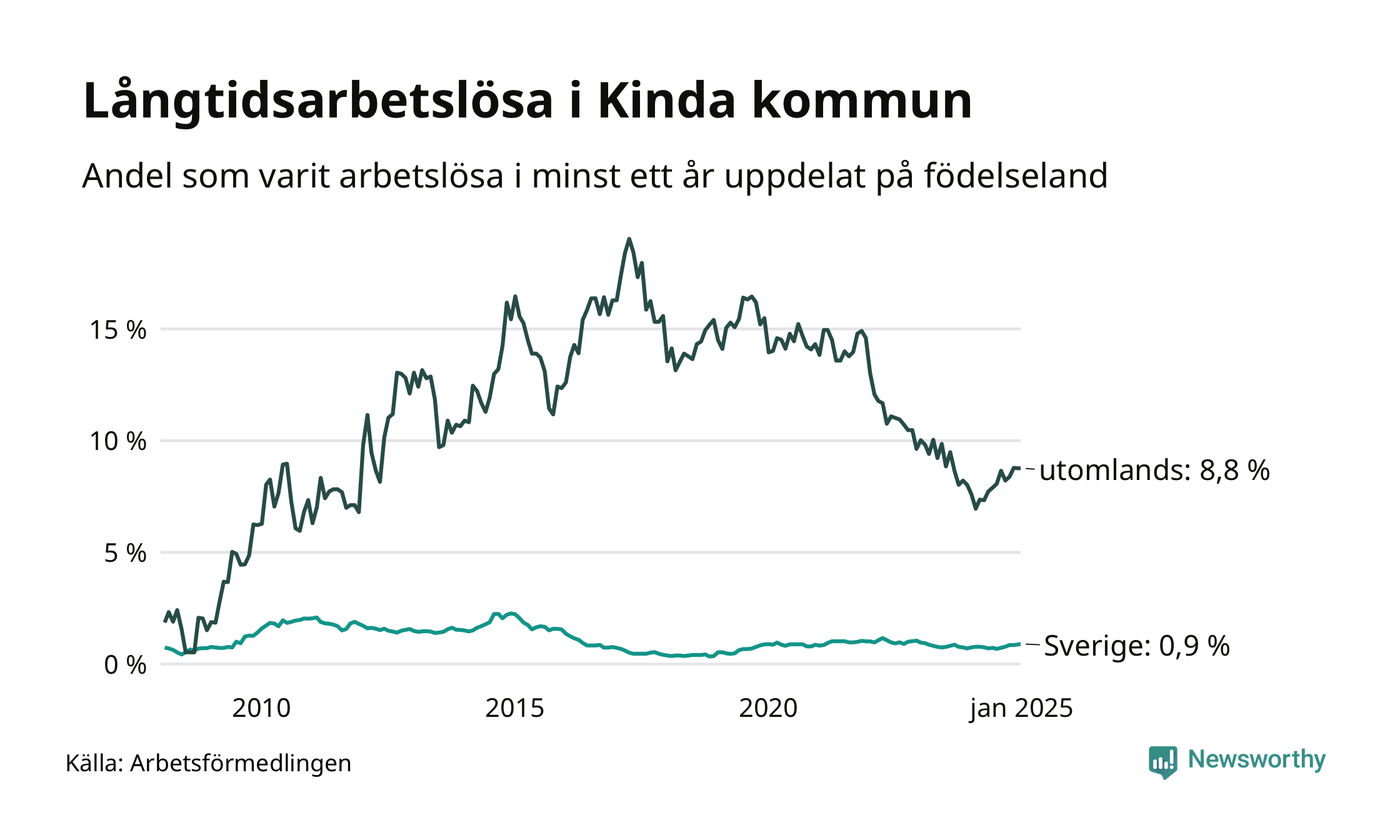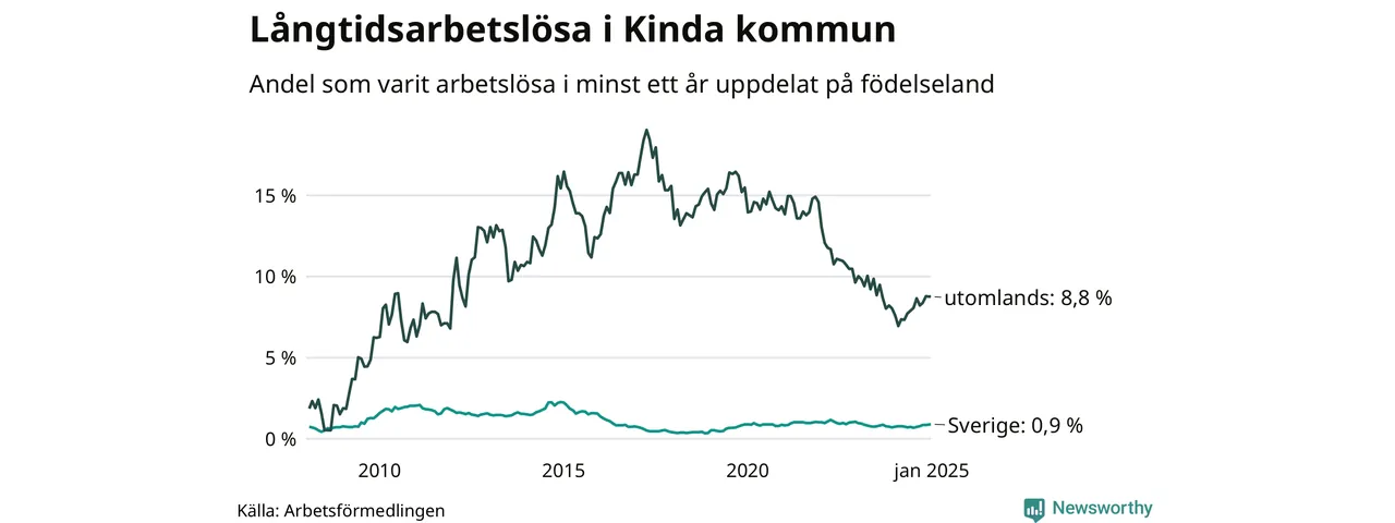 37 av de långtidsarbetslösa i Kinda är födda i Sverige, medan 44 är födda utomlands. Det innebär att långtidsarbetslösheten bland Sverigefödda är 0,9 procent, medan den är tio gånger så hög – 8,8 procent – bland födda utomlands. Även i riket som helhet är arbetslösheten högre bland utrikesfödda.