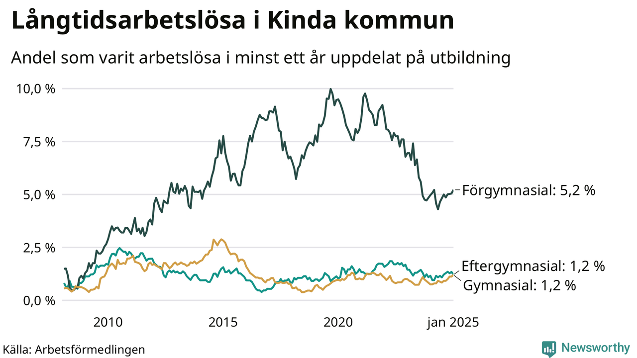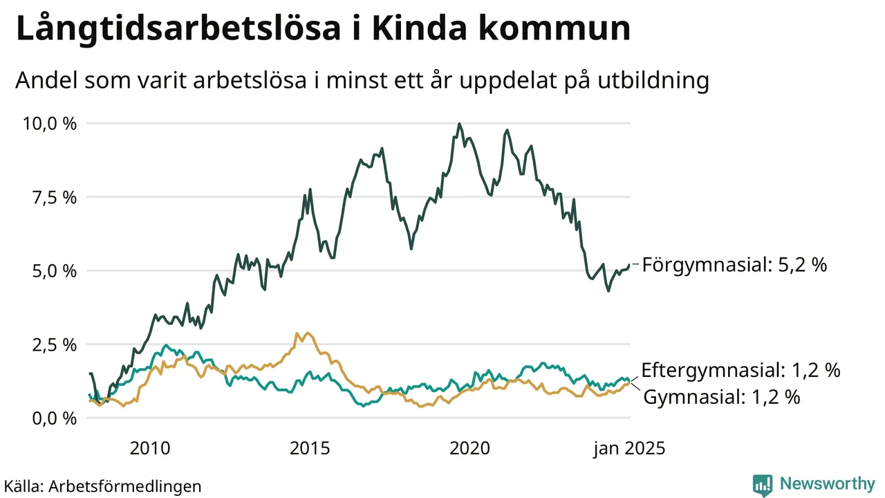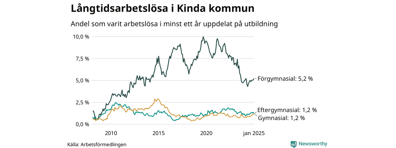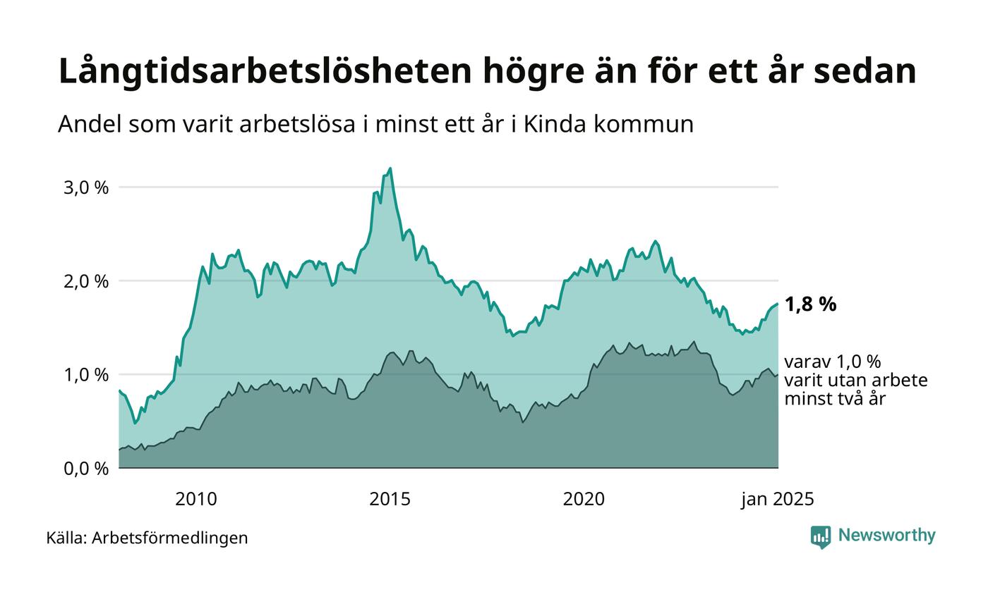 Andelen långtidsarbetslösa i Kinda är den näst lägsta i Östergötlands län, bara i Ydre är andelen lägre (1,3 procent). I Norrköping finns länets högsta långtidsarbetslöshet, 4,6 procent. I Östergötland som helhet hade 7 639 personer (3,3 procent) varit arbetslösa i minst ett år i januari. Det är 55 personer fler än månaden innan, och det är den åttonde månaden i rad som antalet sjunkit.
