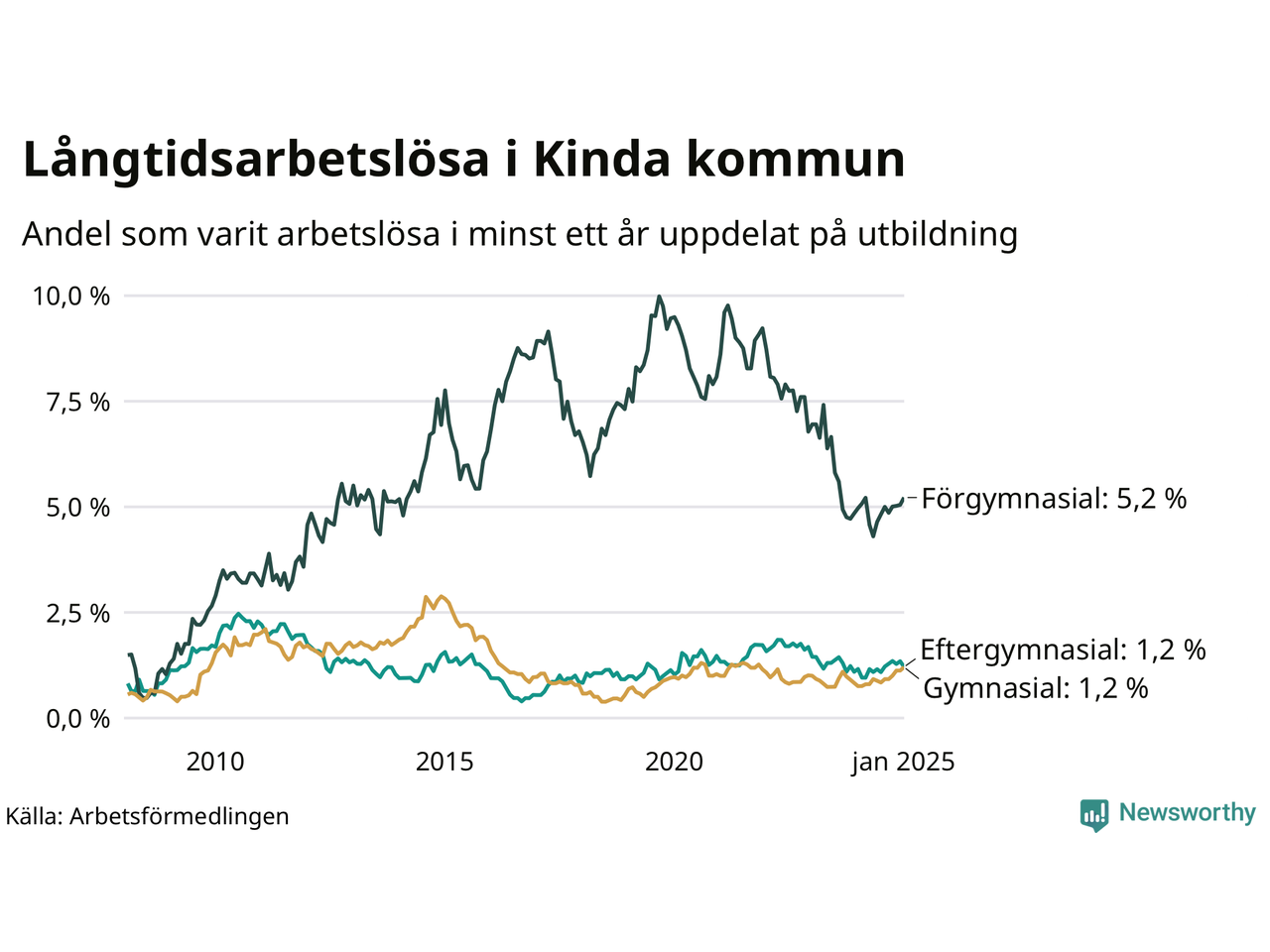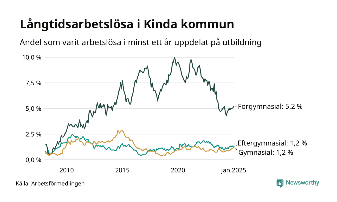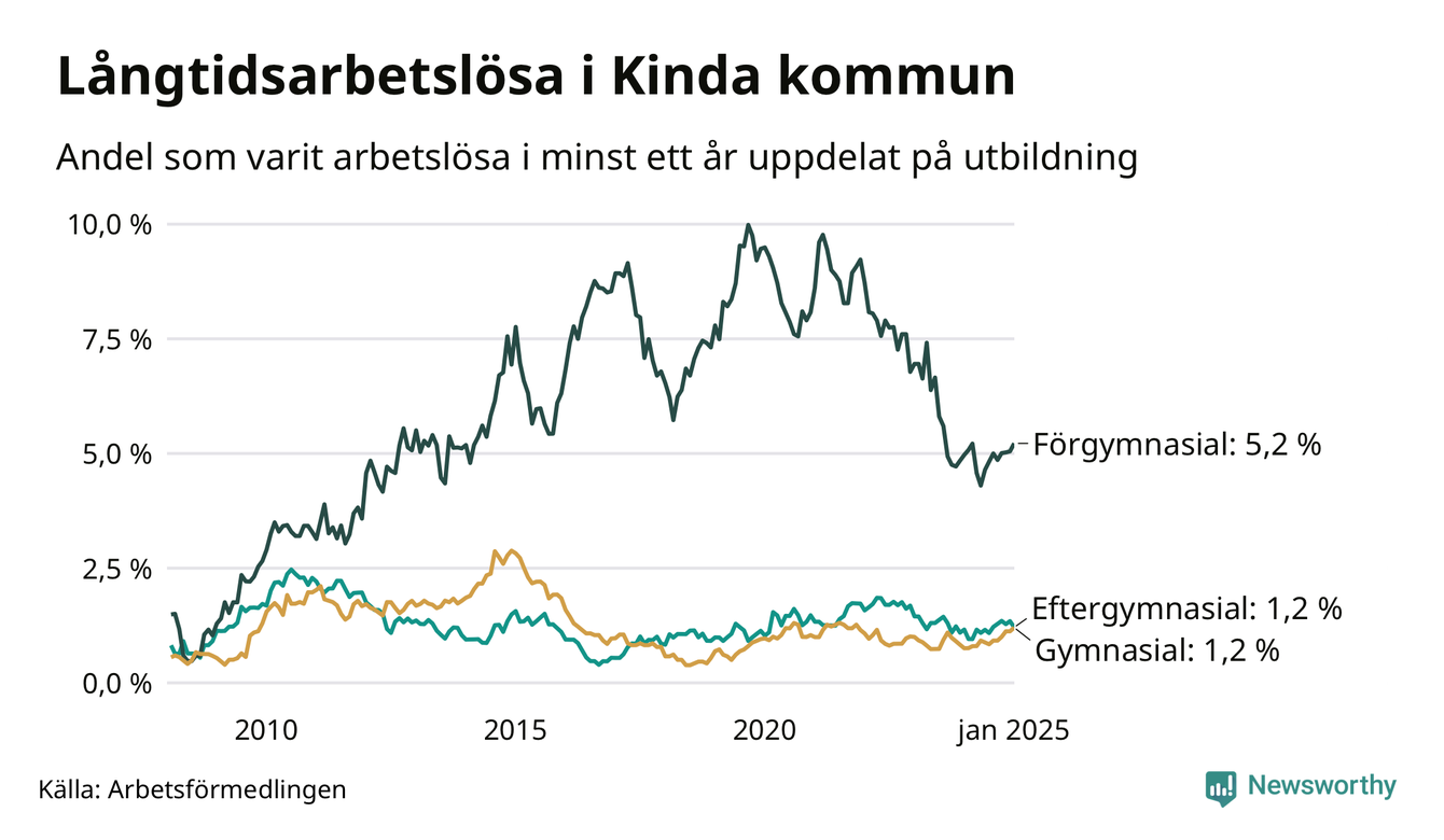 Andelen långtidsarbetslösa i Kinda är den näst lägsta i Östergötlands län, bara i Ydre är andelen lägre (1,3 procent). I Norrköping finns länets högsta långtidsarbetslöshet, 4,6 procent. I Östergötland som helhet hade 7 639 personer (3,3 procent) varit arbetslösa i minst ett år i januari. Det är 55 personer fler än månaden innan, och det är den åttonde månaden i rad som antalet sjunkit.