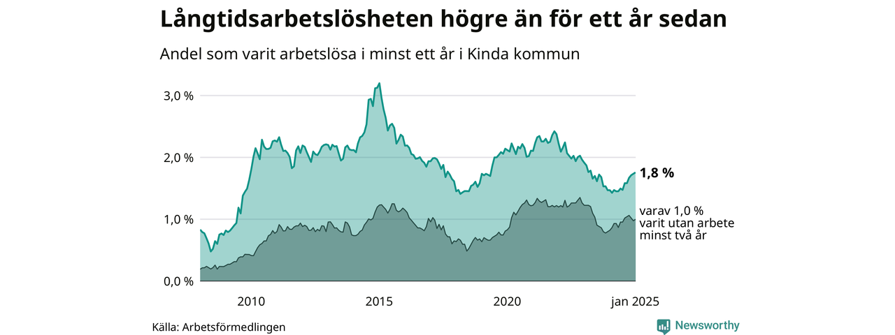 Antalet långtidsarbetslösa ökade i Kinda i januari jämfört med månaden innan. Därmed har antalet långtidsarbetslösa ökat varje månad sedan i juli 2024.