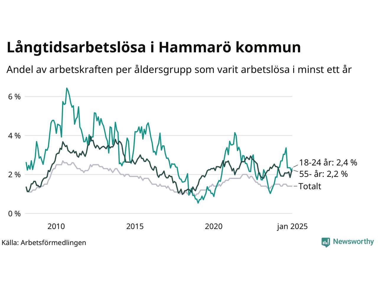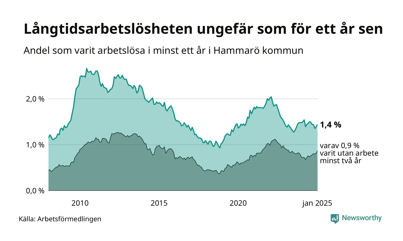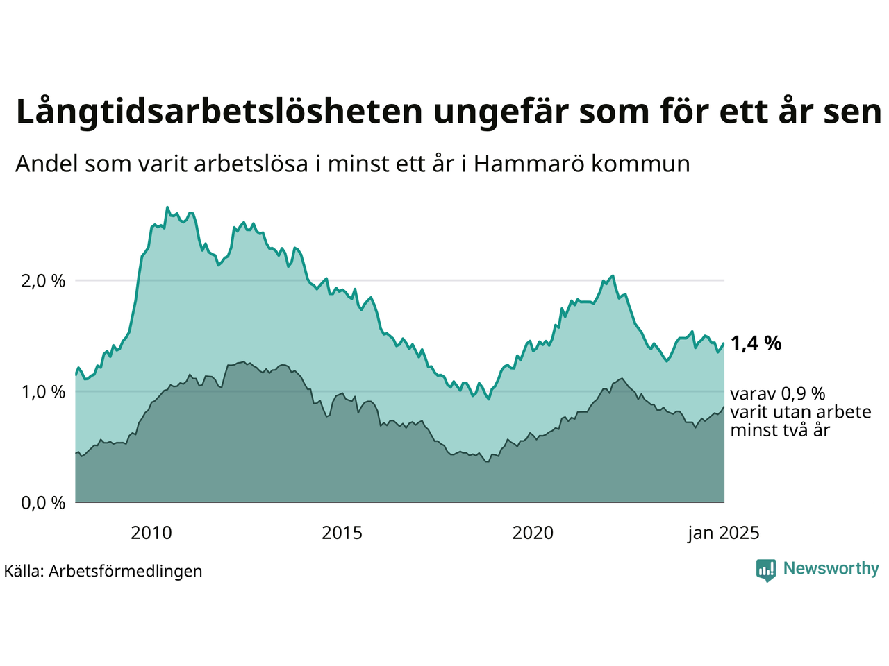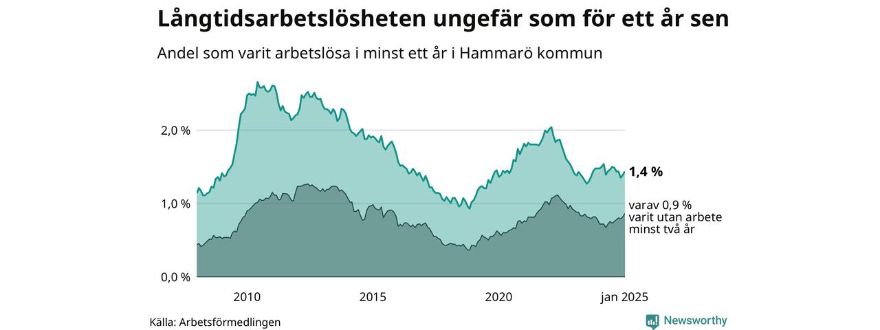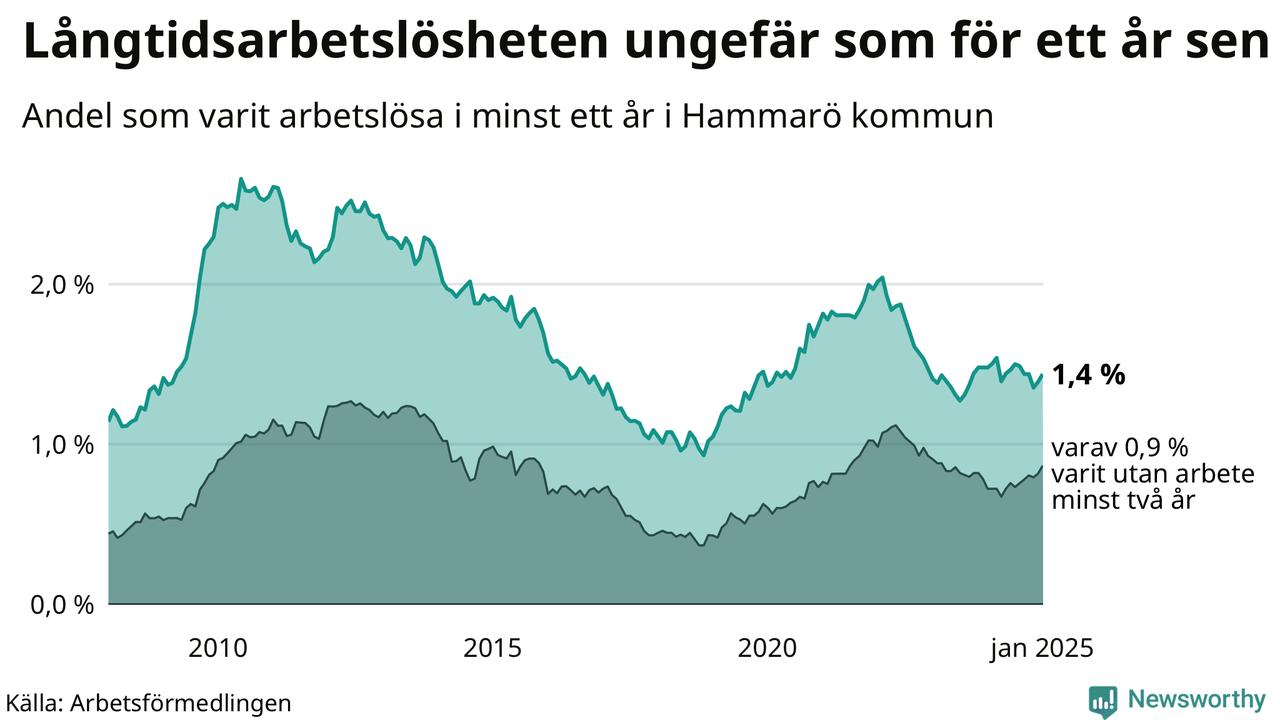 I januari hade 118 Hammaröbor varit arbetslösa i minst ett år, vilket är fyra fler än månaden innan. 118 personer motsvarar 1,4 procent av arbetskraften i kommunen – andelen långtidsarbetslösa är ungefär på samma nivå som för ett år sedan.