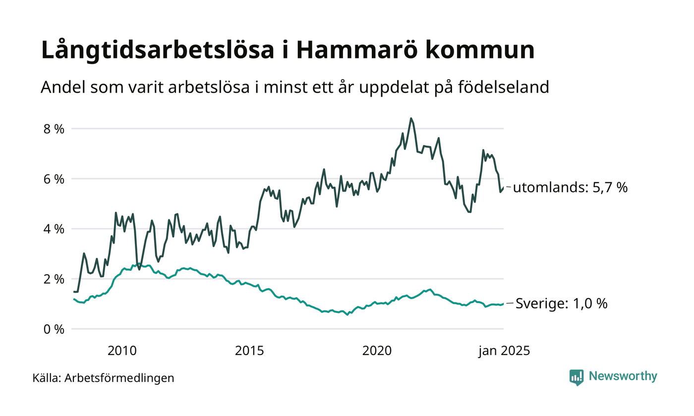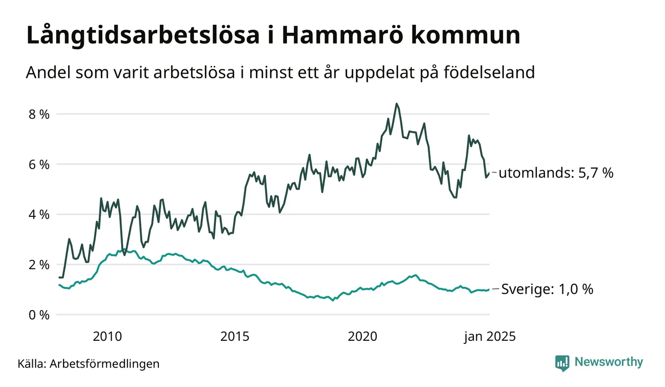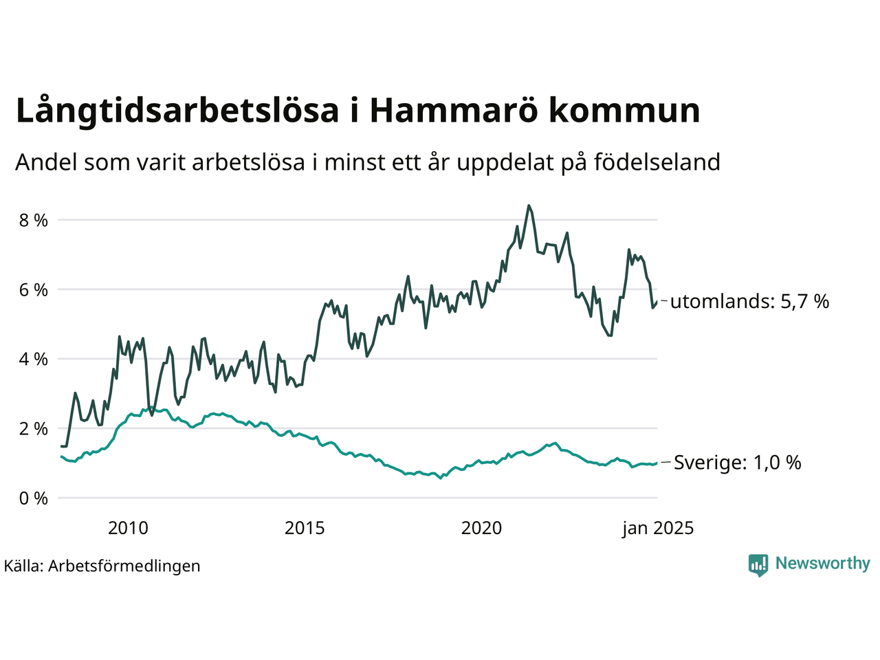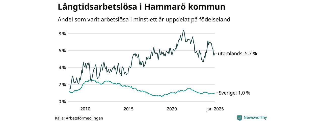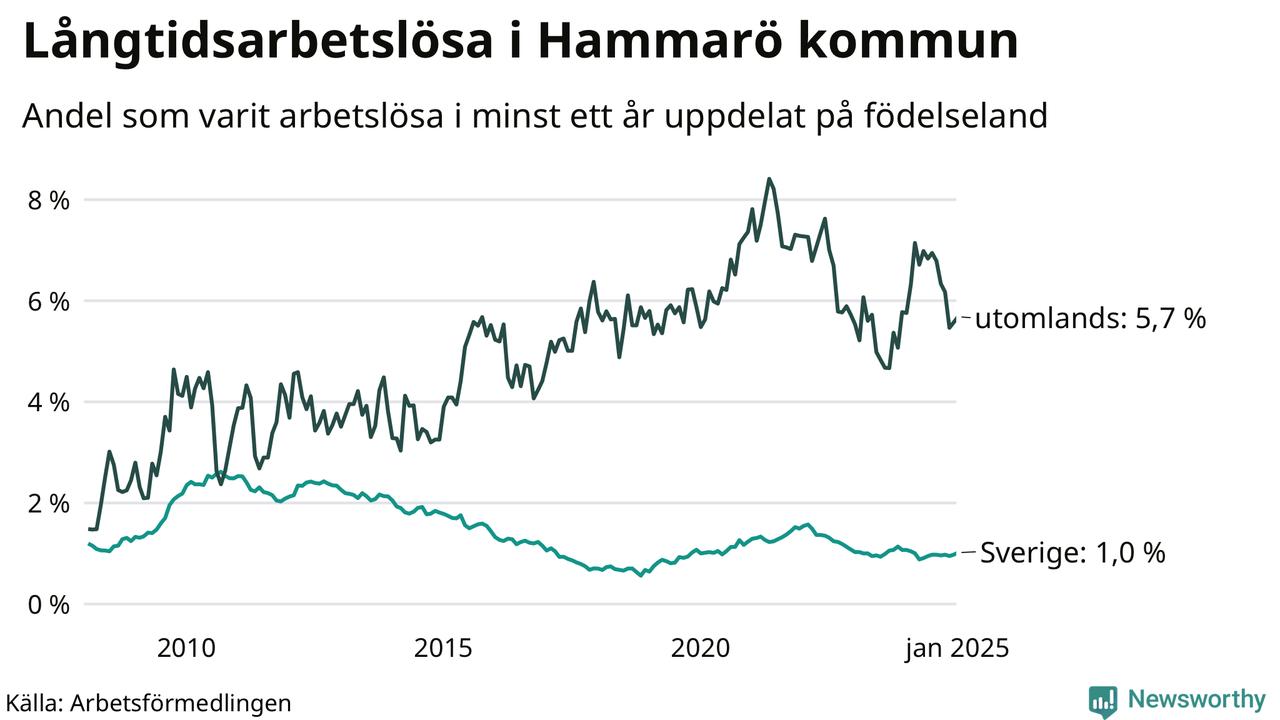 I januari hade 118 Hammaröbor varit arbetslösa i minst ett år, vilket är fyra fler än månaden innan. 118 personer motsvarar 1,4 procent av arbetskraften i kommunen – andelen långtidsarbetslösa är ungefär på samma nivå som för ett år sedan.