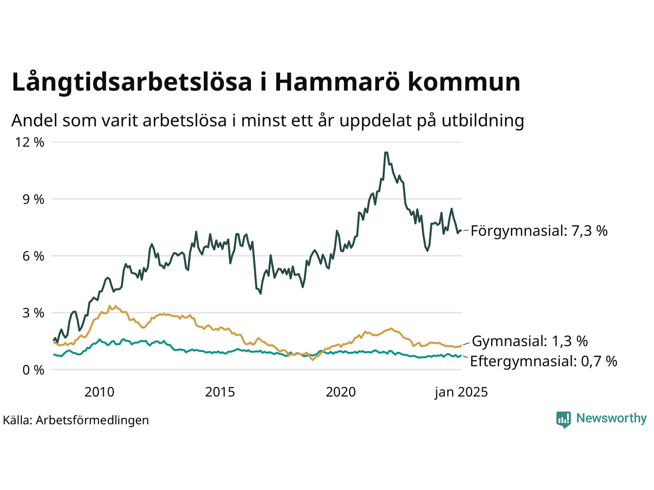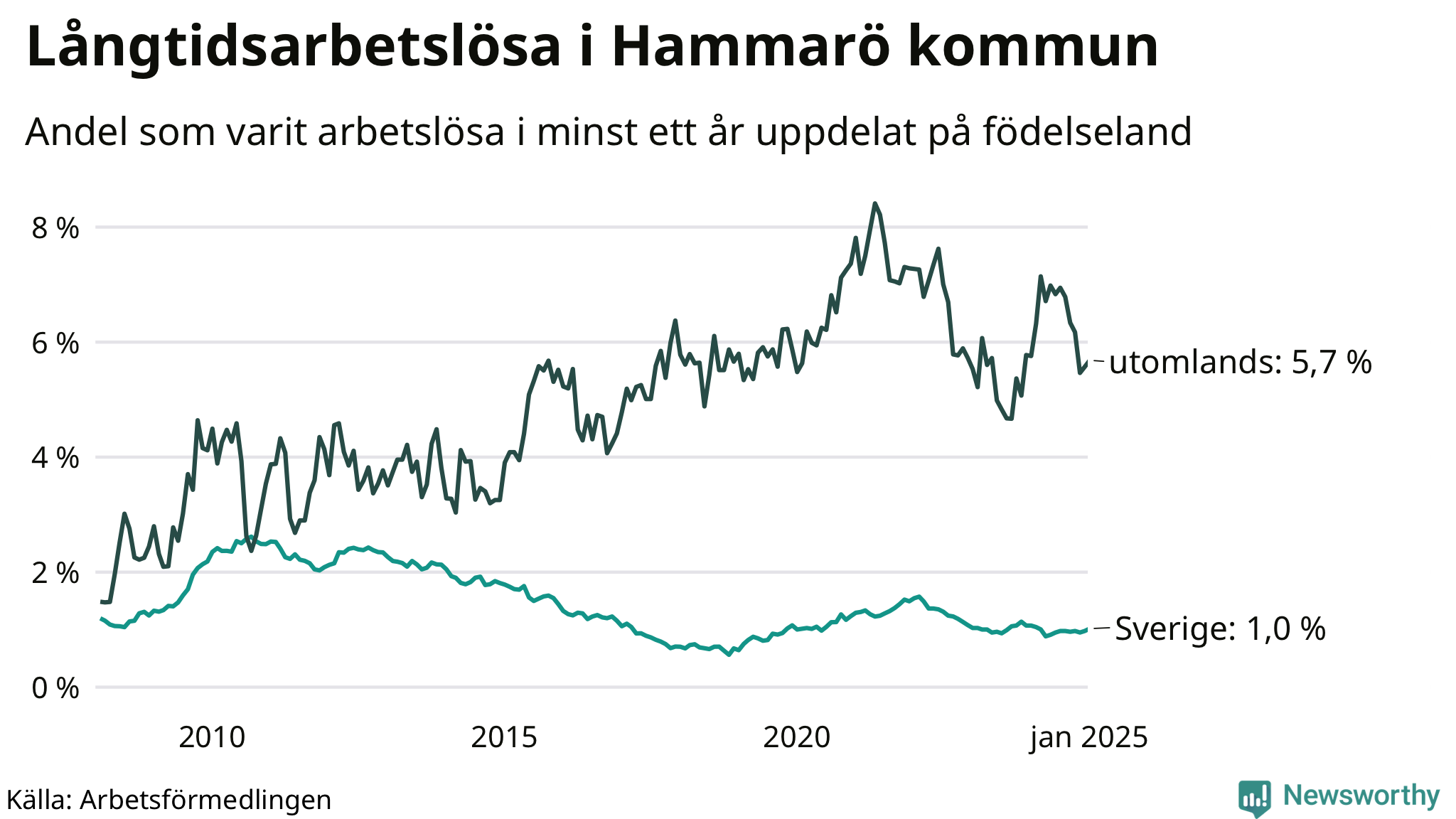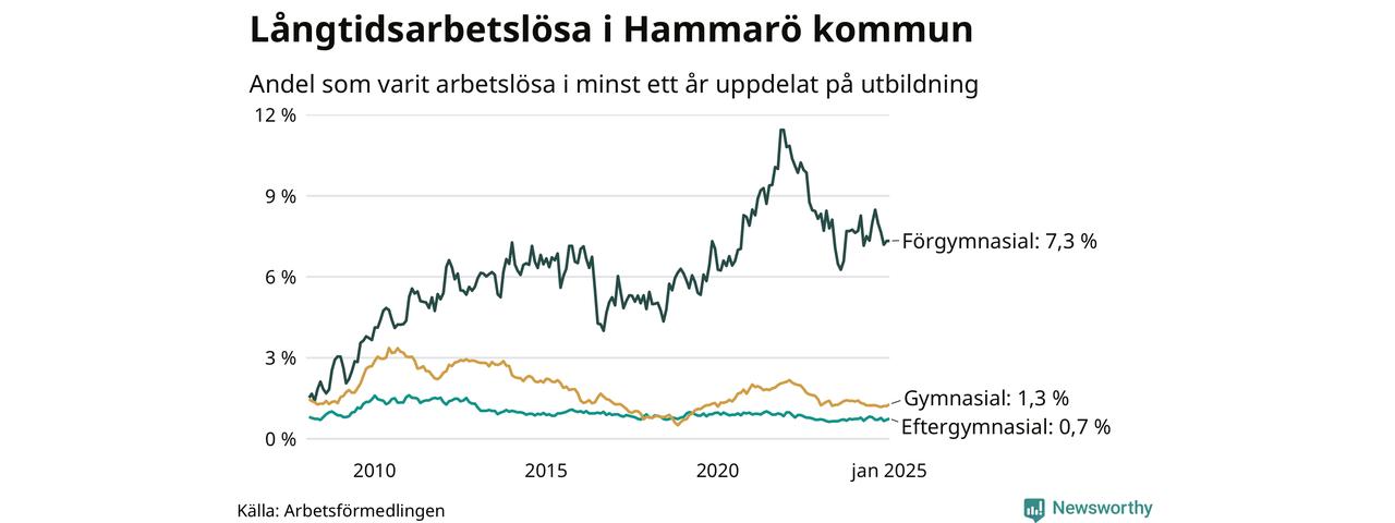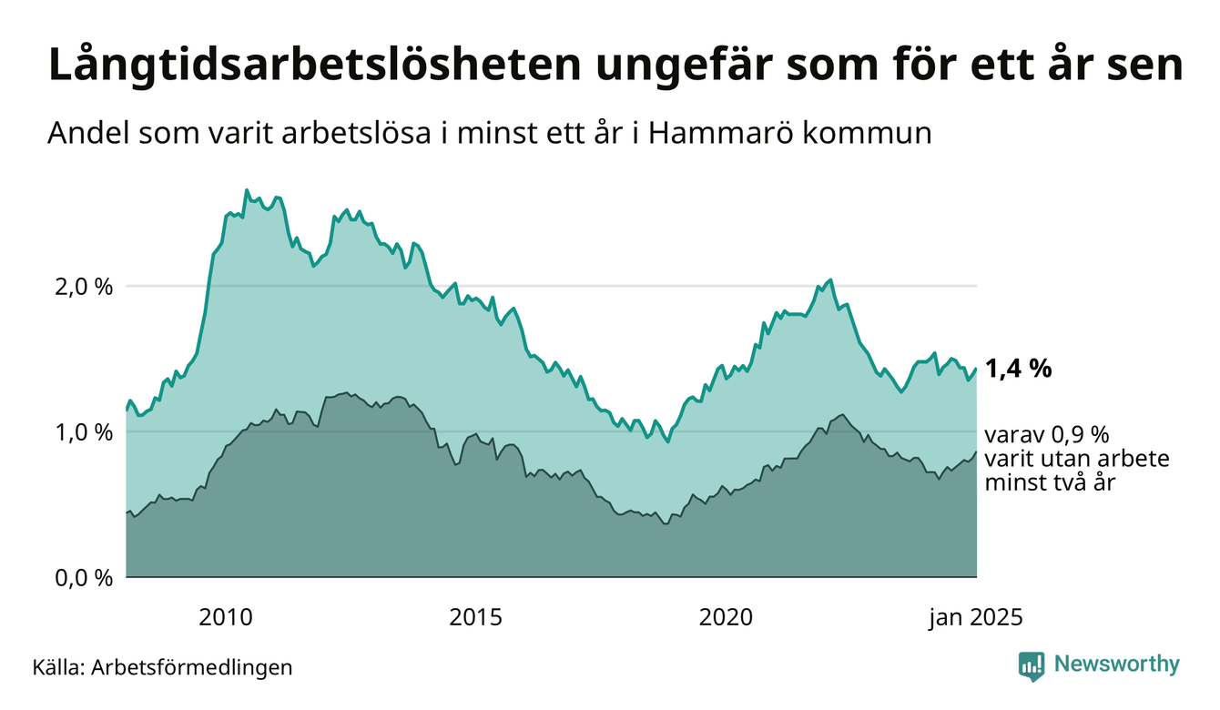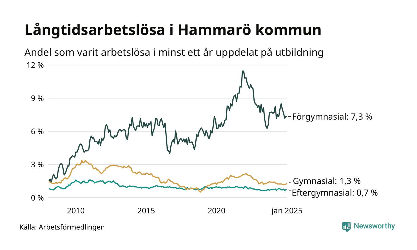 I januari hade 118 Hammaröbor varit arbetslösa i minst ett år, vilket är fyra fler än månaden innan. 118 personer motsvarar 1,4 procent av arbetskraften i kommunen – andelen långtidsarbetslösa är ungefär på samma nivå som för ett år sedan.