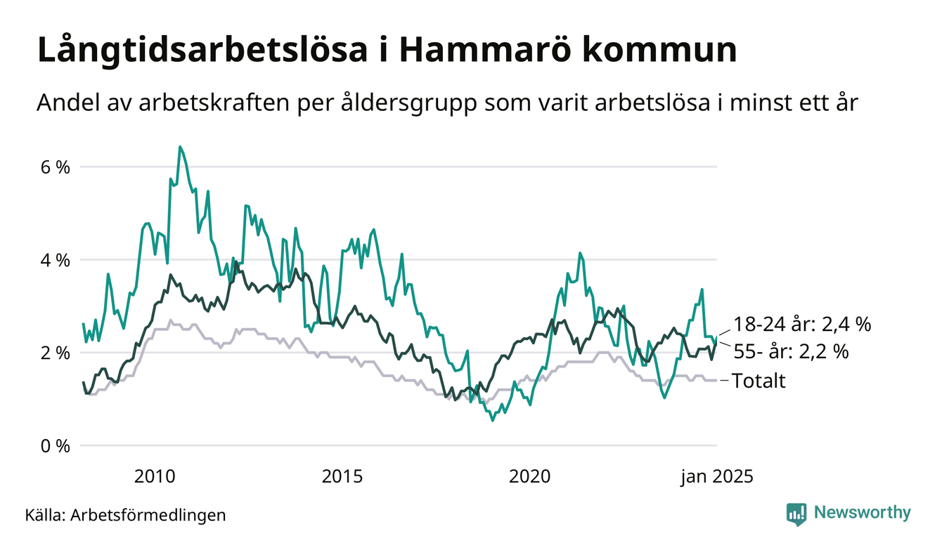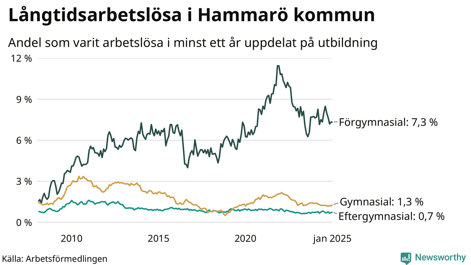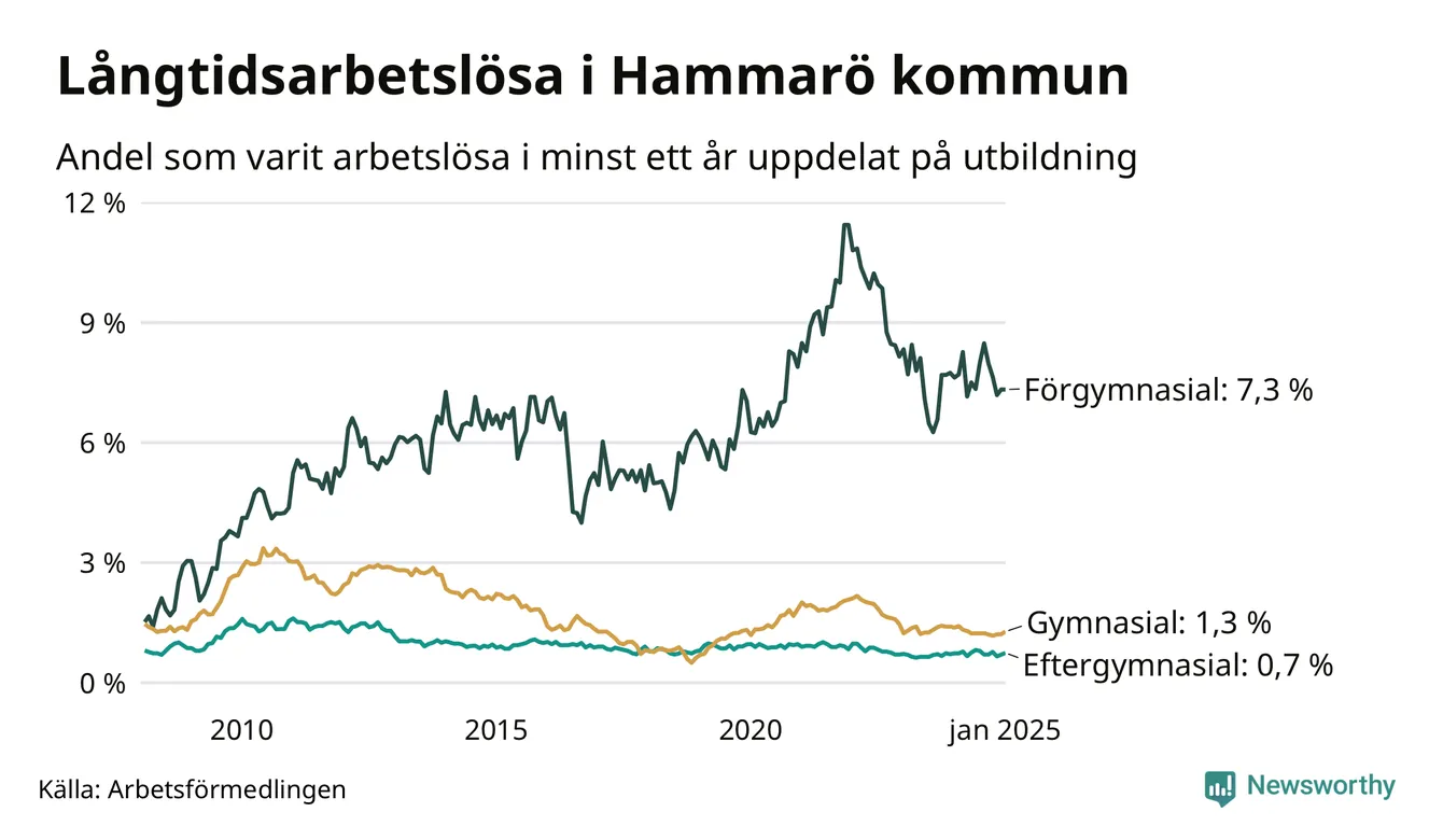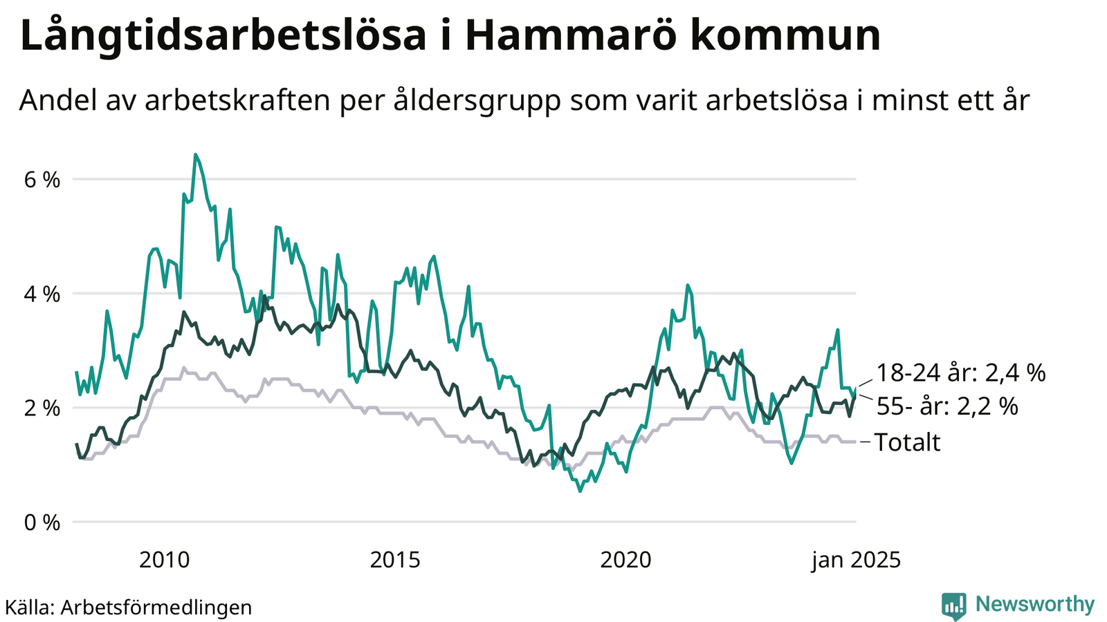 I januari hade 118 Hammaröbor varit arbetslösa i minst ett år, vilket är fyra fler än månaden innan. 118 personer motsvarar 1,4 procent av arbetskraften i kommunen – andelen långtidsarbetslösa är ungefär på samma nivå som för ett år sedan.