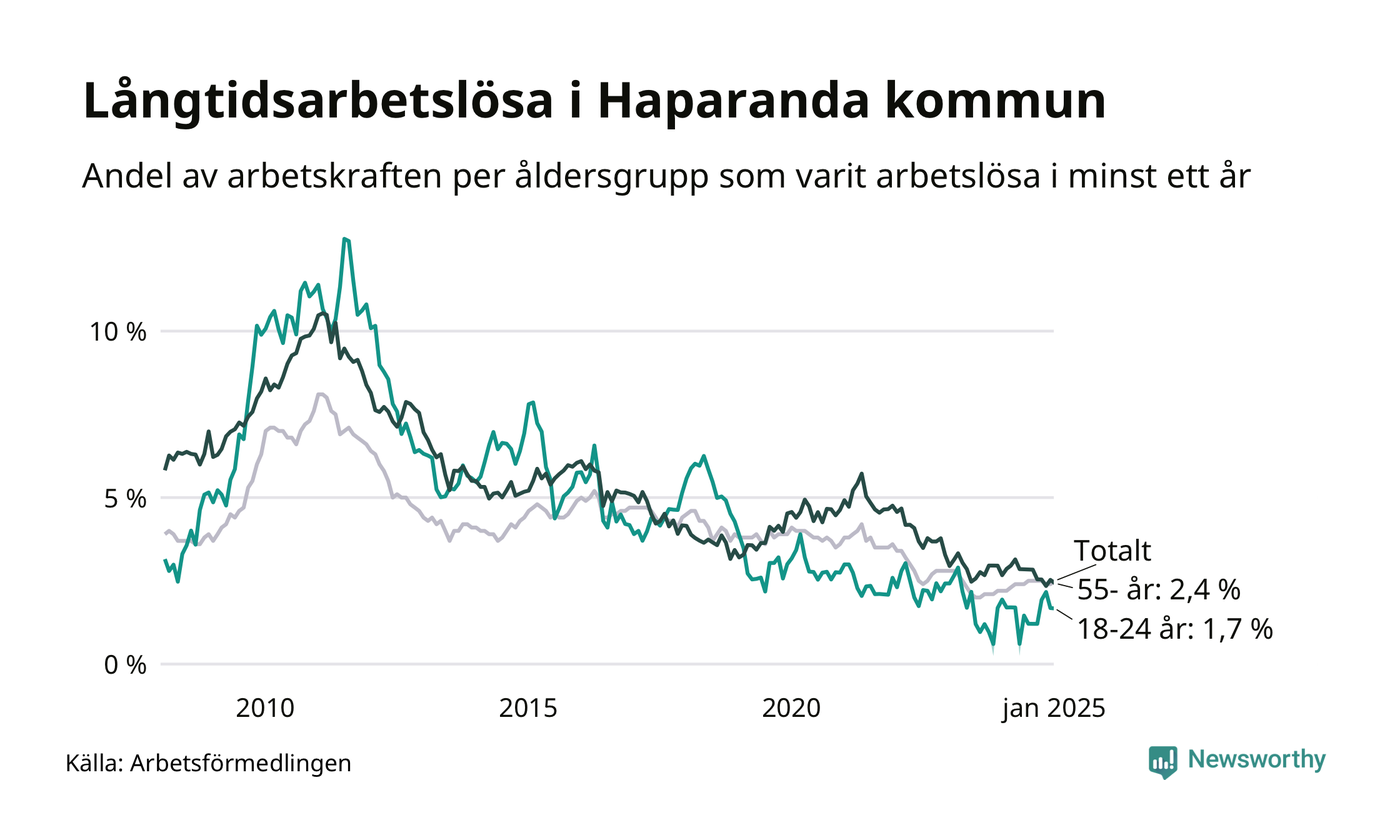 Av de 94 personerna som varit arbetslösa i mer än ett år i Haparanda kommun är 26 personer mellan 55 och 651 år och sju är mellan 18 och 24 år. Som andel av arbetskraften innebär det att långtidsarbetslöheten är lägre i de båda grupperna än i arbetskraften totalt. I riket som helhet är andelen långtidsarbetslösa högre i den äldre gruppen.