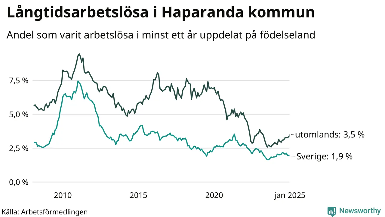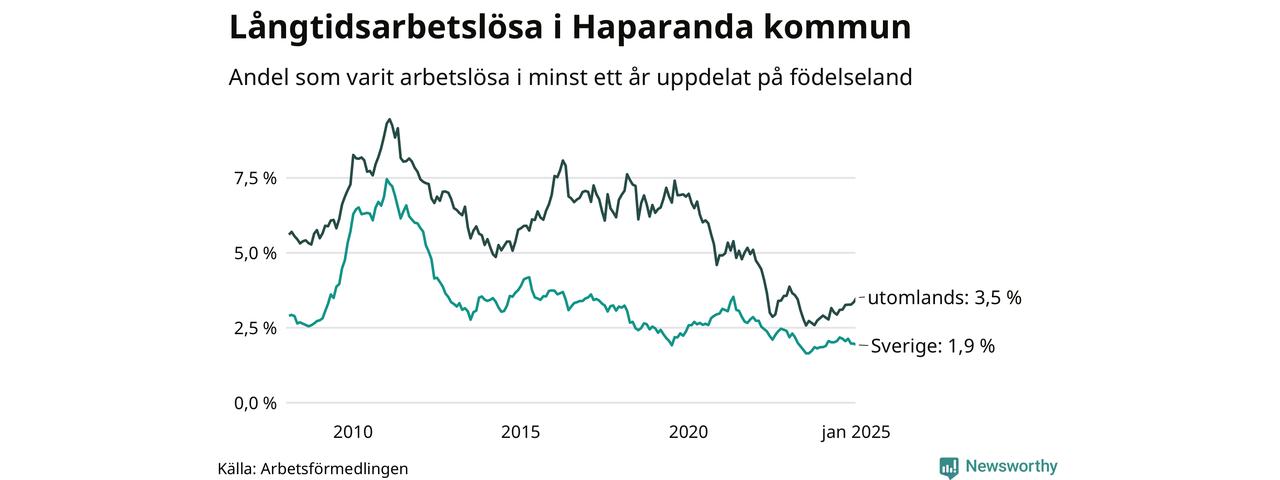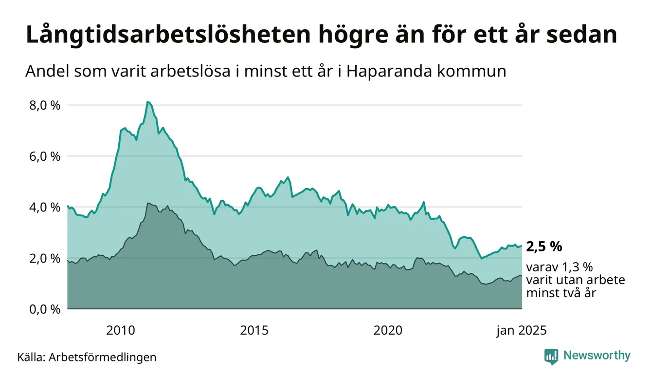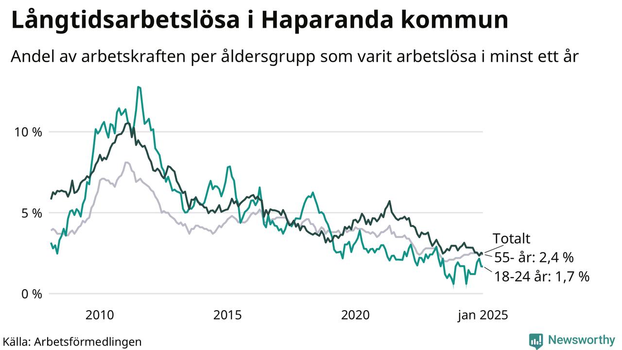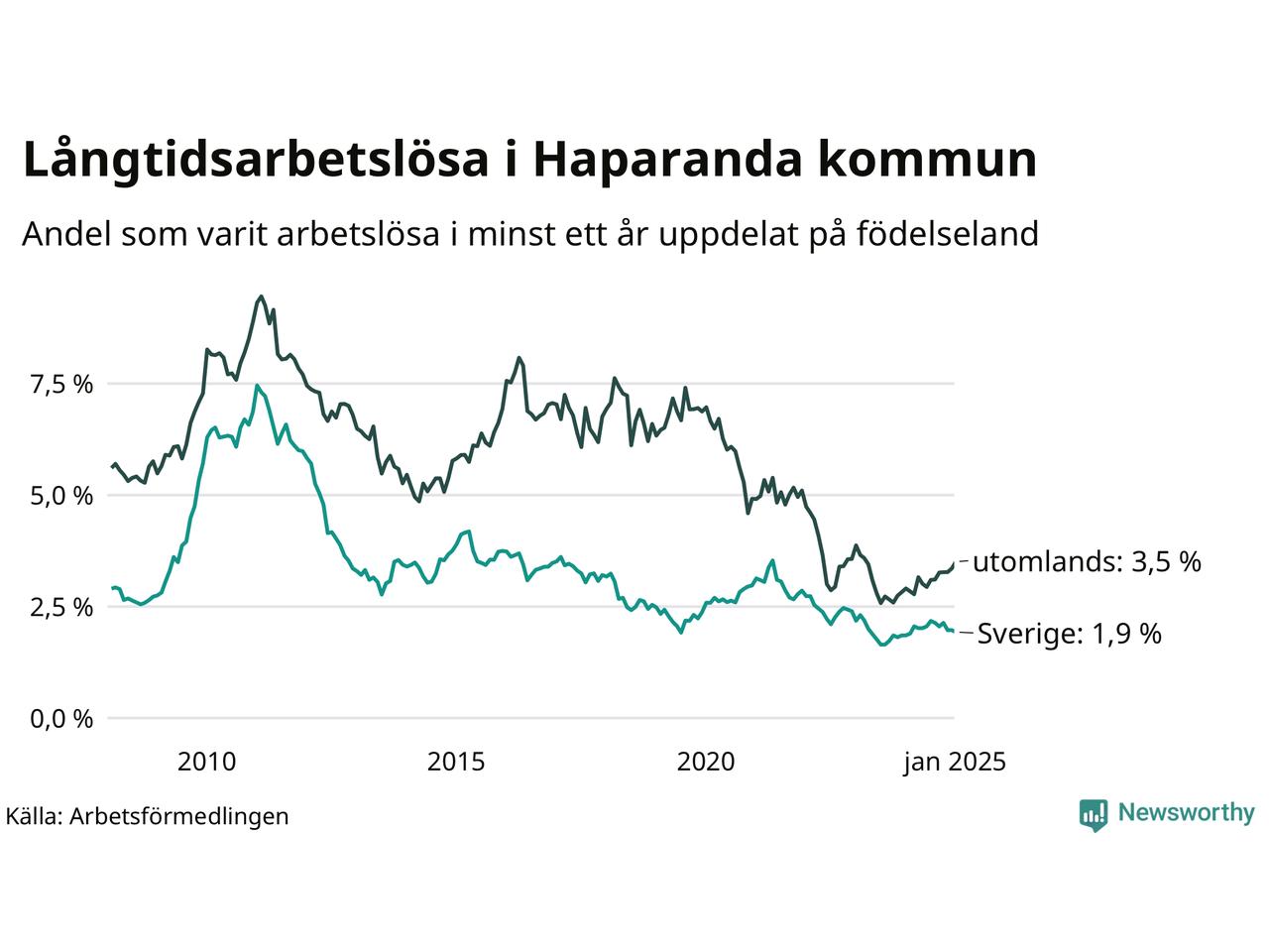 Andelen långtidsarbetslösa i Haparanda är den näst högsta i Norrbottens län, bara i Överkalix är andelen högre 2,6 procent.I Kiruna och Arjeplog finns länets lägsta långtidsarbetslöshet, 0,7 procent. I Norrbotten som helhet hade 1 791 personer (1,5 procent) varit arbetslösa i minst ett år i januari. Det är 13 personer fler än månaden innan.