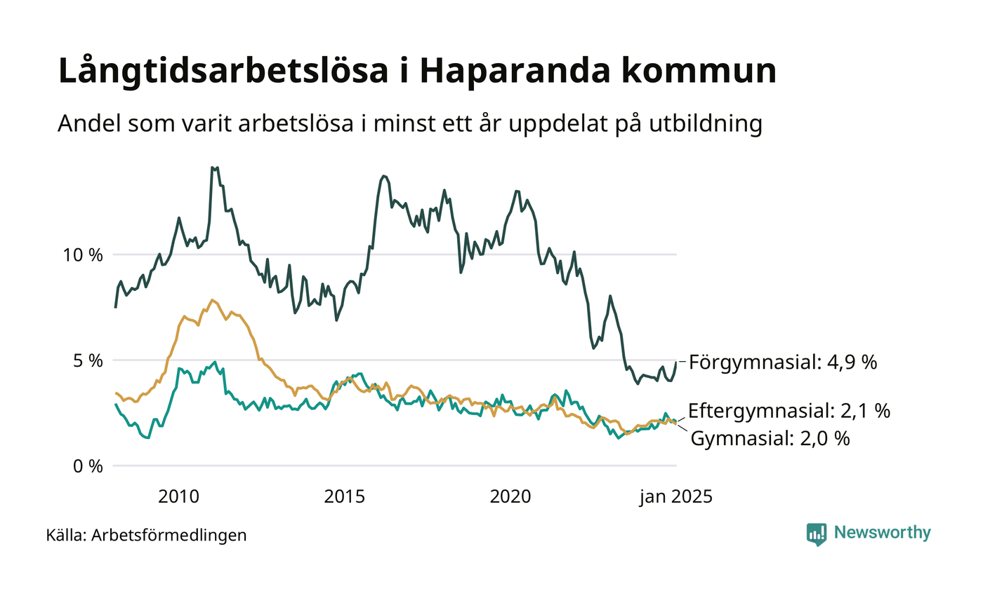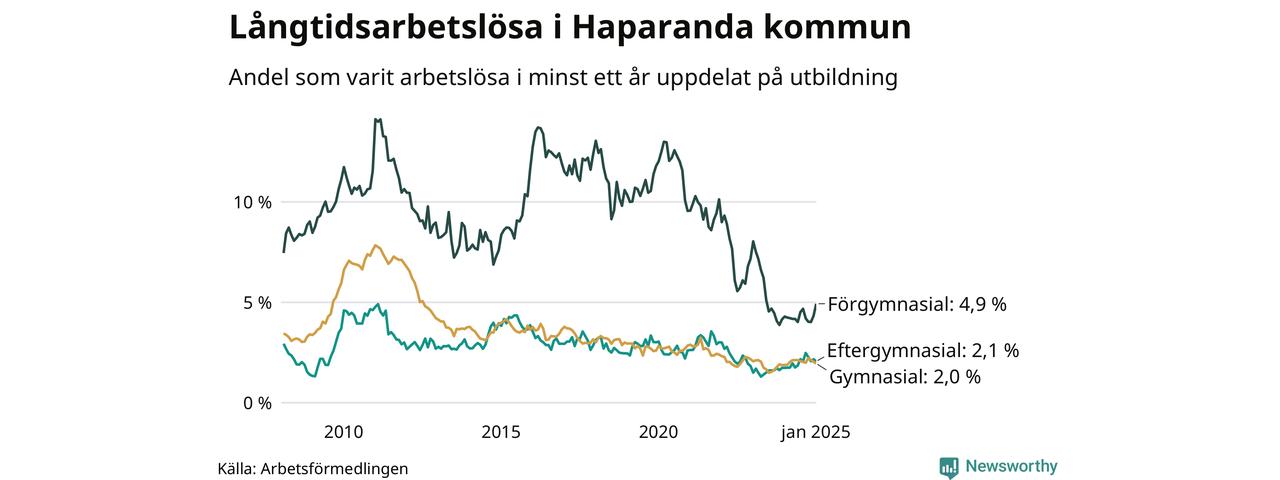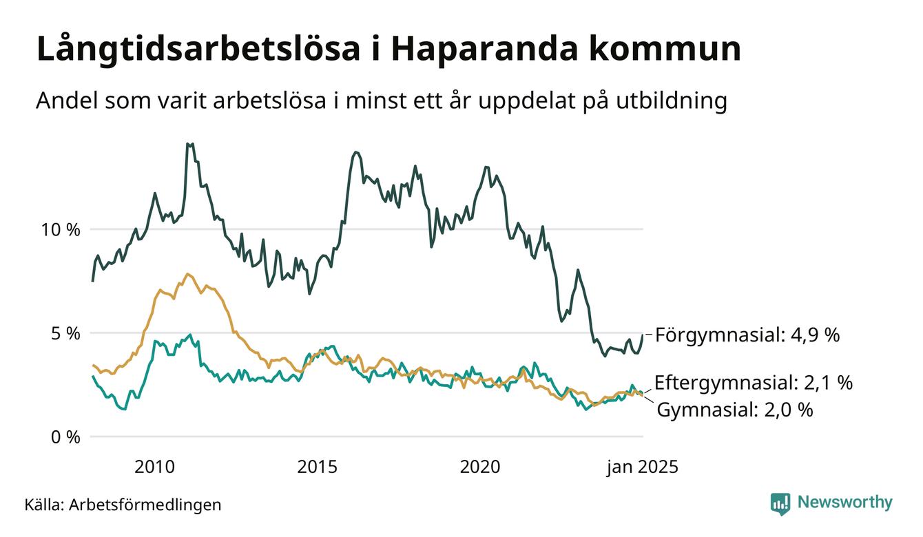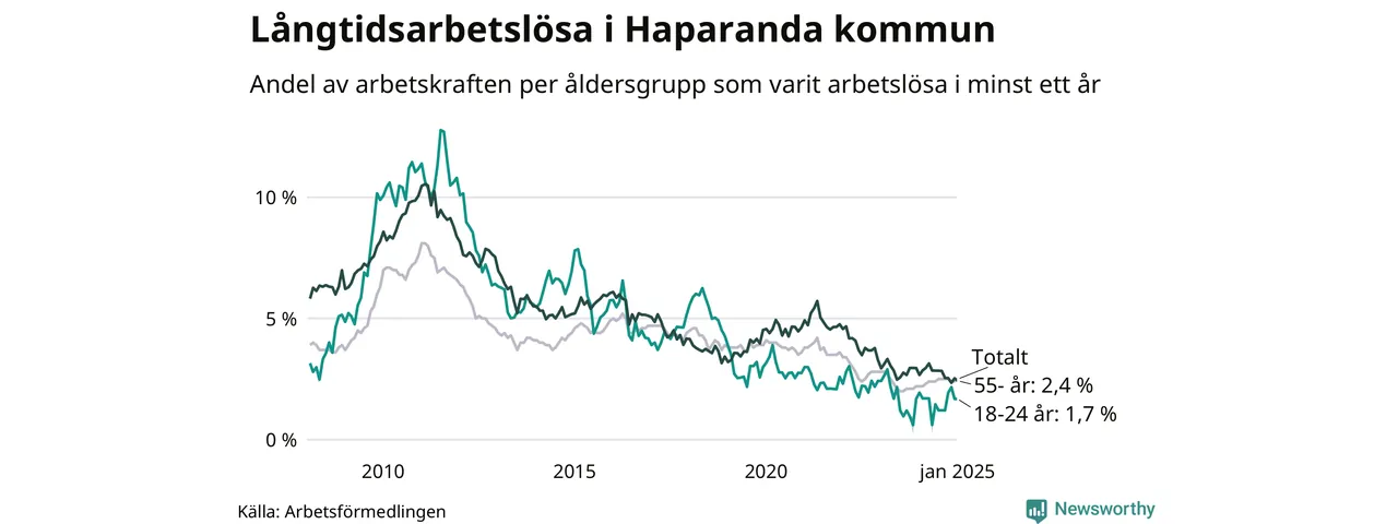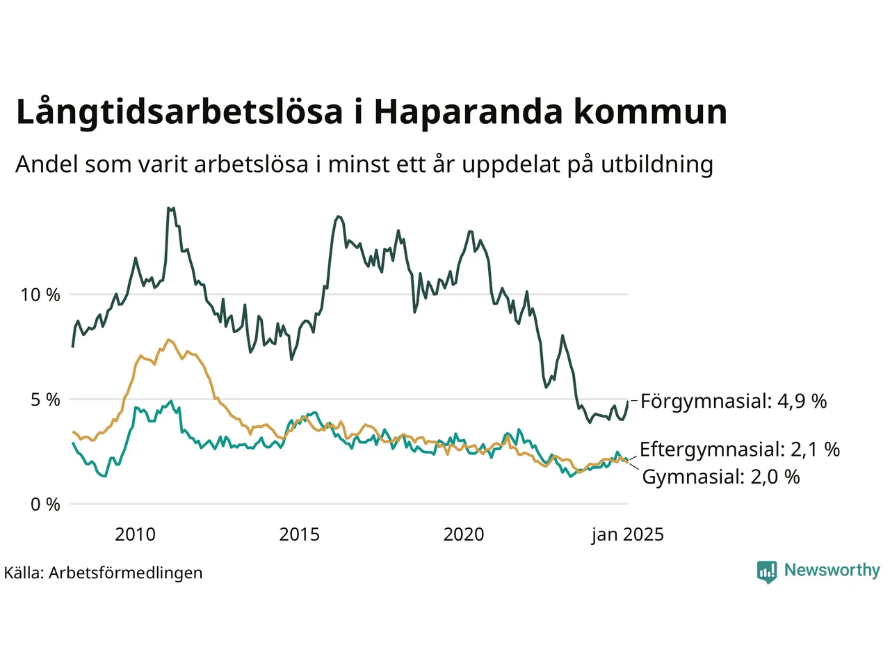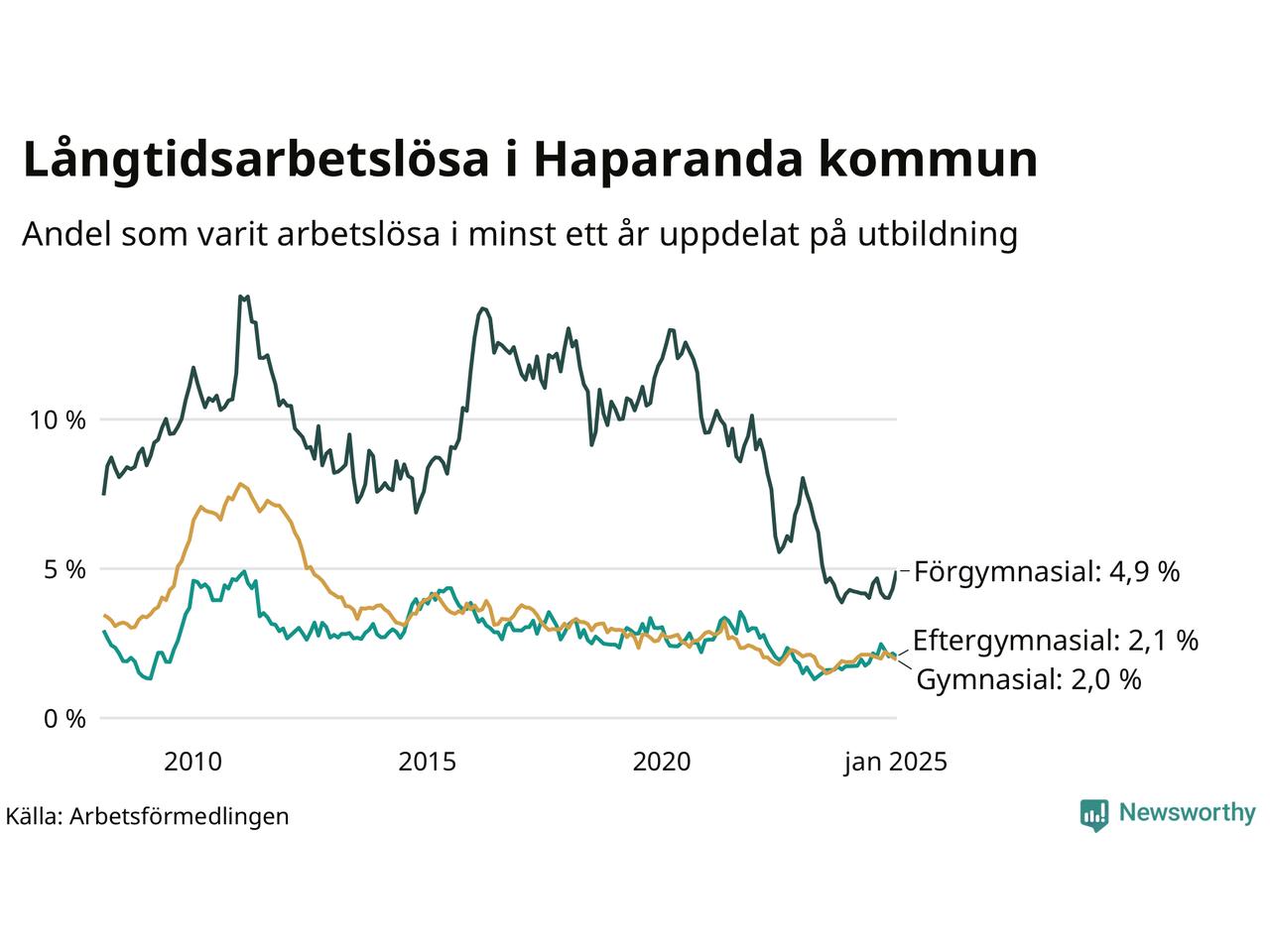 Andelen långtidsarbetslösa i Haparanda är den näst högsta i Norrbottens län, bara i Överkalix är andelen högre 2,6 procent.I Kiruna och Arjeplog finns länets lägsta långtidsarbetslöshet, 0,7 procent. I Norrbotten som helhet hade 1 791 personer (1,5 procent) varit arbetslösa i minst ett år i januari. Det är 13 personer fler än månaden innan.