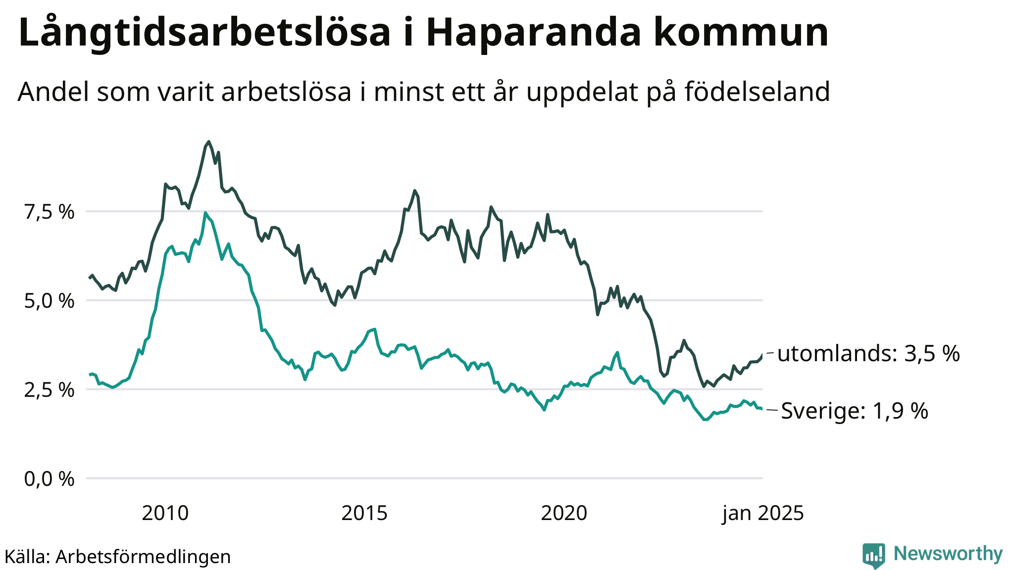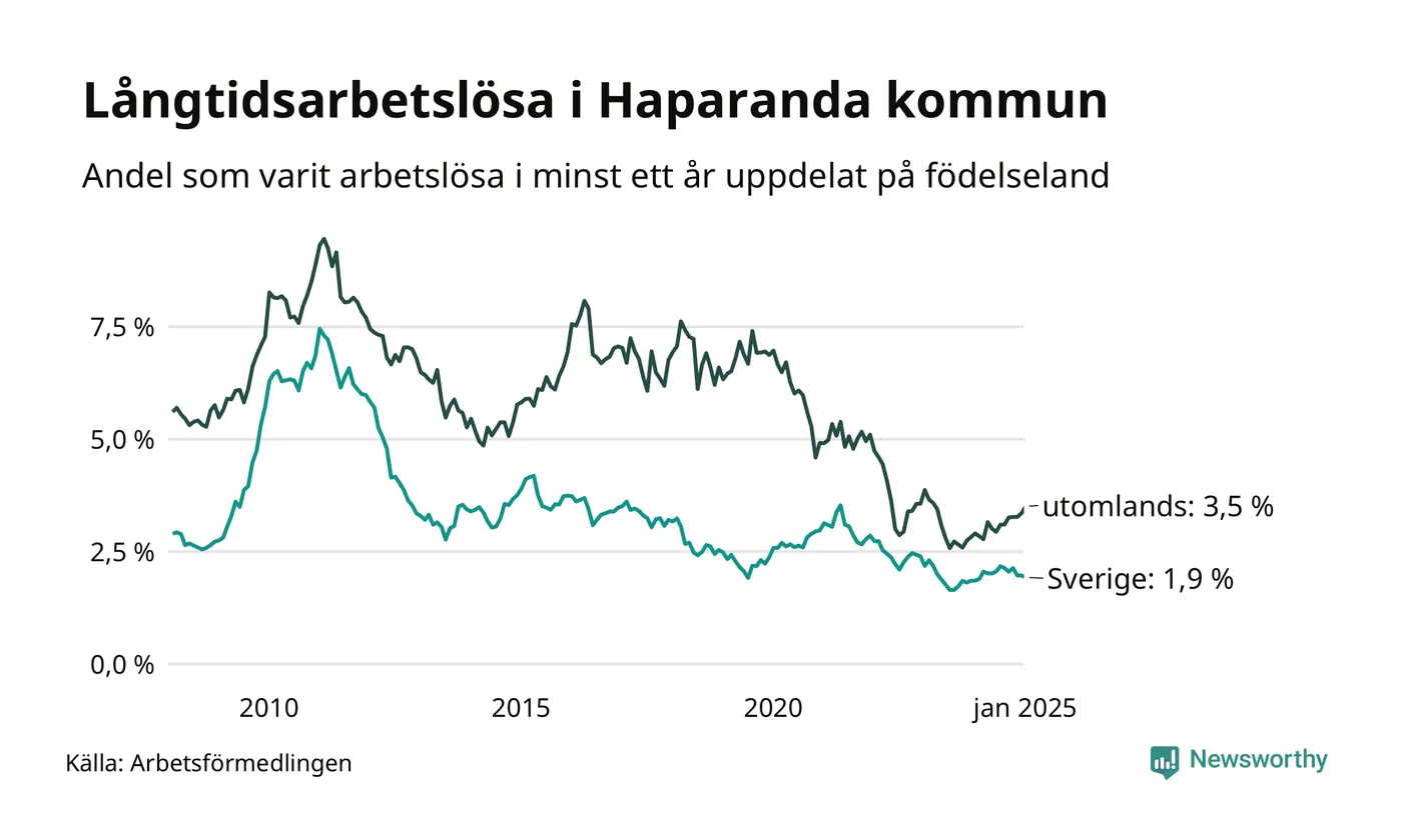 48 av de långtidsarbetslösa i Haparanda är födda i Sverige, medan 46 är födda utomlands. Det innebär att långtidsarbetslösheten bland Sverigefödda är 1,9 procent, medan den är 3,5 procent bland födda utomlands. Även i riket som helhet är arbetslösheten högre bland utrikesfödda.