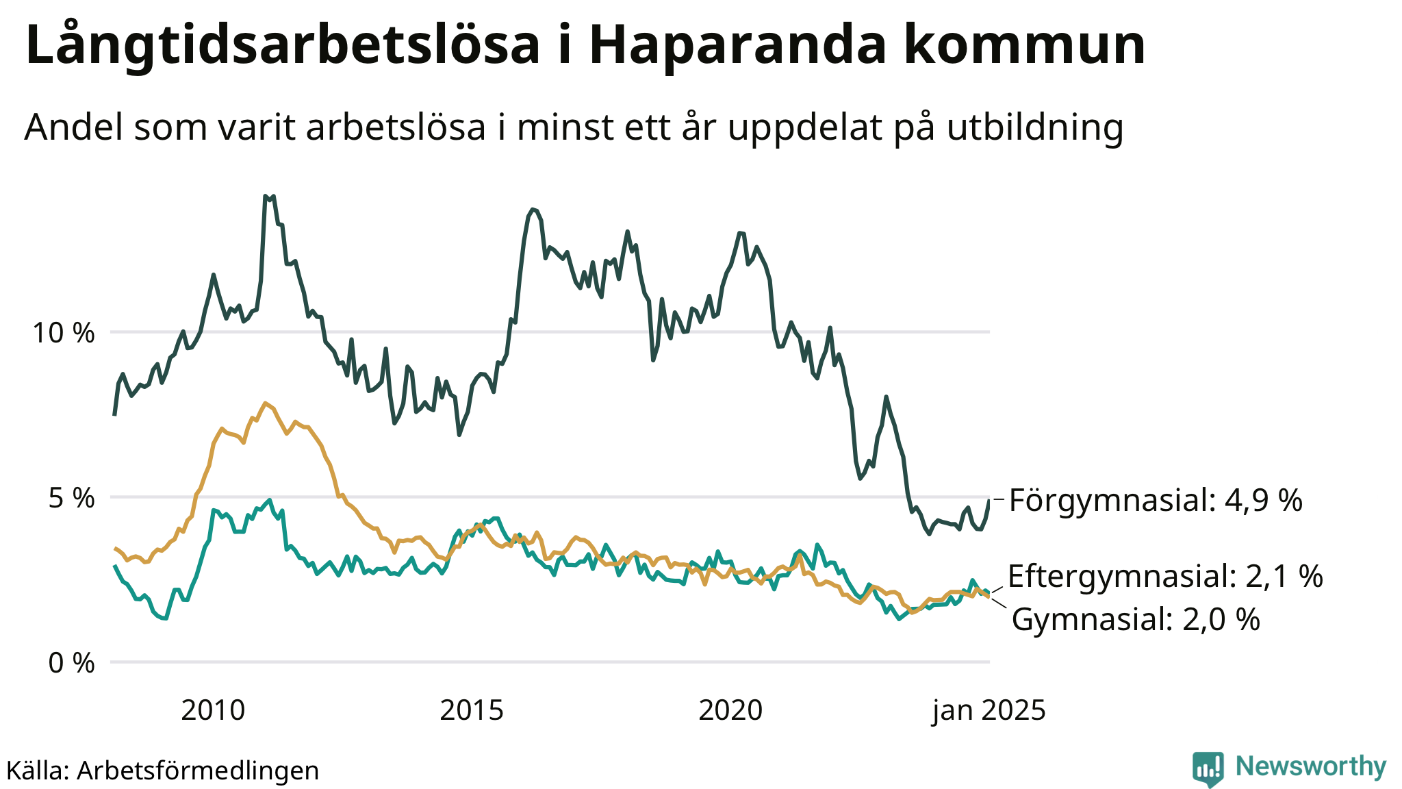 Andelen som varit utan arbete i minst ett år i Haparanda var högre i januari jämfört med samma månad för ett år sedan. Det visar Arbetsfömedlingens senaste månadsstatistik.