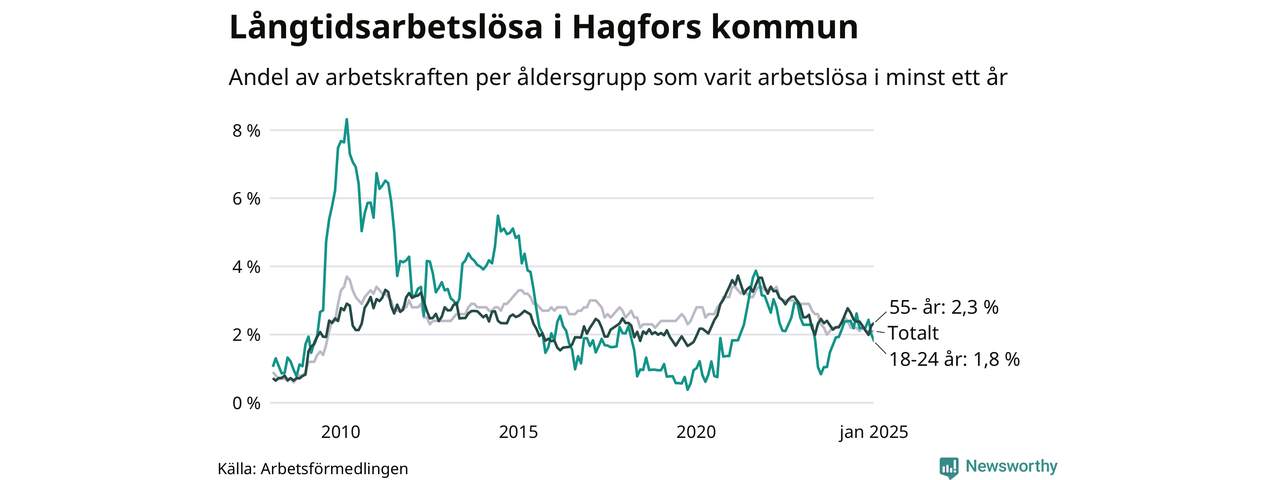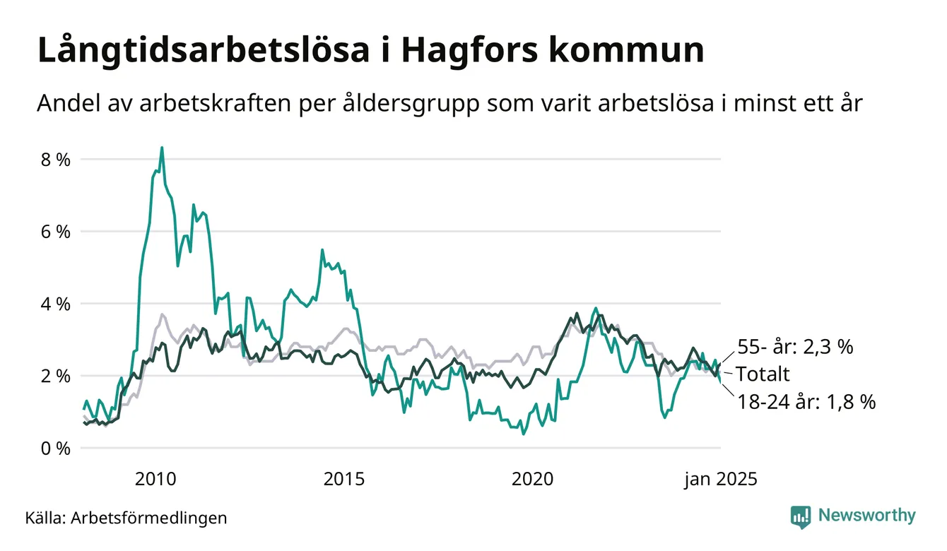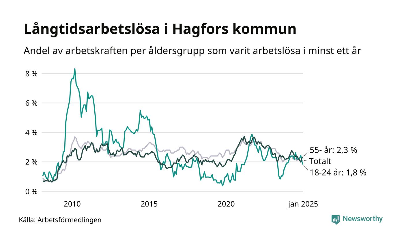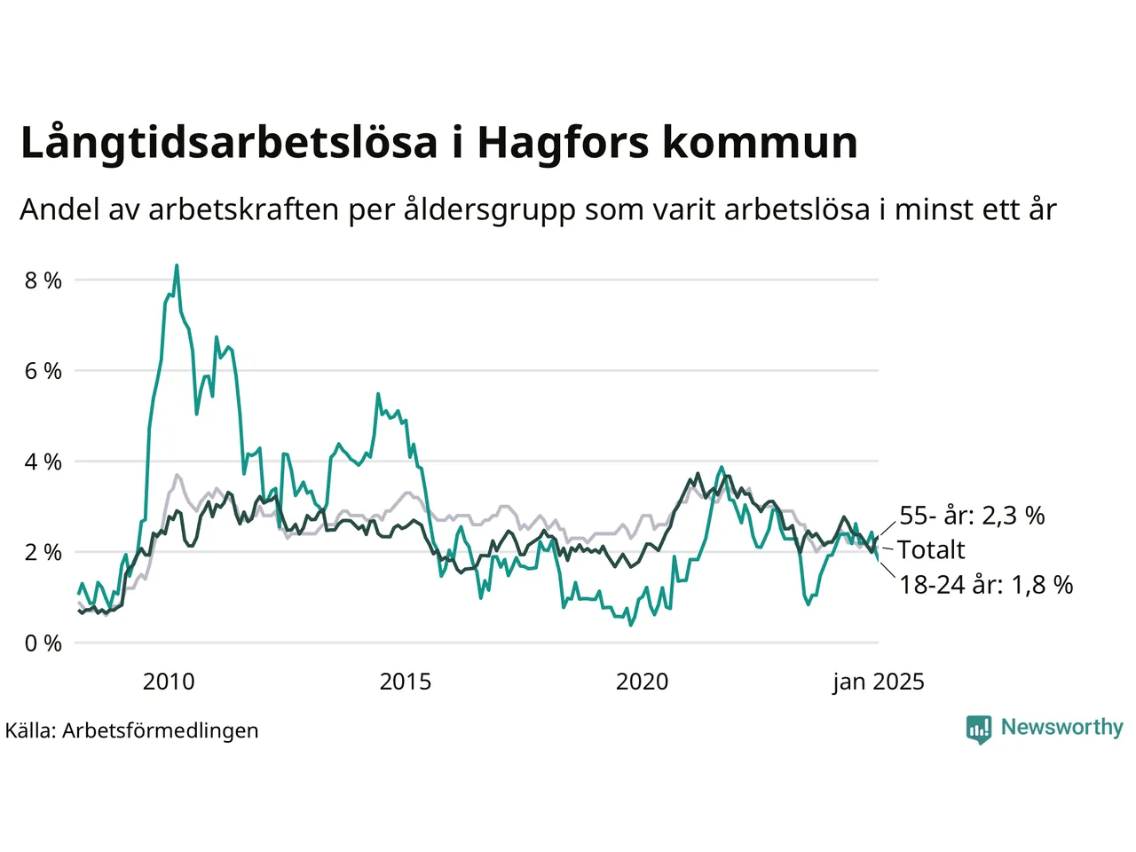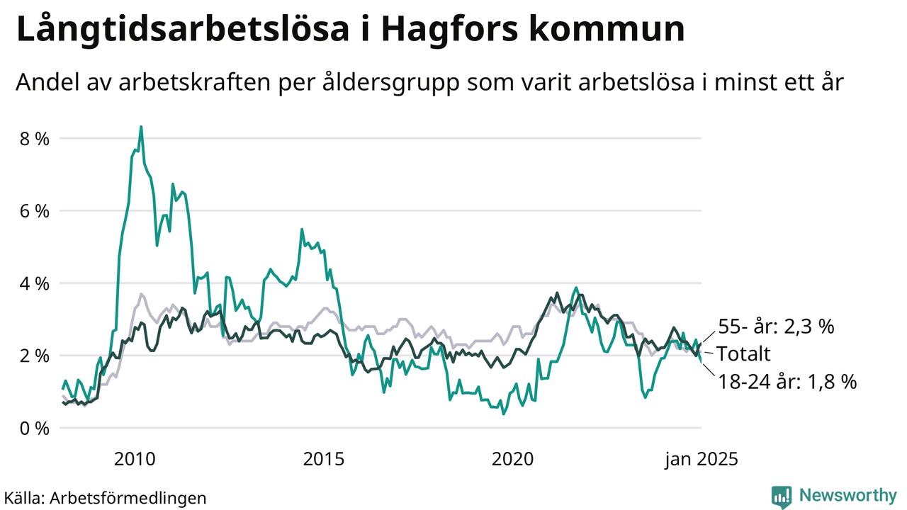 Av de 103 personerna som varit arbetslösa i mer än ett år i Hagfors kommun är 34 personer mellan 55 och 651 år och åtta är mellan 18 och 24 år. För den äldre gruppen är andelen arbetslösa 2,3 procent medan den i den yngre gruppen är 1,8 procent. Även i riket som helhet är långtidsarbetslösheten högre i gruppen äldre.