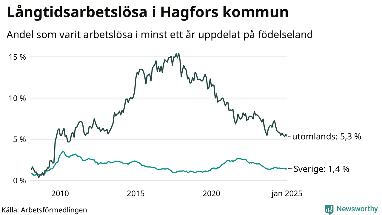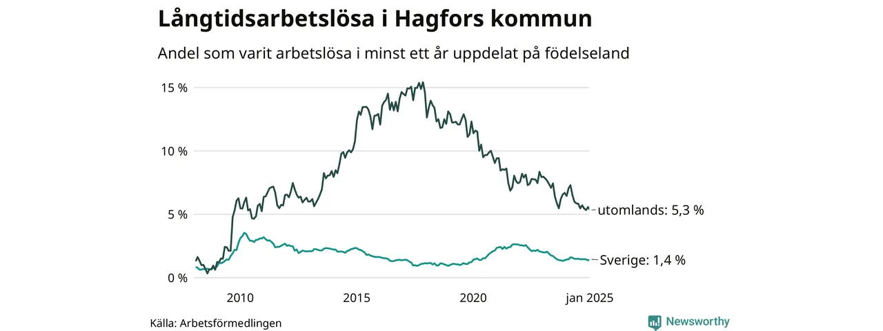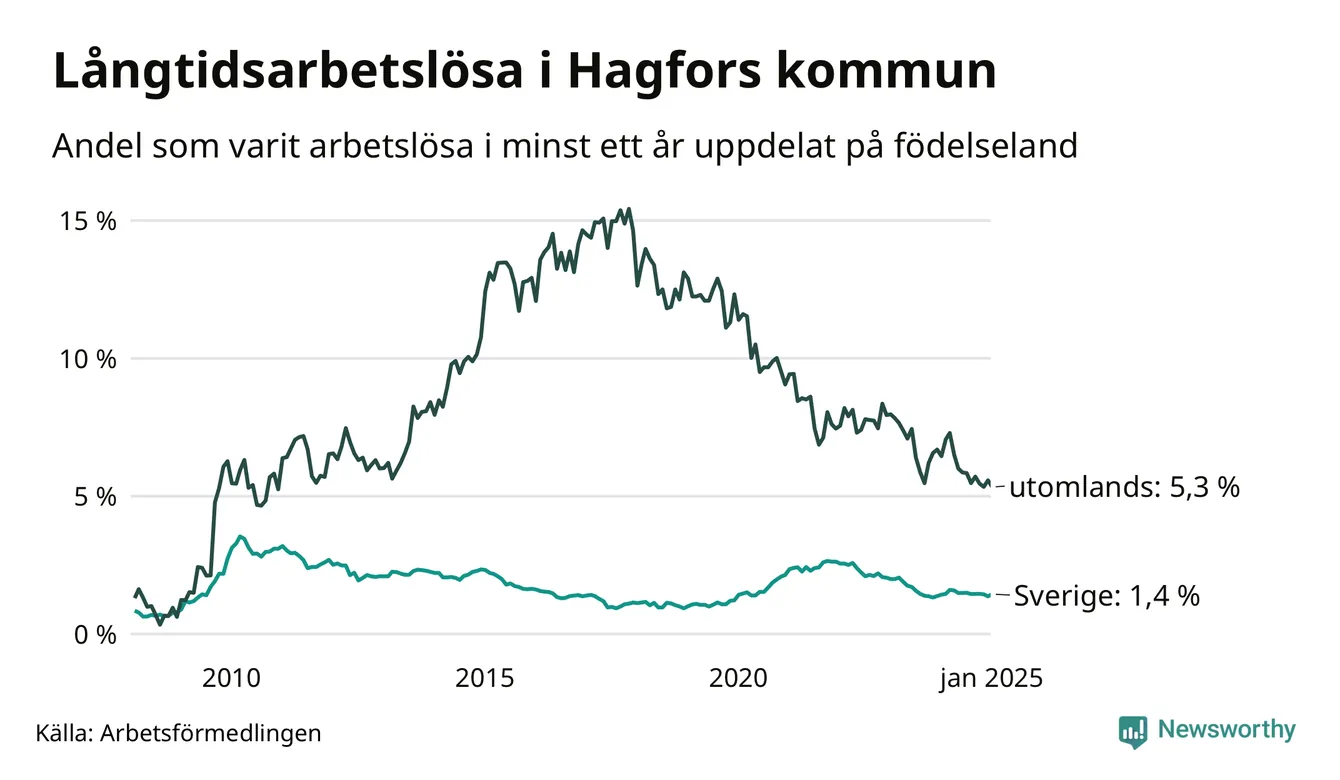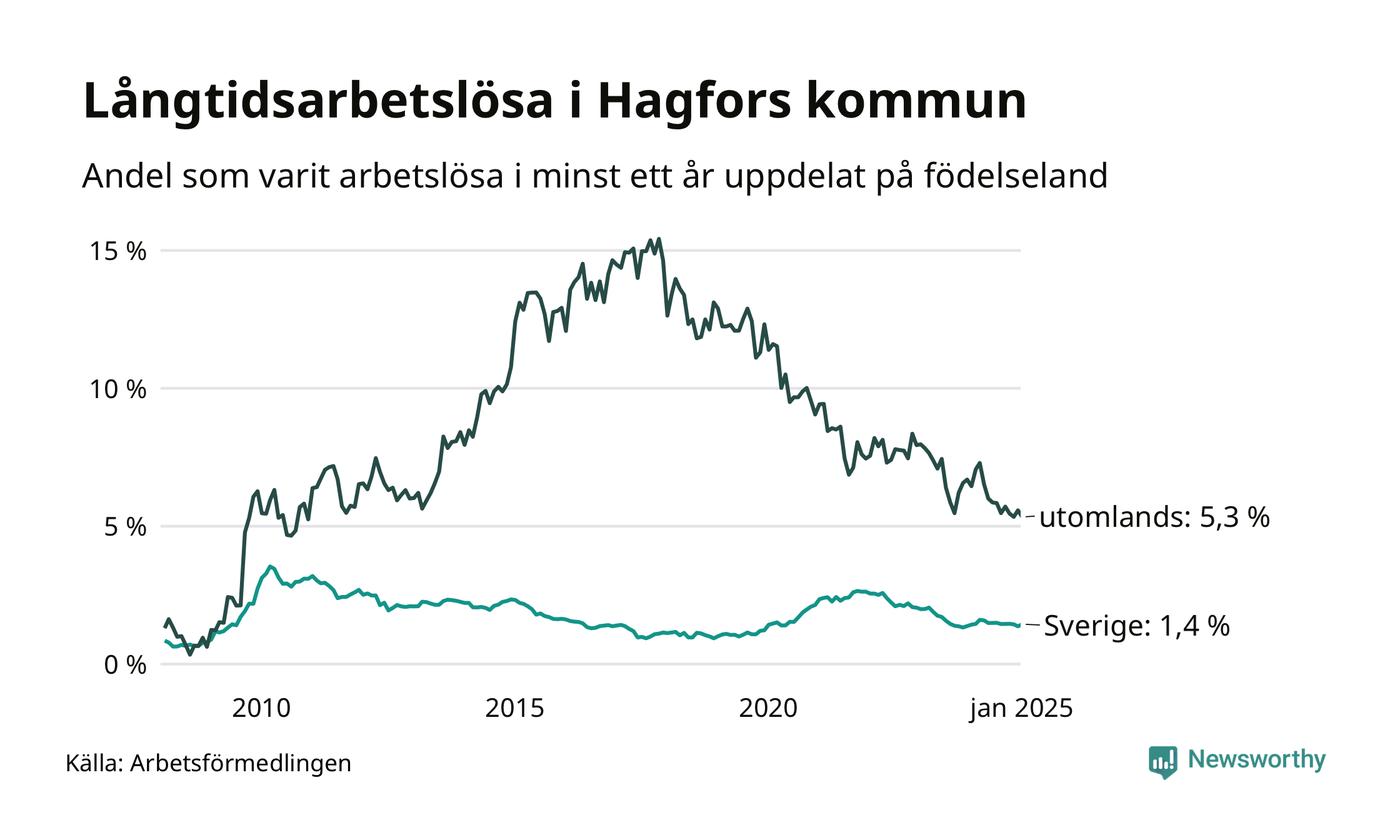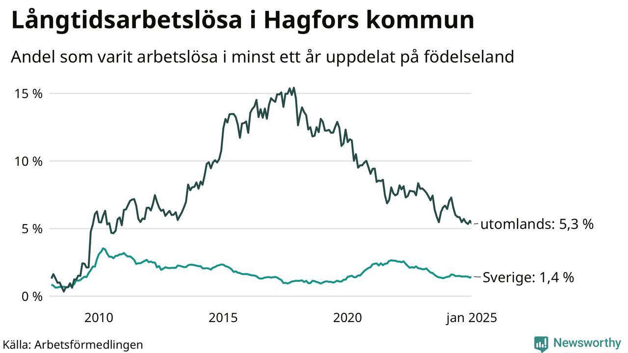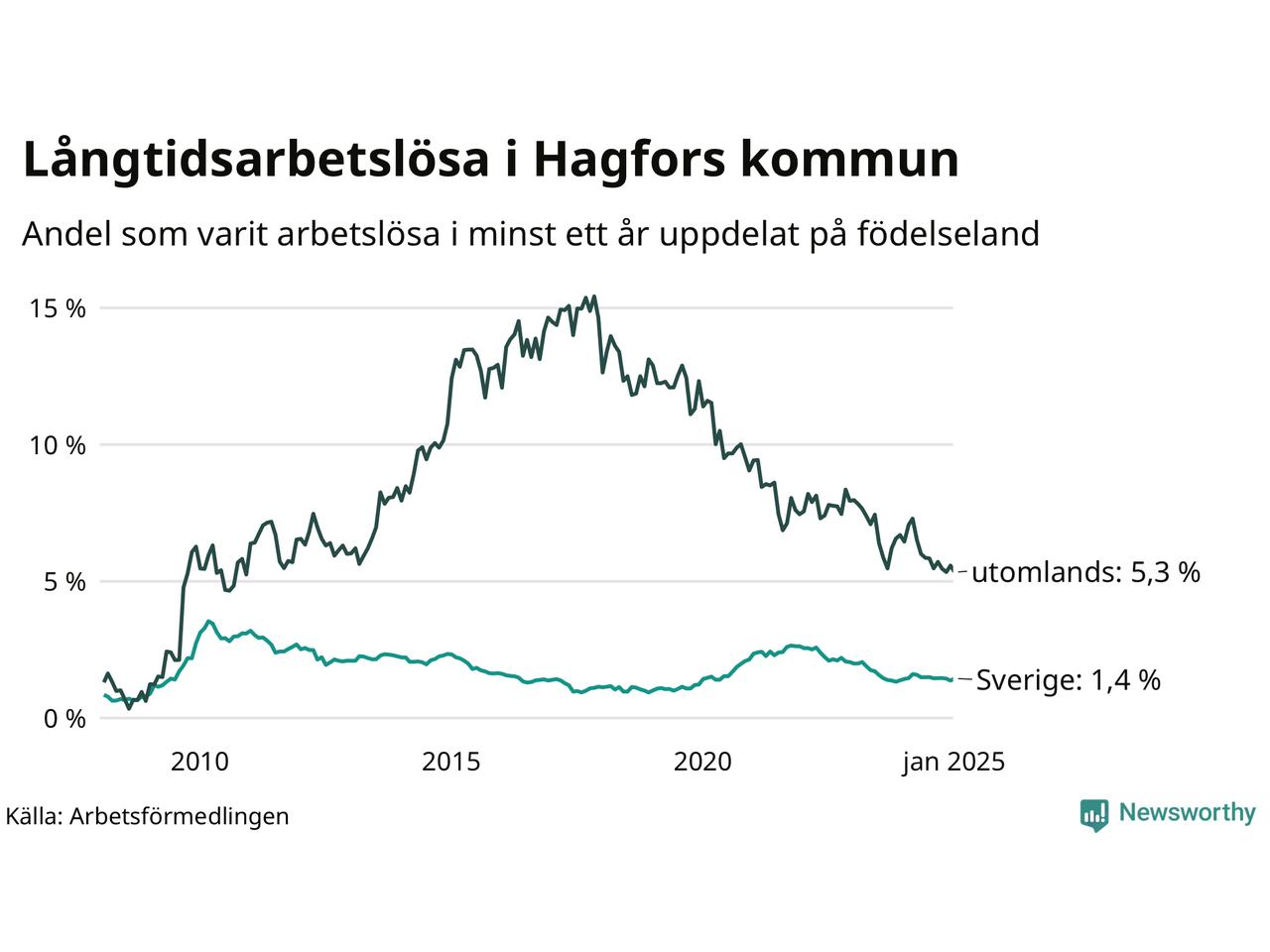 59 av de långtidsarbetslösa i Hagfors är födda i Sverige, medan 44 är födda utomlands. Det innebär att långtidsarbetslösheten bland Sverigefödda är 1,4 procent, medan den är fyra gånger så hög – 5,3 procent – bland födda utomlands. Även i riket som helhet är arbetslösheten högre bland utrikesfödda.