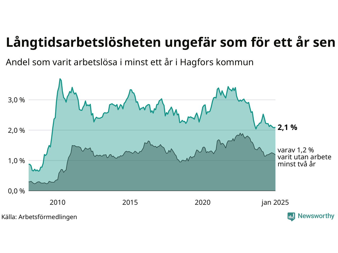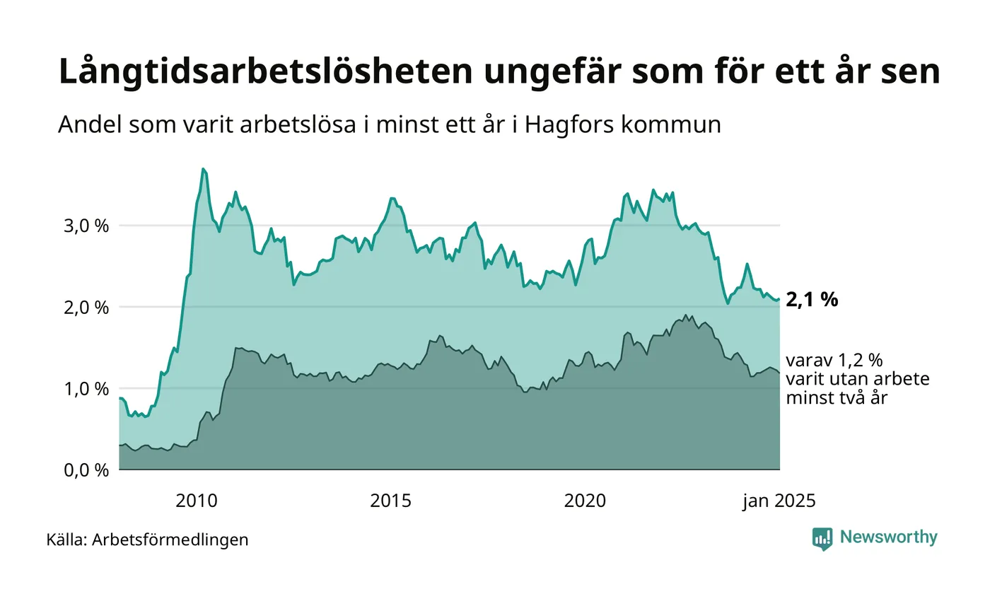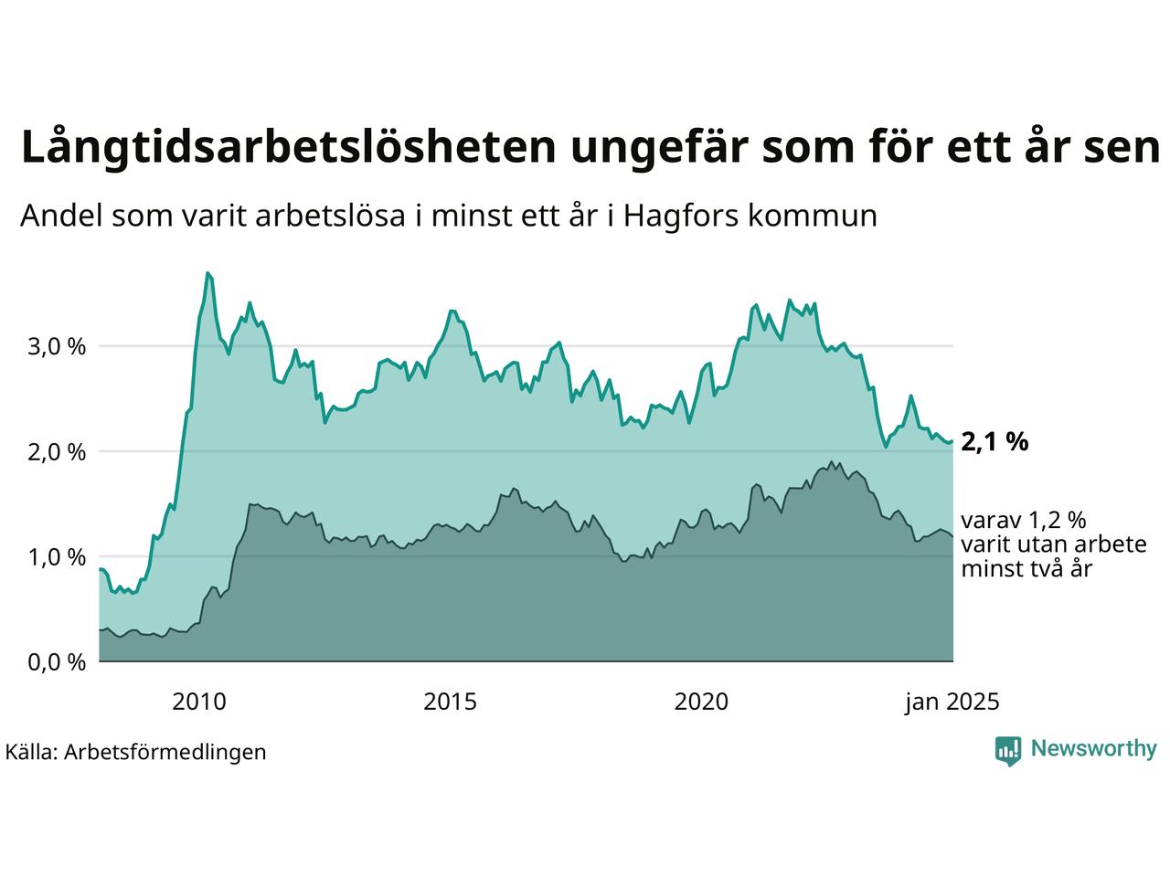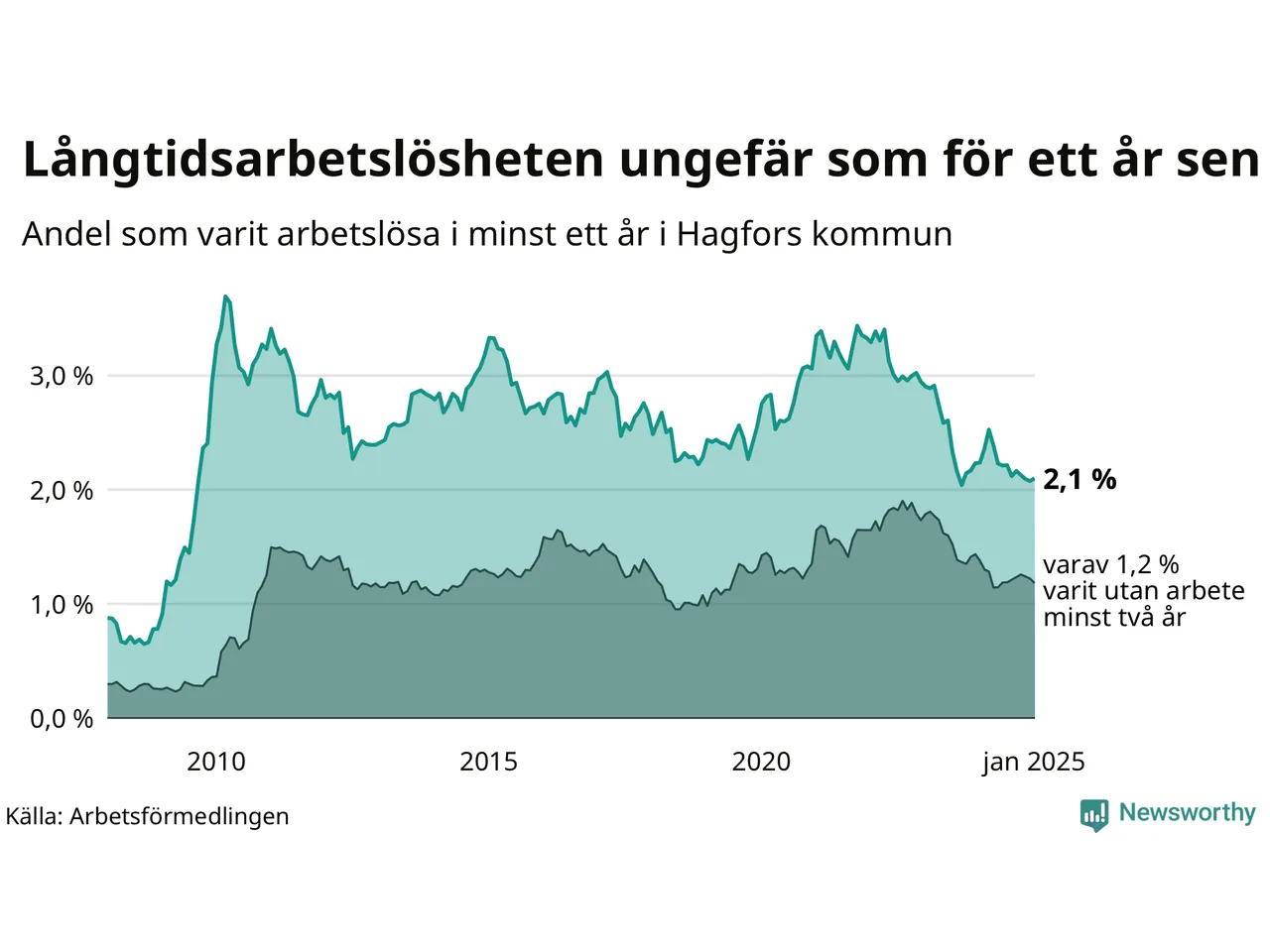 I januari hade 103 Hagforsbor varit arbetslösa i minst ett år, vilket är en fler än månaden innan. 103 personer motsvarar 2,1 procent av arbetskraften i kommunen – andelen långtidsarbetslösa är ungefär på samma nivå som för ett år sedan.