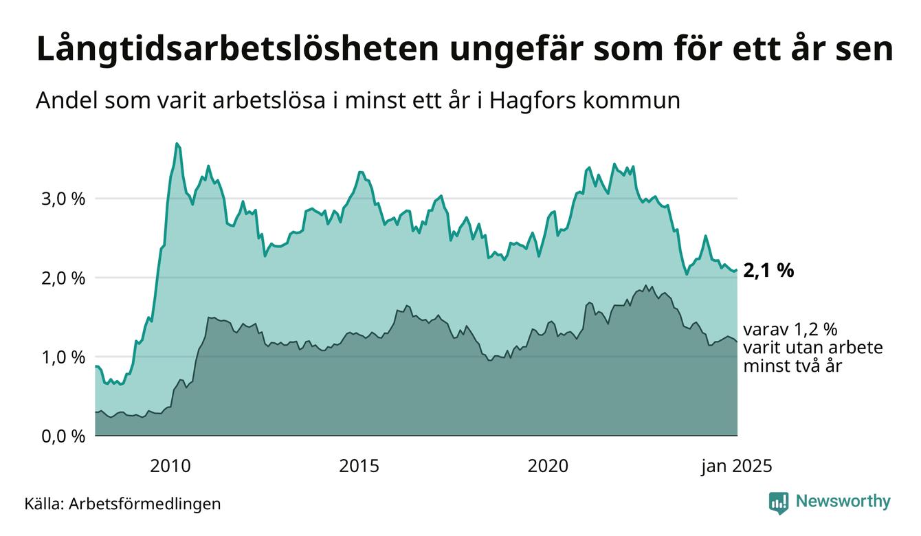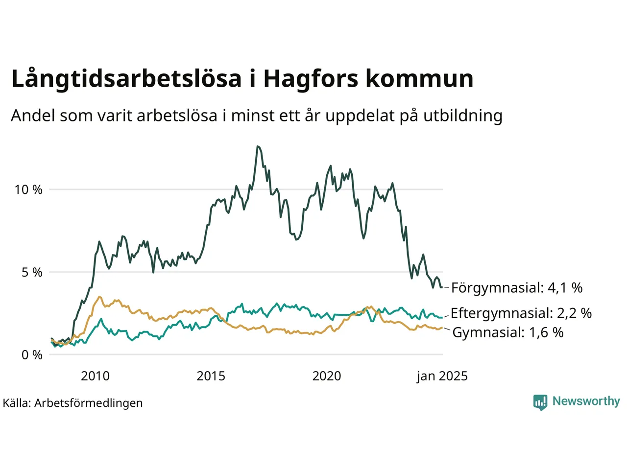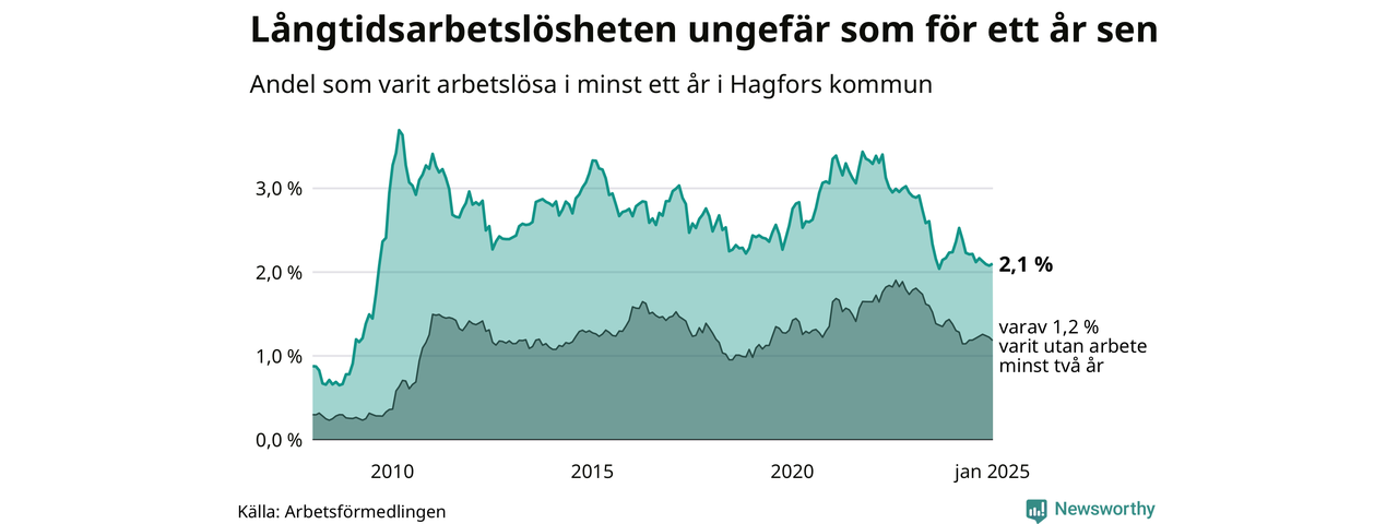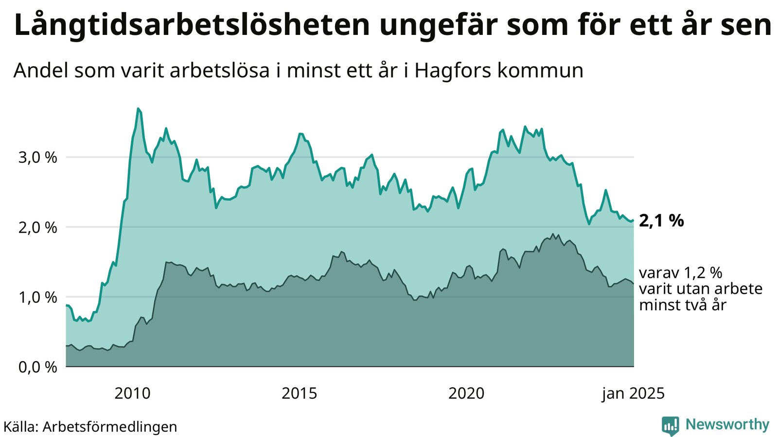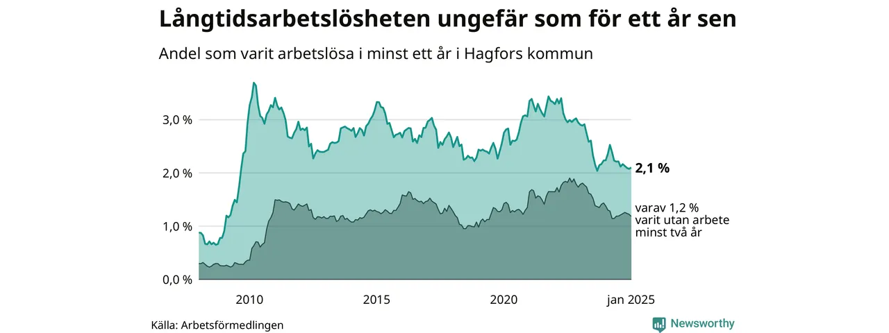 I januari hade 103 Hagforsbor varit arbetslösa i minst ett år, vilket är en fler än månaden innan. 103 personer motsvarar 2,1 procent av arbetskraften i kommunen – andelen långtidsarbetslösa är ungefär på samma nivå som för ett år sedan.