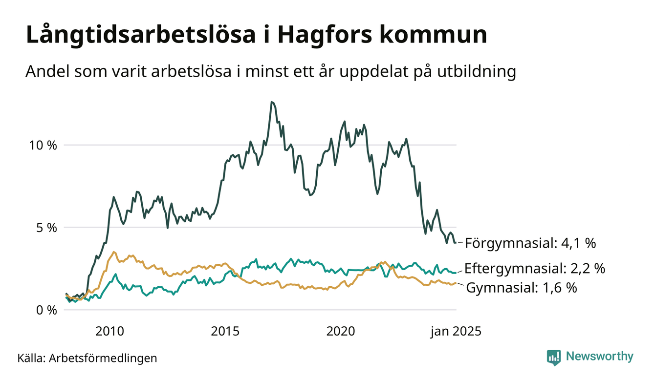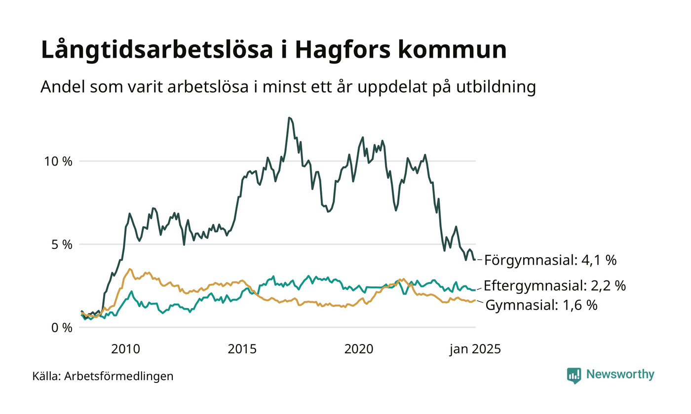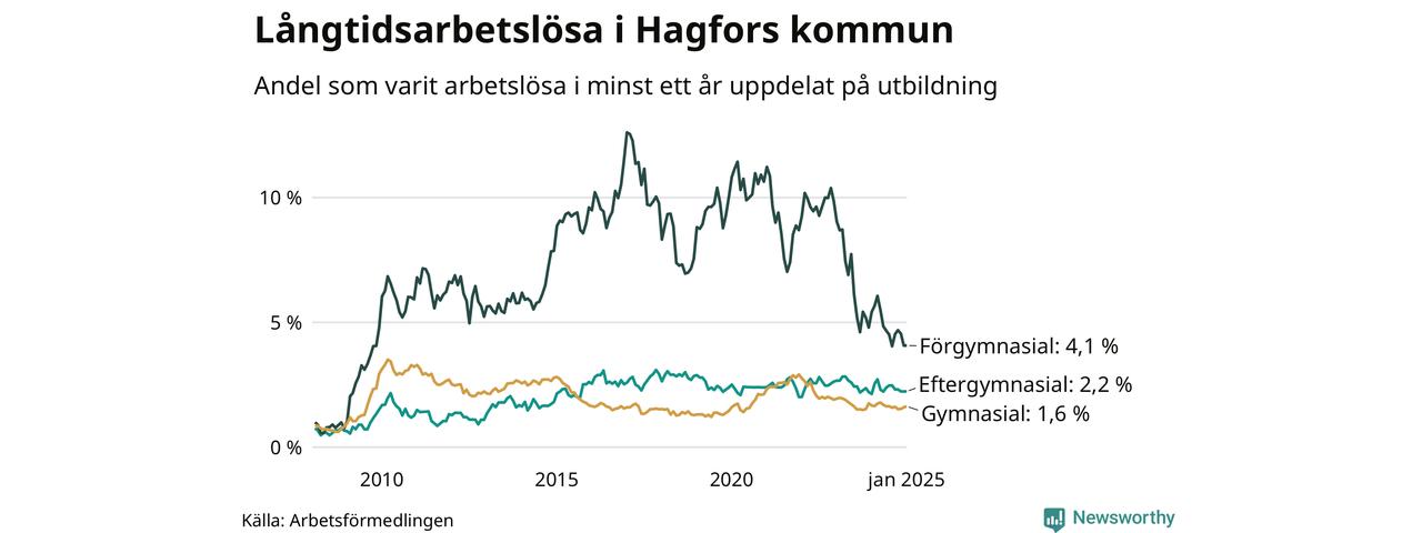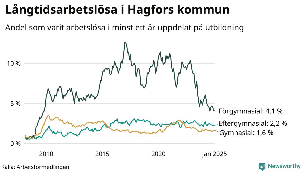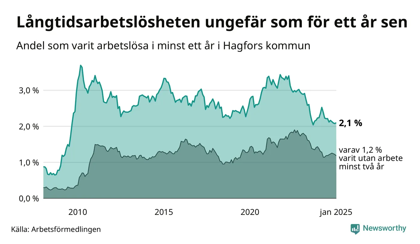 I januari hade 103 Hagforsbor varit arbetslösa i minst ett år, vilket är en fler än månaden innan. 103 personer motsvarar 2,1 procent av arbetskraften i kommunen – andelen långtidsarbetslösa är ungefär på samma nivå som för ett år sedan.