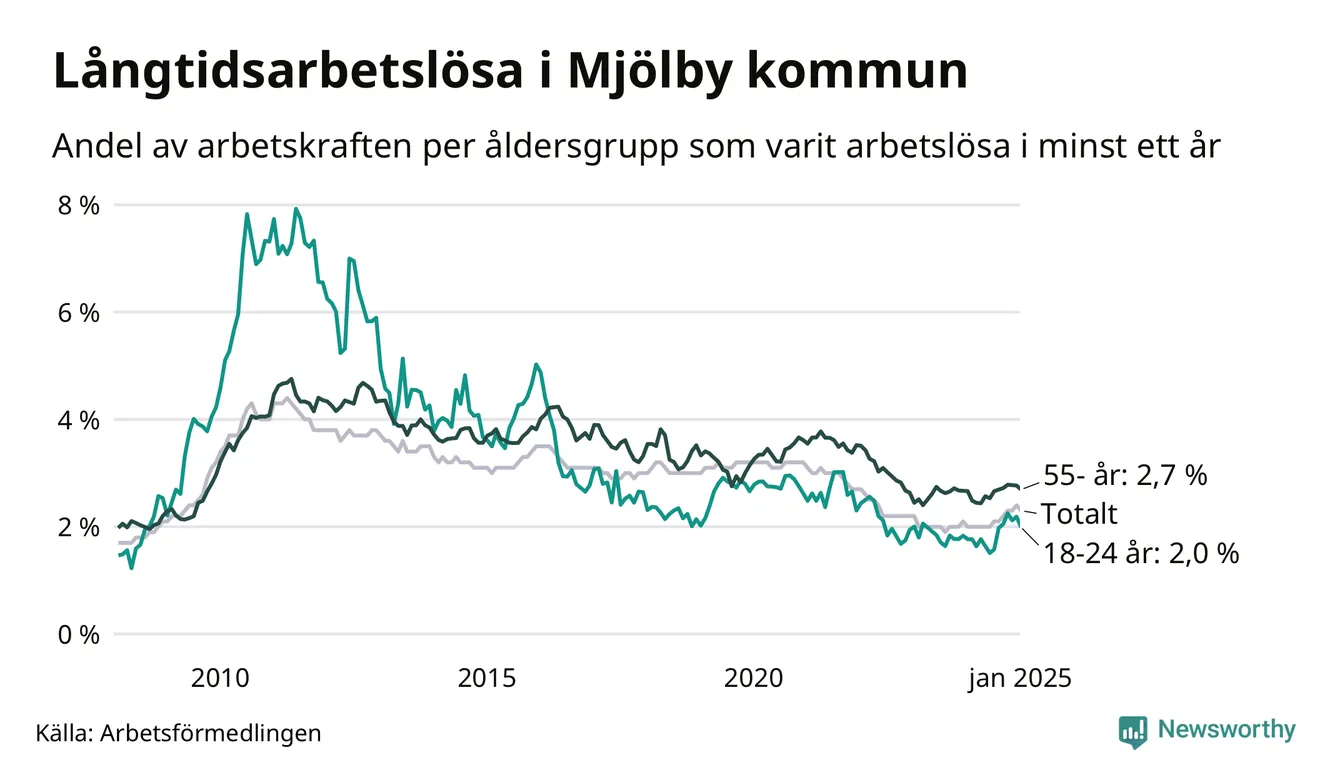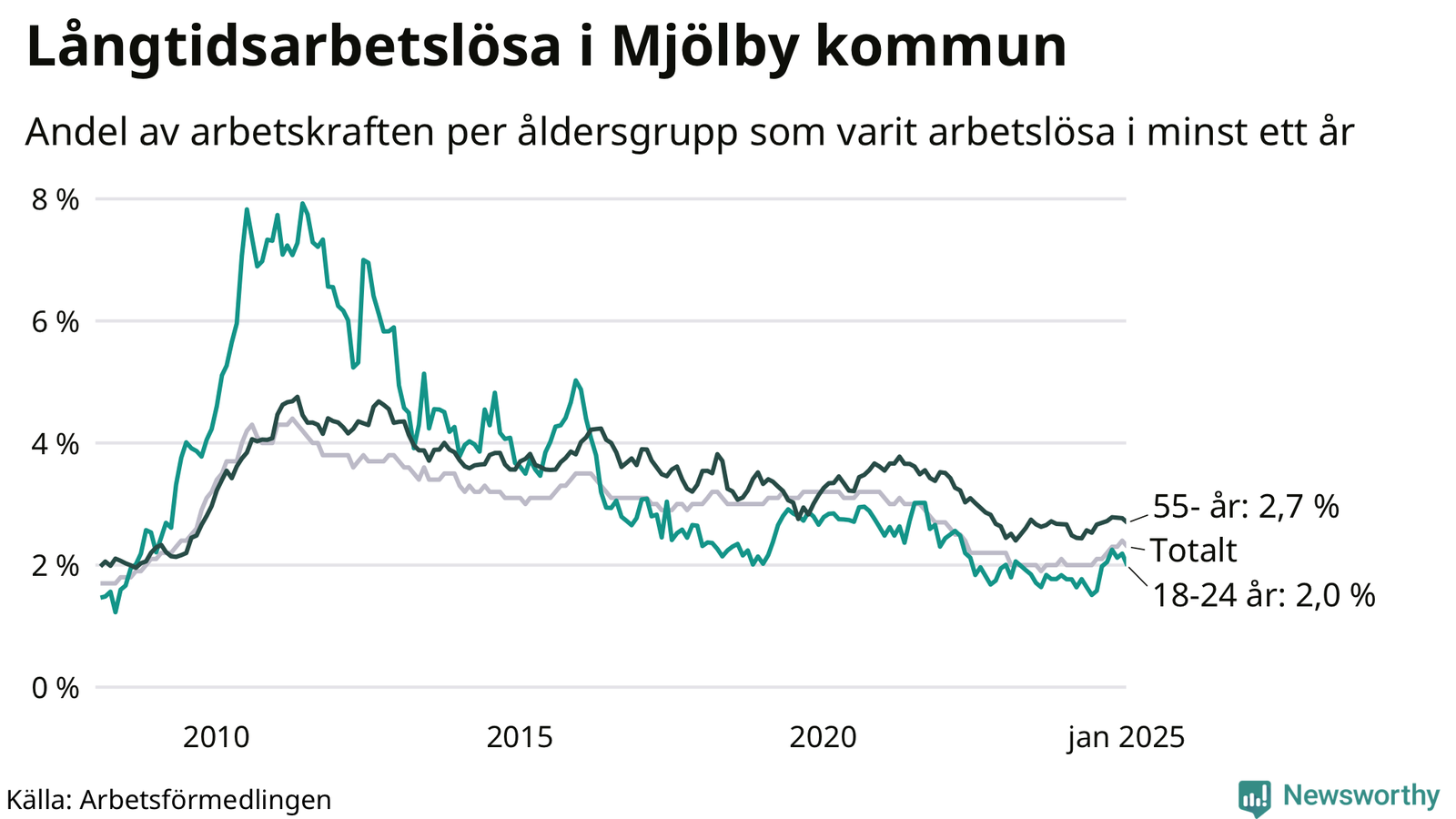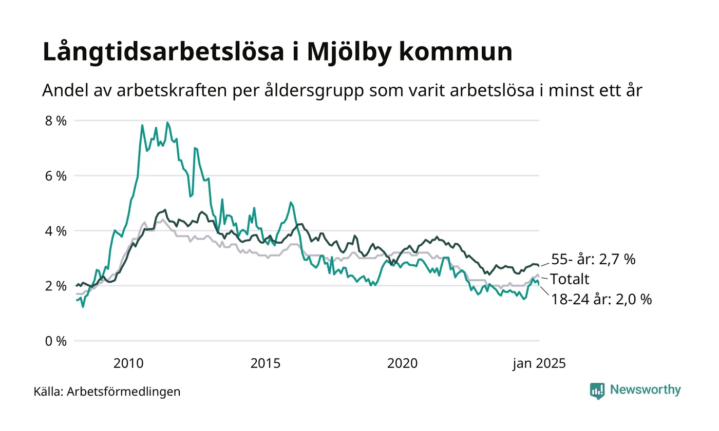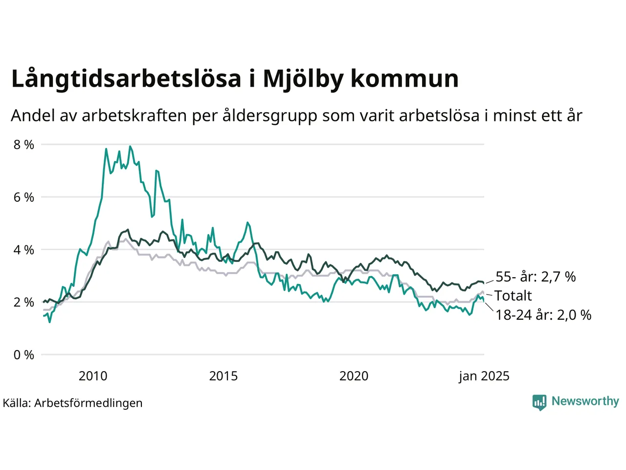 Av de 337 personerna som varit arbetslösa i mer än ett år i Mjölby kommun är 80 personer mellan 55 och 651 år och 30 är mellan 18 och 24 år. För den äldre gruppen är andelen arbetslösa 2,7 procent medan den i den yngre gruppen är 2,0 procent. Även i riket som helhet är långtidsarbetslösheten högre i gruppen äldre.