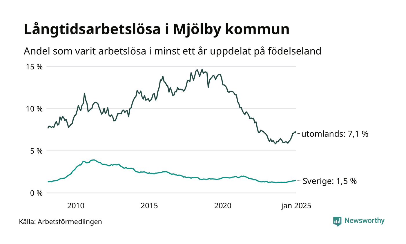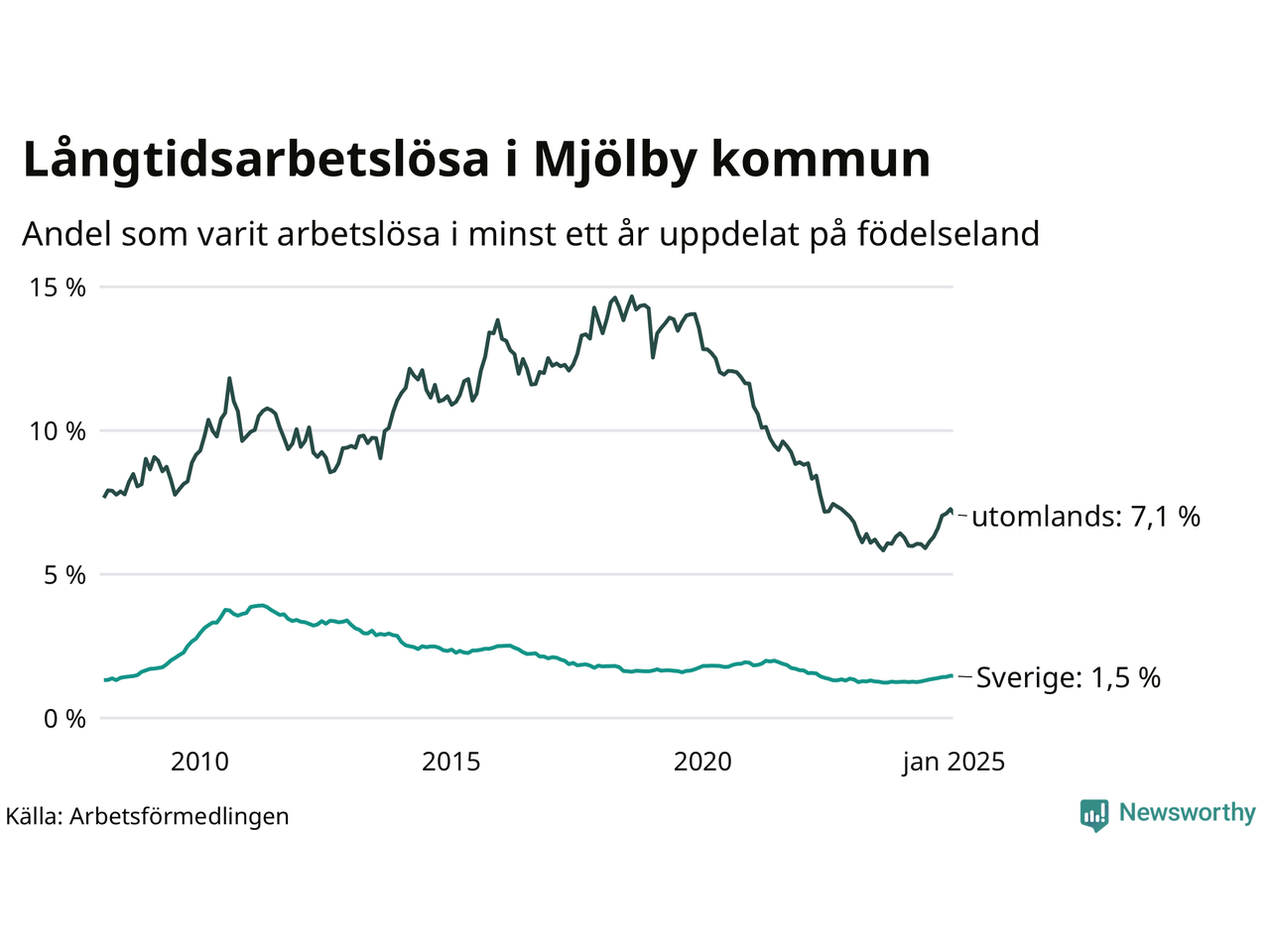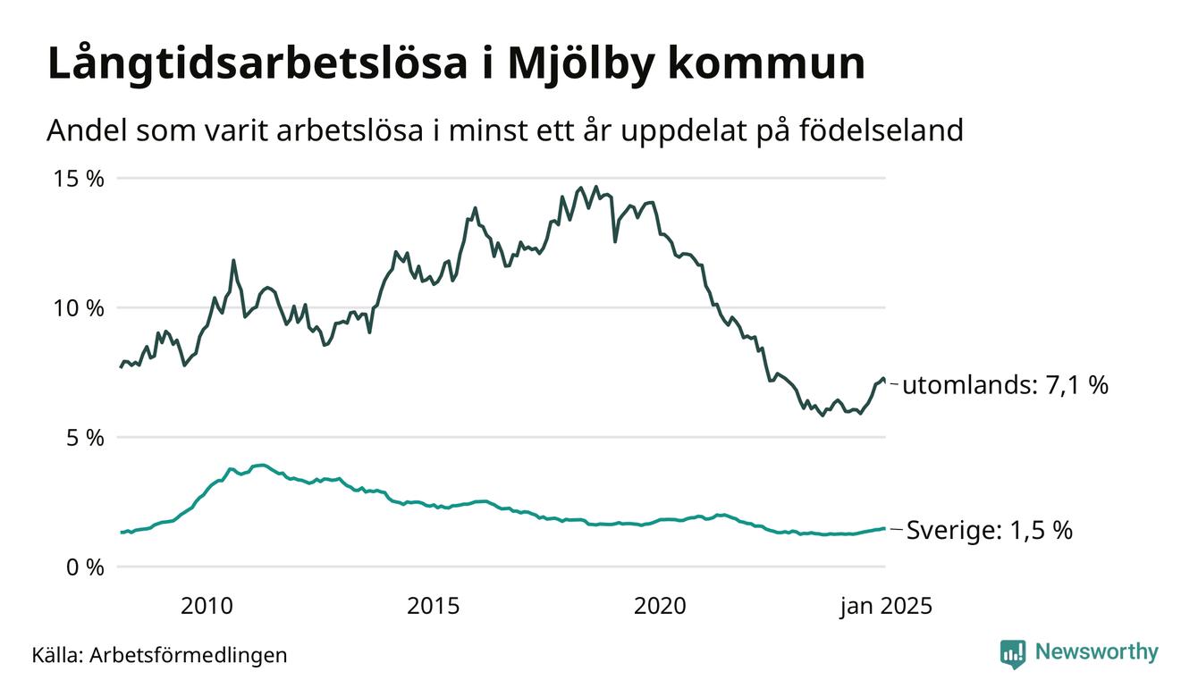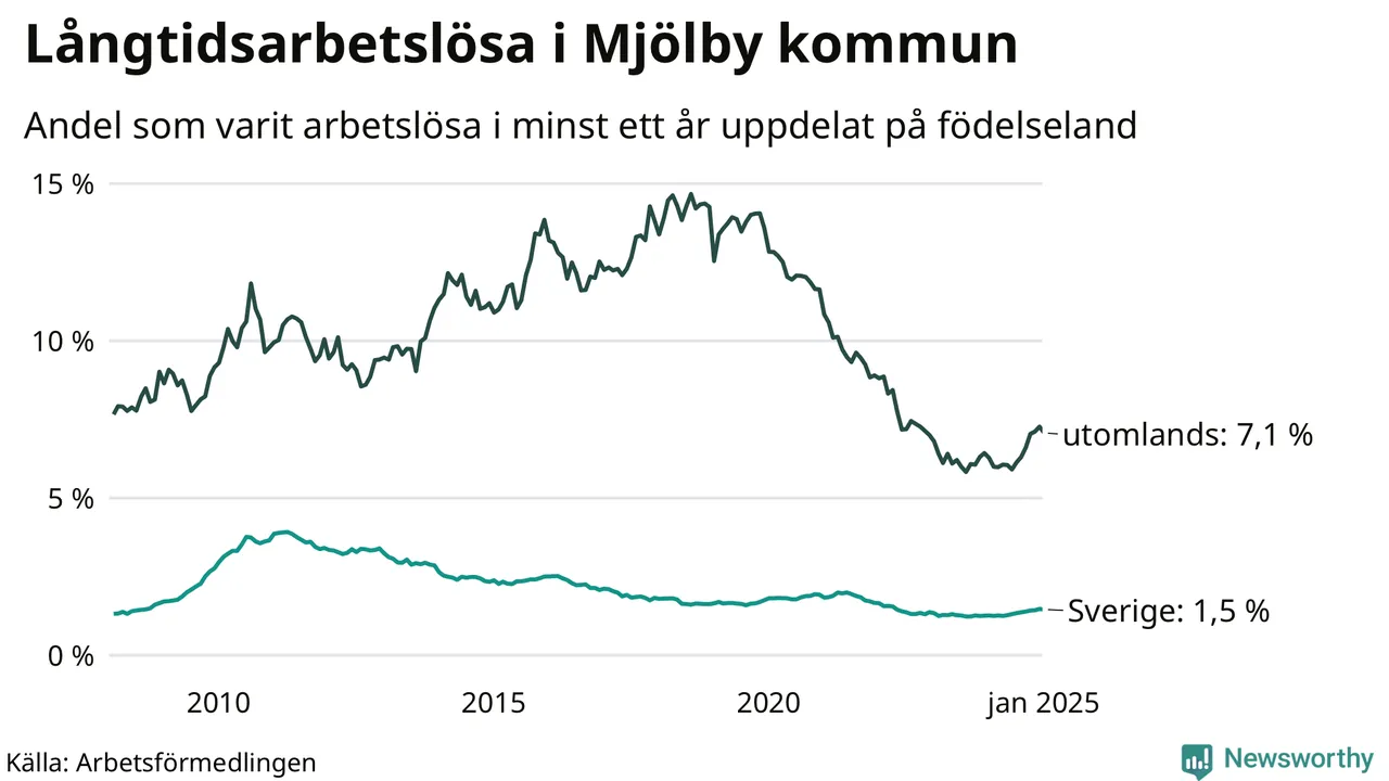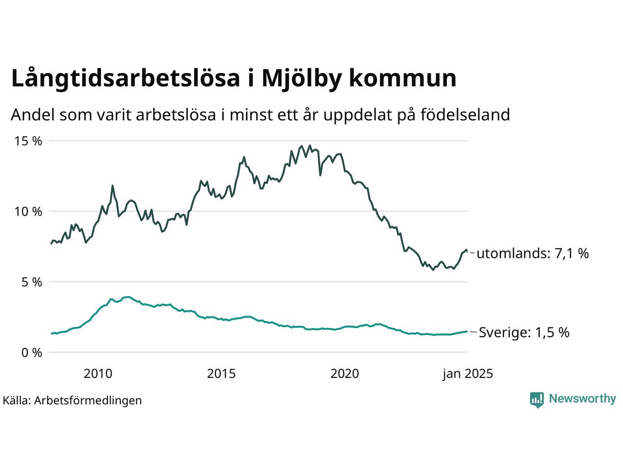 176 av de långtidsarbetslösa i Mjölby är födda i Sverige, medan 161 är födda utomlands. Det innebär att långtidsarbetslösheten bland Sverigefödda är 1,5 procent, medan den är fem gånger så hög – 7,1 procent – bland födda utomlands. Även i riket som helhet är arbetslösheten högre bland utrikesfödda.