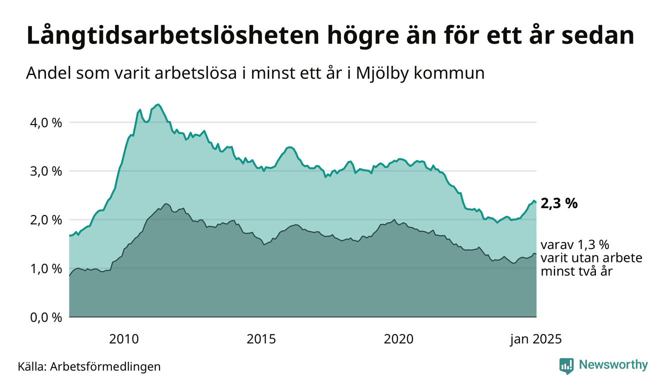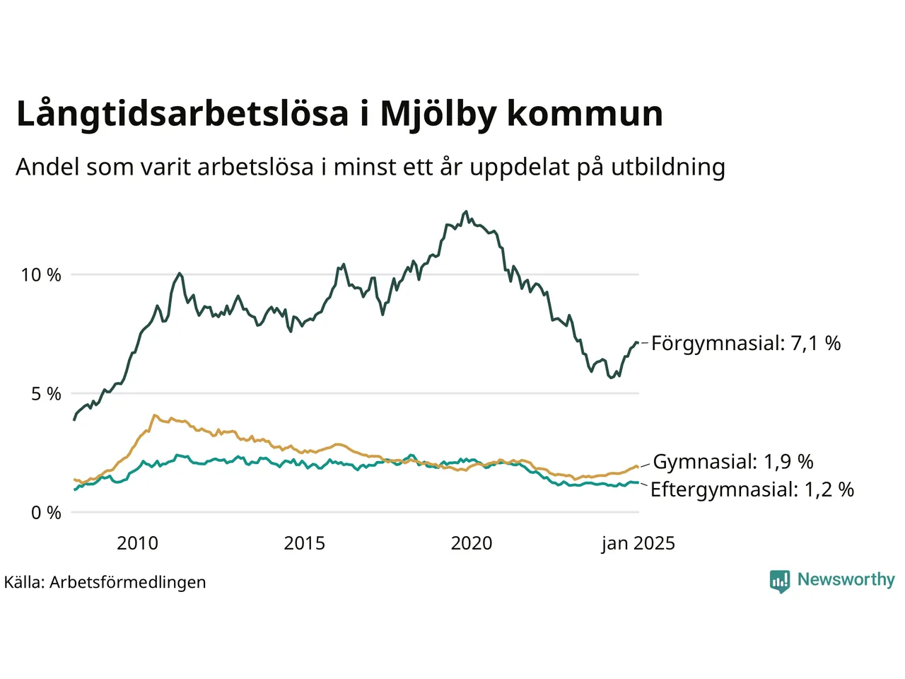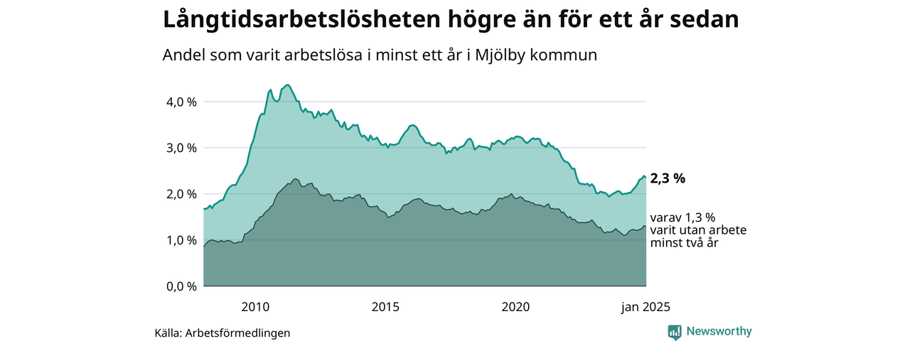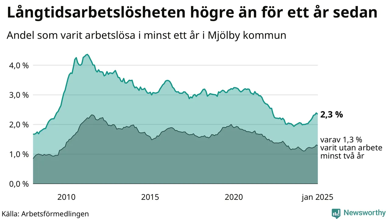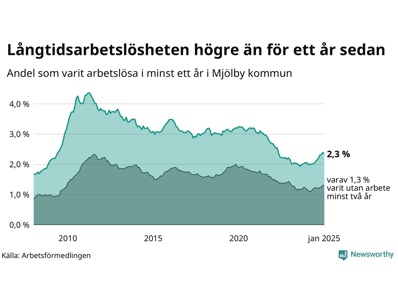 I januari hade 337 Mjölbybor varit arbetslösa i minst ett år, vilket är sex färre än månaden innan. Det är den första månaden sedan februari 2024 som antalet arbetslösa minskar. 337 personer motsvarar 2,3 procent av arbetskraften i kommunen – andelen långtidsarbetslösa är 0,3 procentenheter högre än samma månad för ett år sedan.