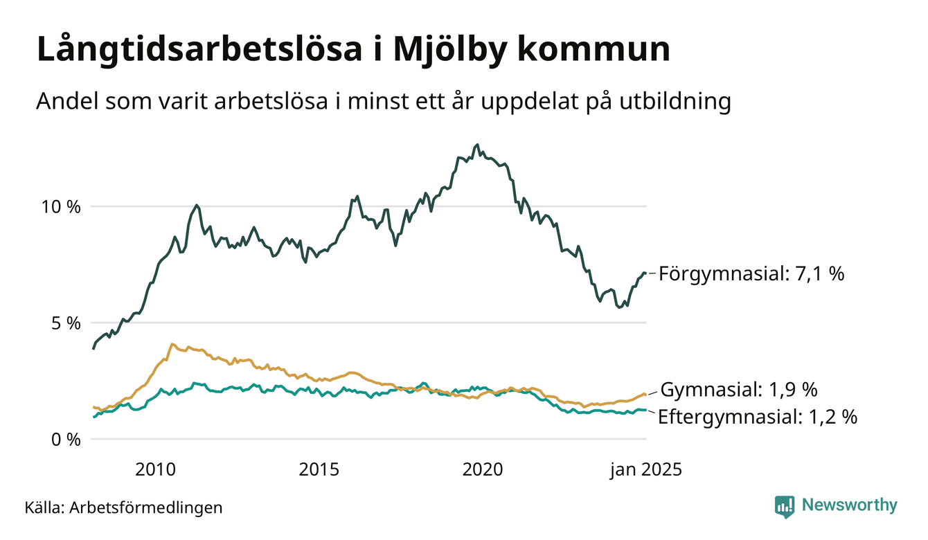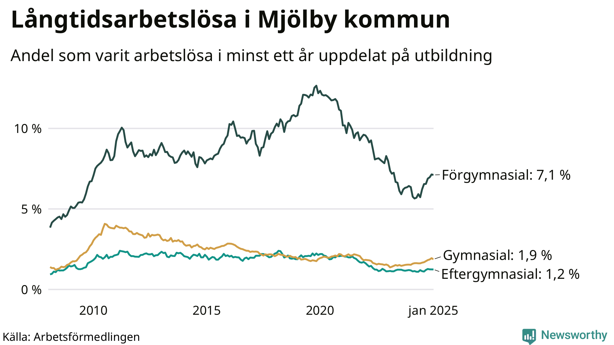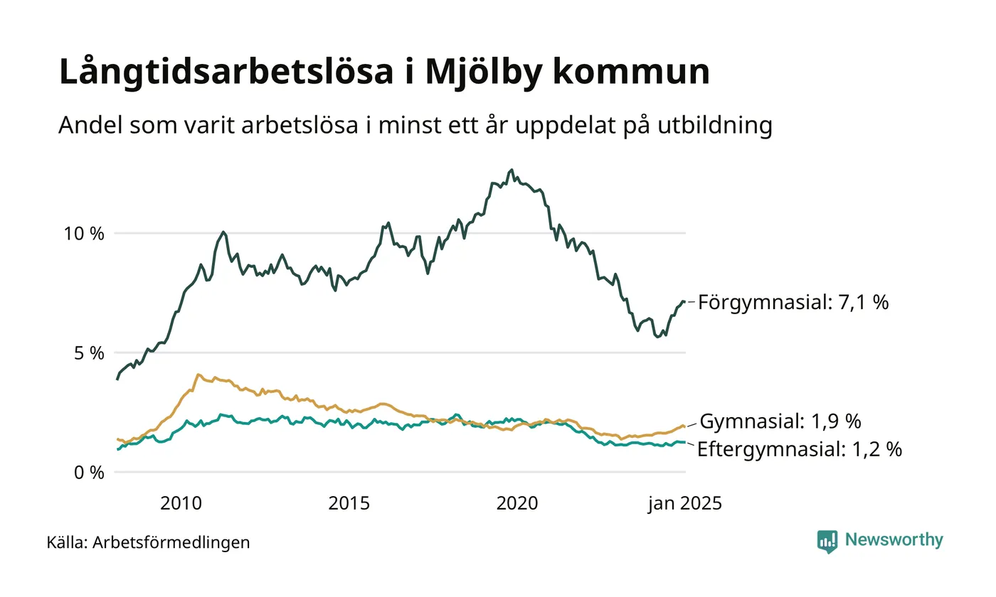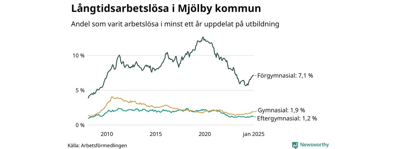 I januari hade 337 Mjölbybor varit arbetslösa i minst ett år, vilket är sex färre än månaden innan. Det är den första månaden sedan februari 2024 som antalet arbetslösa minskar. 337 personer motsvarar 2,3 procent av arbetskraften i kommunen – andelen långtidsarbetslösa är 0,3 procentenheter högre än samma månad för ett år sedan.