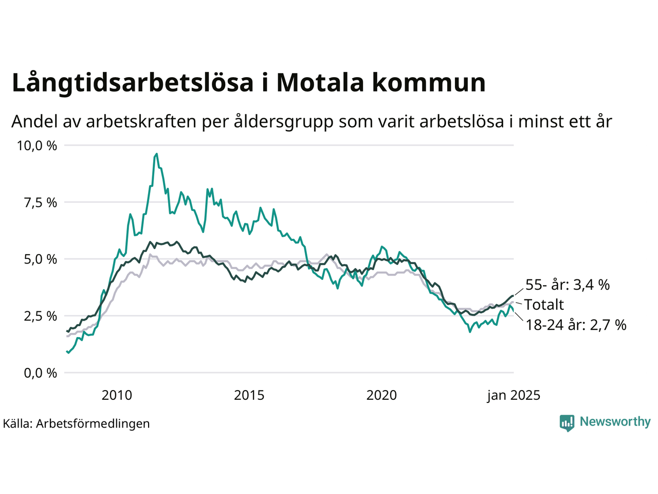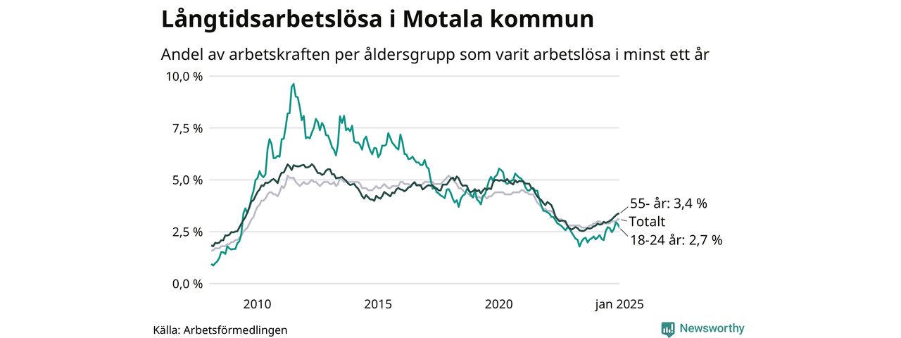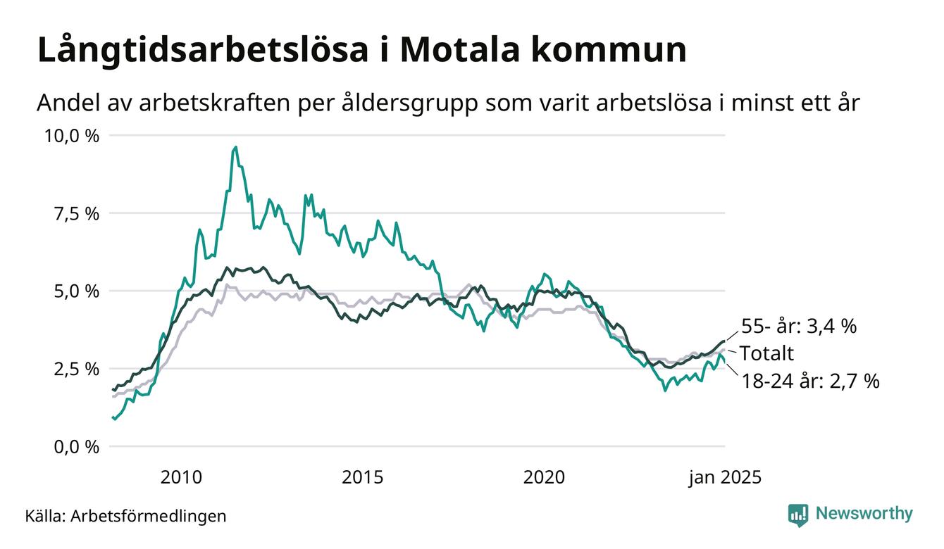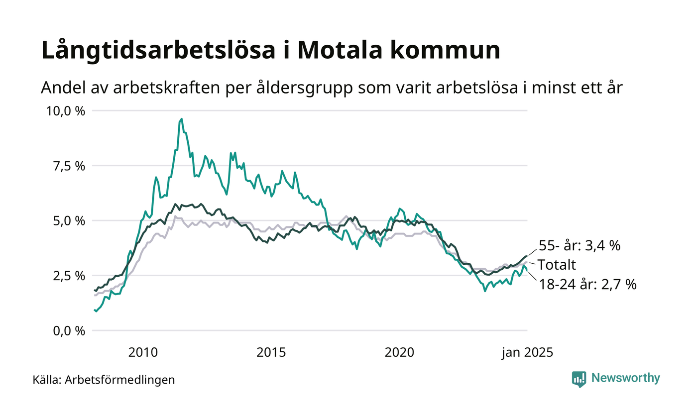 Av de 640 personerna som varit arbetslösa i mer än ett år i Motala kommun är 165 personer mellan 55 och 651 år och 56 är mellan 18 och 24 år. För den äldre gruppen är andelen arbetslösa 3,4 procent medan den i den yngre gruppen är 2,7 procent. Även i riket som helhet är långtidsarbetslösheten högre i gruppen äldre.