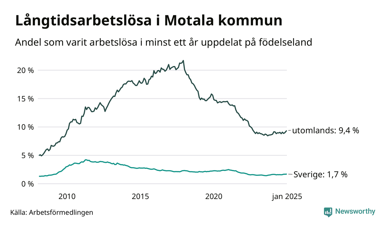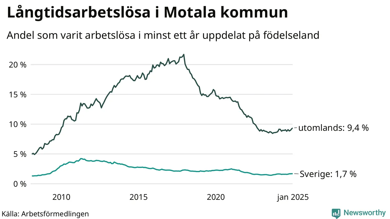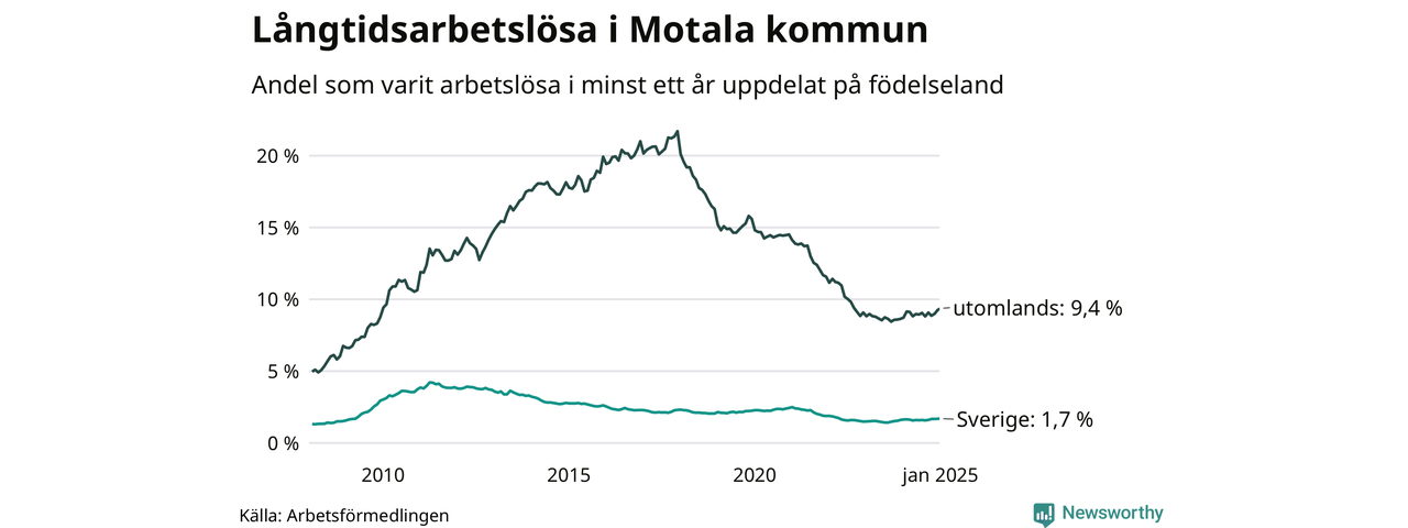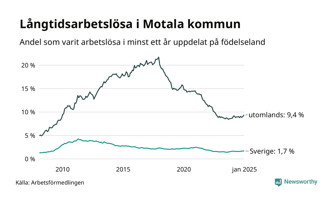 288 av de långtidsarbetslösa i Motala är födda i Sverige, medan 352 är födda utomlands. Det innebär att långtidsarbetslösheten bland Sverigefödda är 1,7 procent, medan den är sex gånger så hög – 9,4 procent – bland födda utomlands. Även i riket som helhet är arbetslösheten högre bland utrikesfödda.