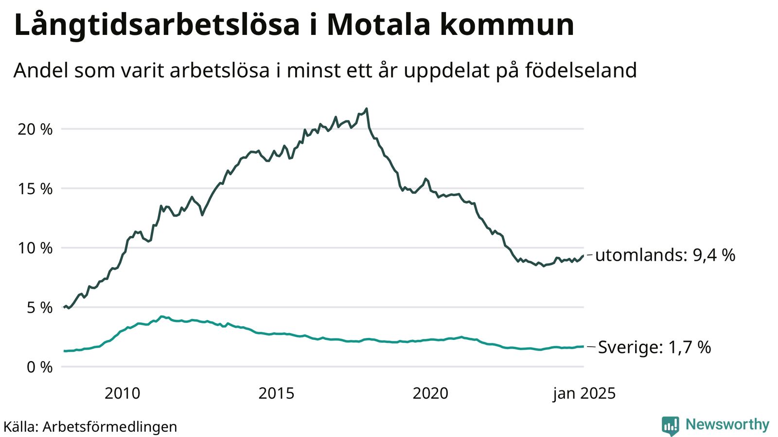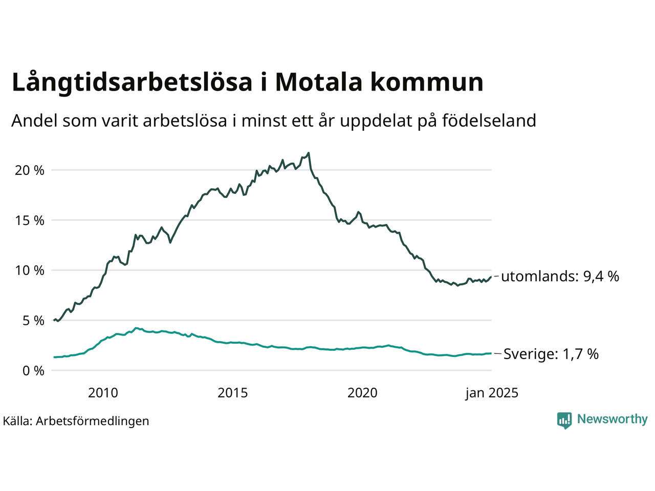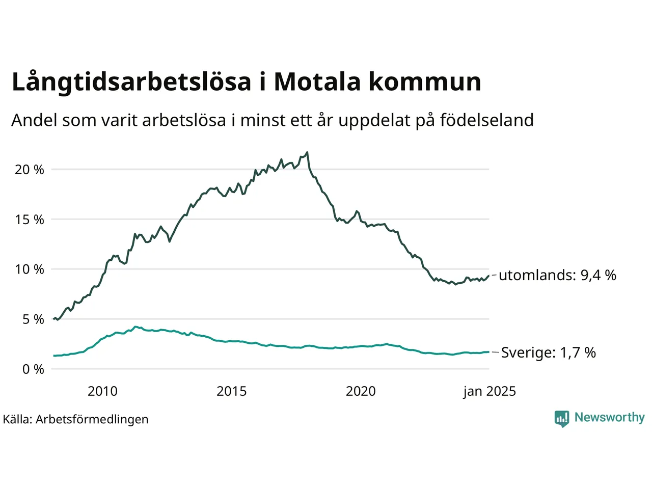 288 av de långtidsarbetslösa i Motala är födda i Sverige, medan 352 är födda utomlands. Det innebär att långtidsarbetslösheten bland Sverigefödda är 1,7 procent, medan den är sex gånger så hög – 9,4 procent – bland födda utomlands. Även i riket som helhet är arbetslösheten högre bland utrikesfödda.