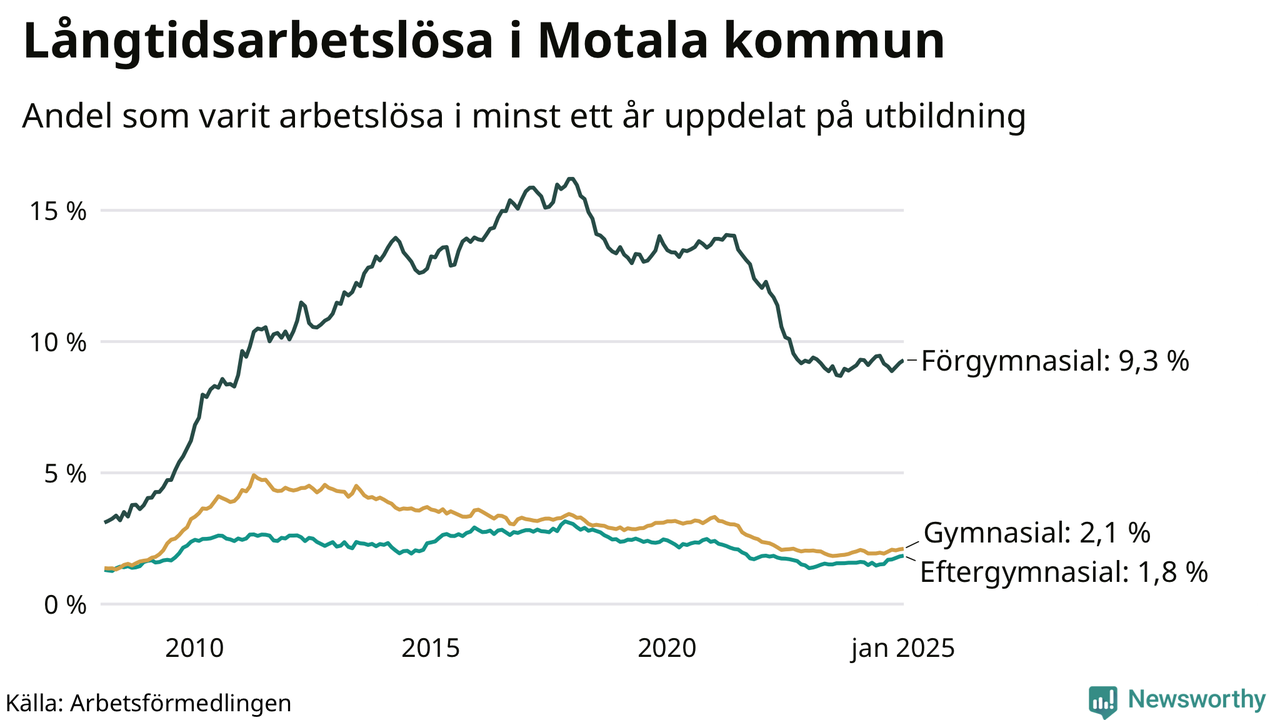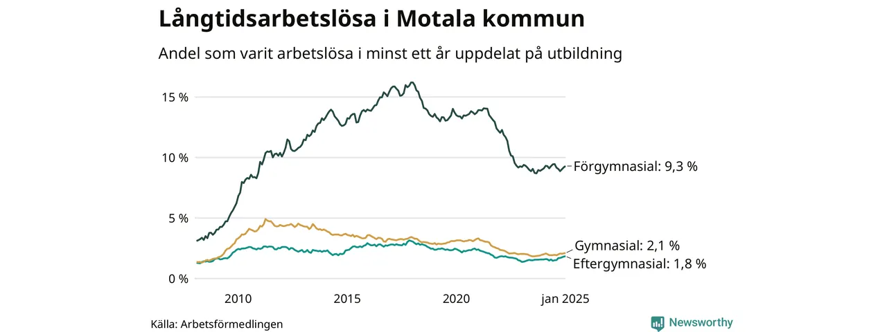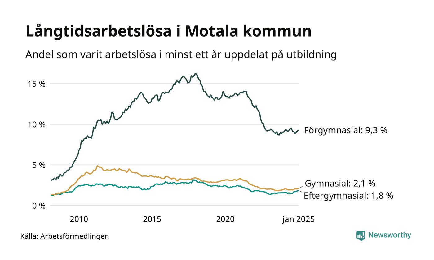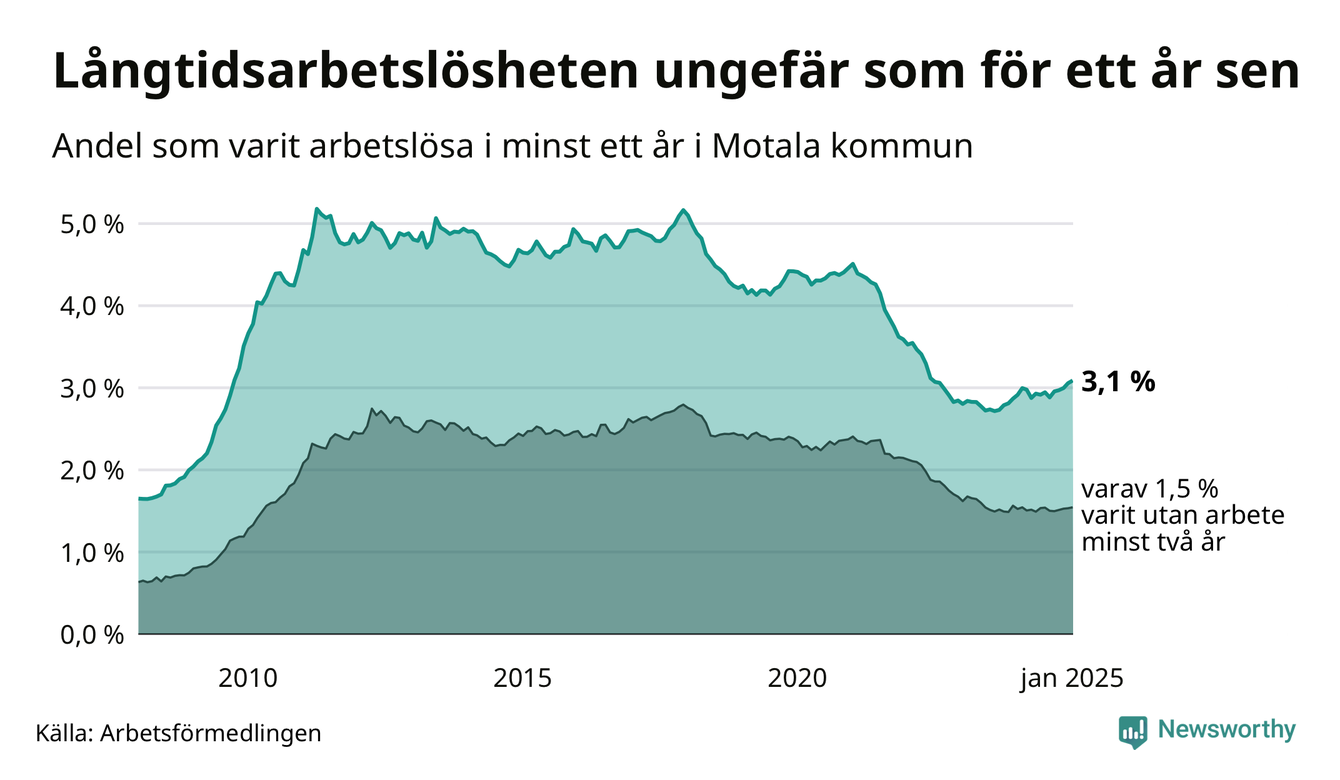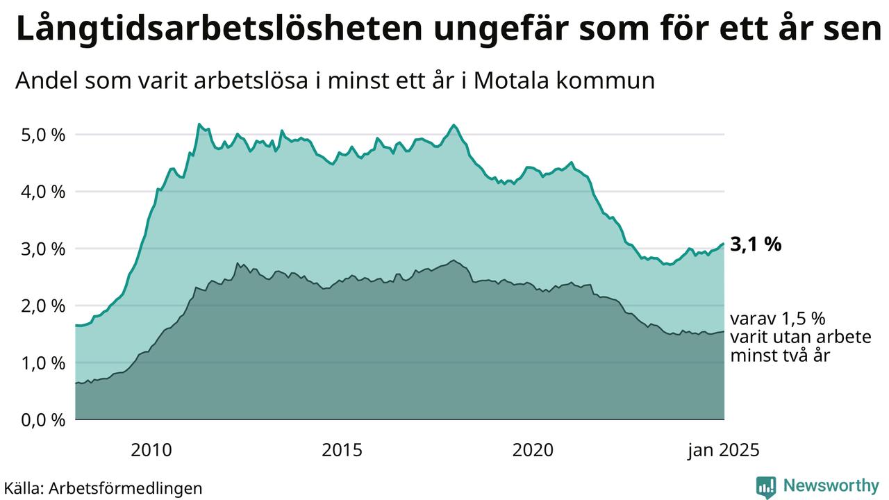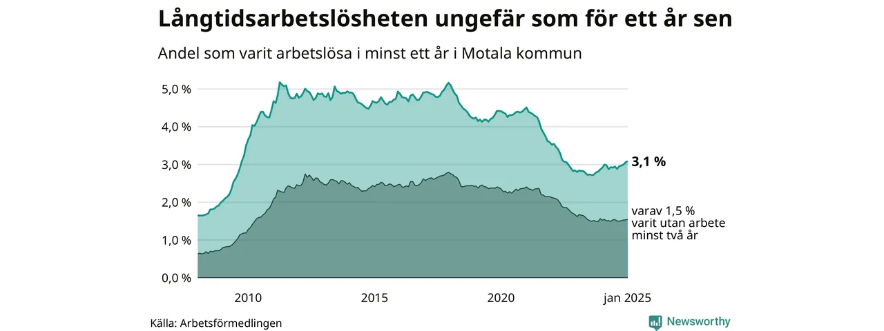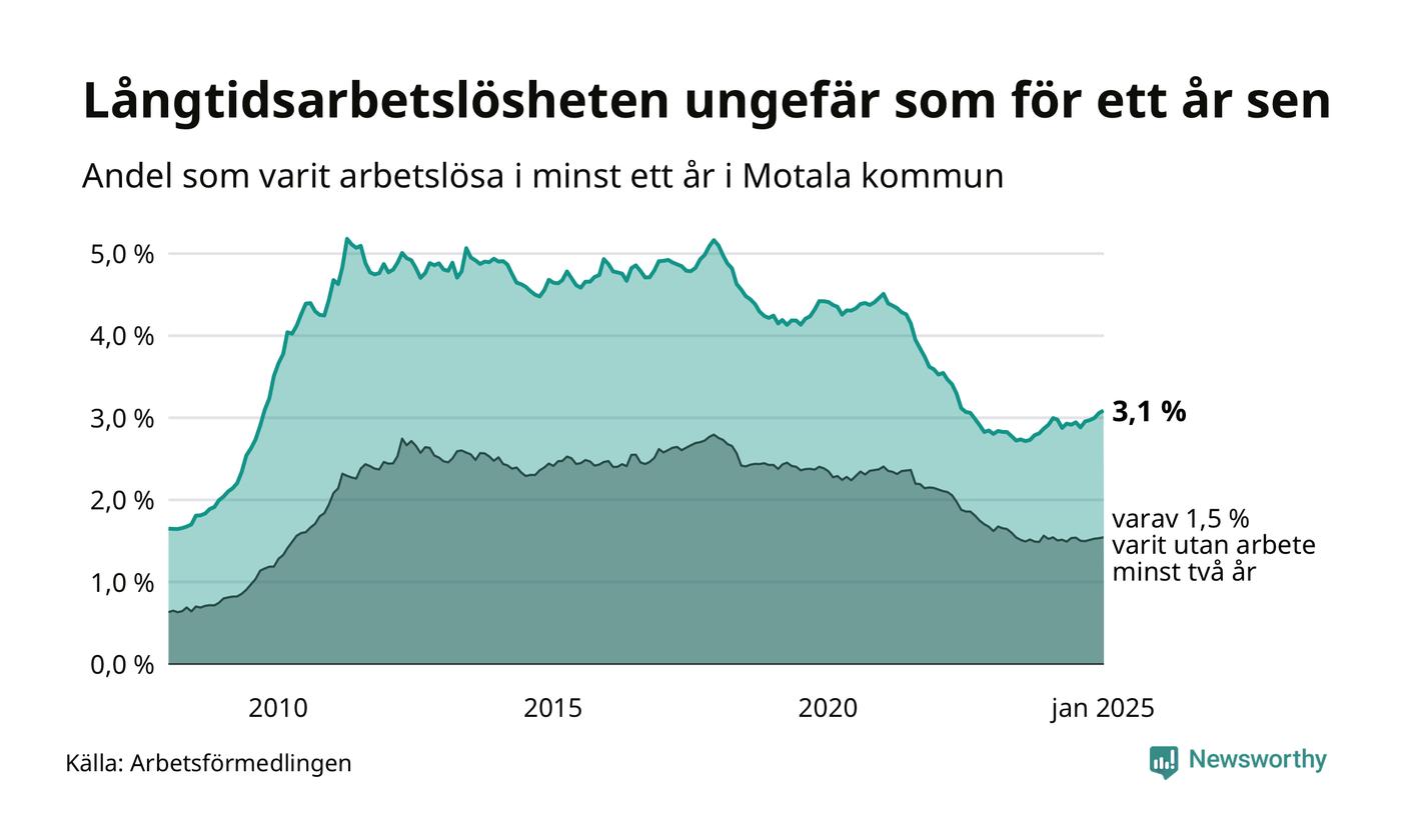 I januari hade 640 Motalabor varit arbetslösa i minst ett år, vilket är sex fler än månaden innan. Det är den femte månaden i rad med ökande antal långtidsarbetslösa. 640 personer motsvarar 3,1 procent av arbetskraften i kommunen – andelen långtidsarbetslösa är ungefär på samma nivå som för ett år sedan.