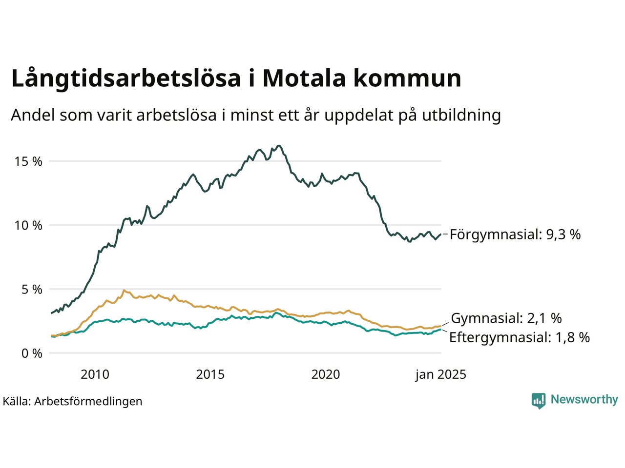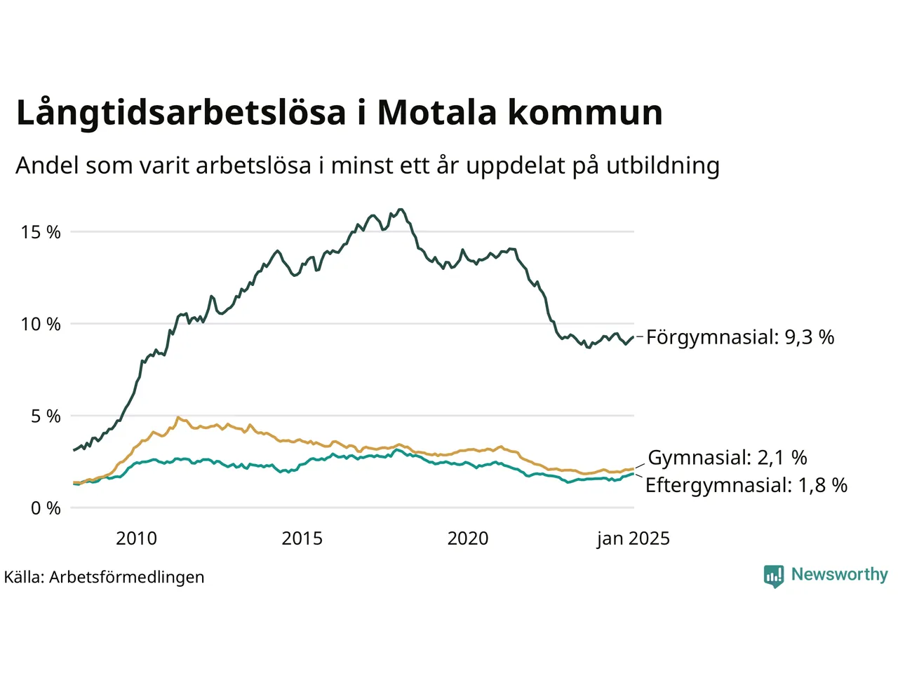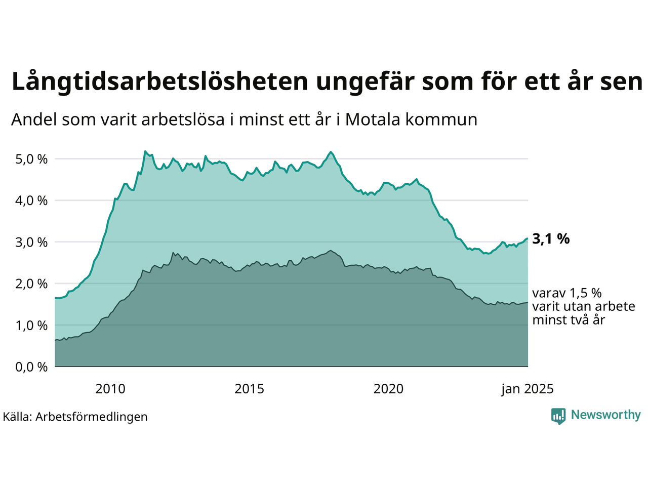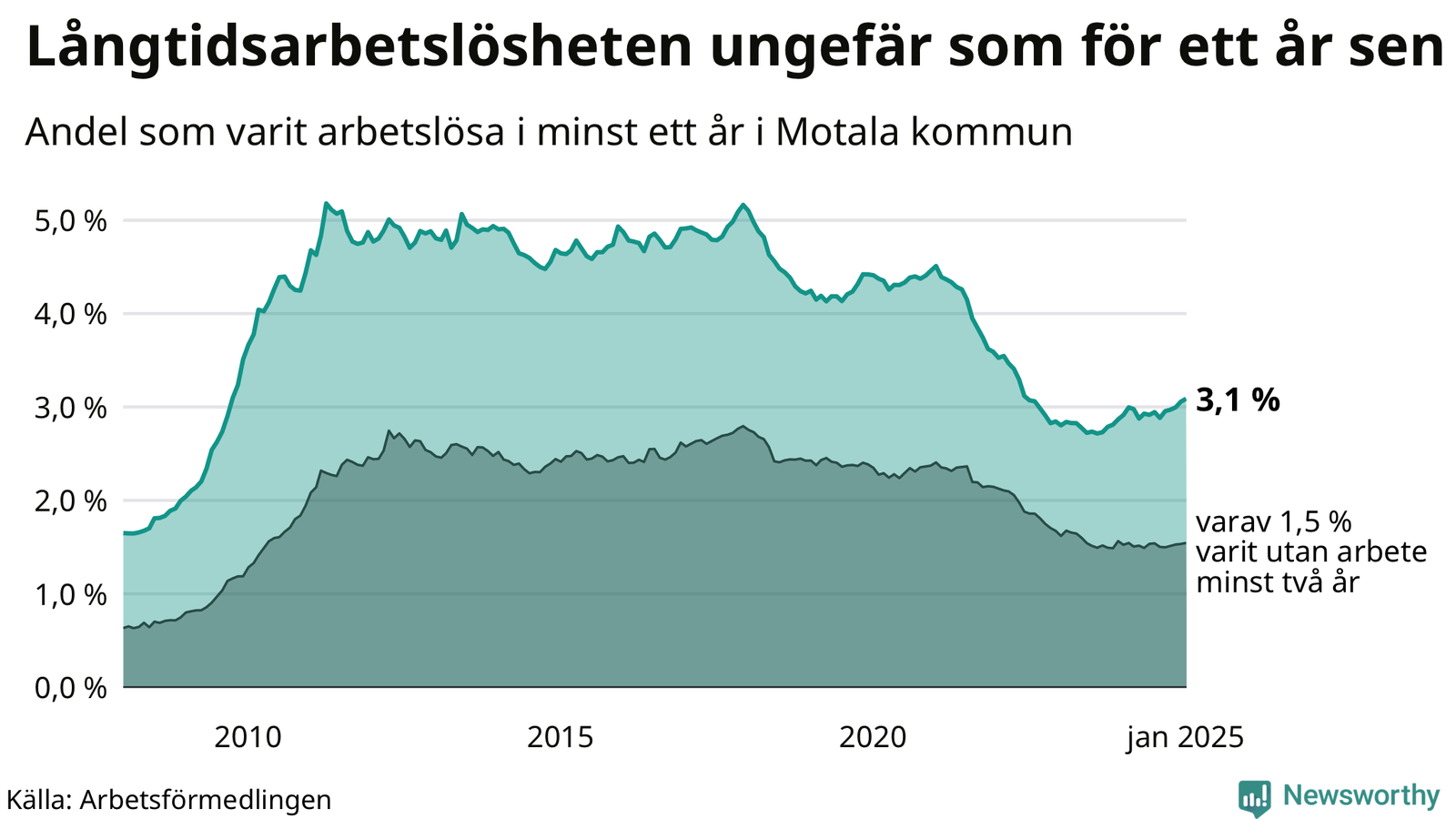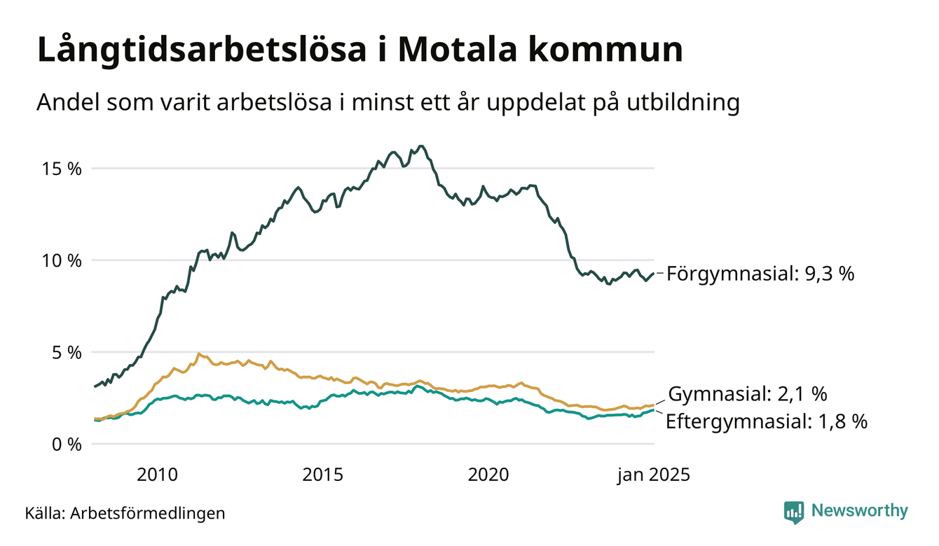 I januari hade 640 Motalabor varit arbetslösa i minst ett år, vilket är sex fler än månaden innan. Det är den femte månaden i rad med ökande antal långtidsarbetslösa. 640 personer motsvarar 3,1 procent av arbetskraften i kommunen – andelen långtidsarbetslösa är ungefär på samma nivå som för ett år sedan.