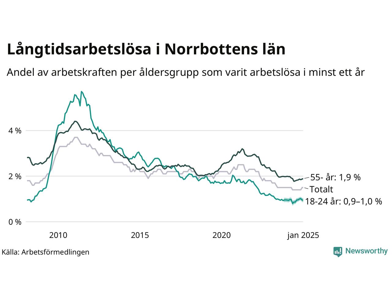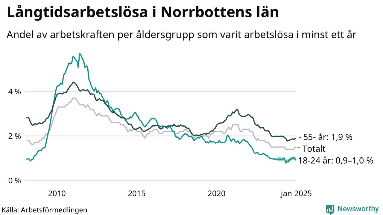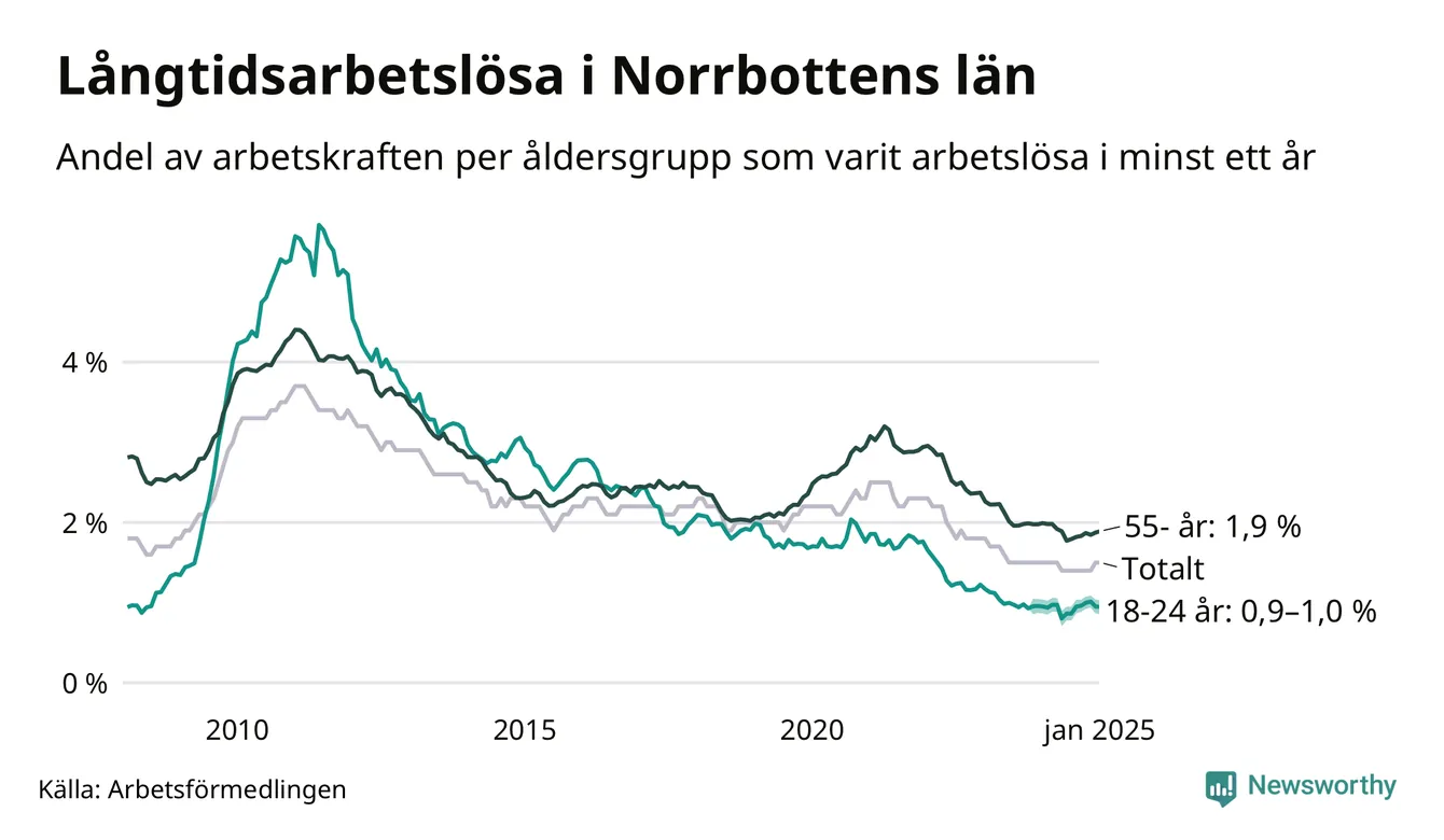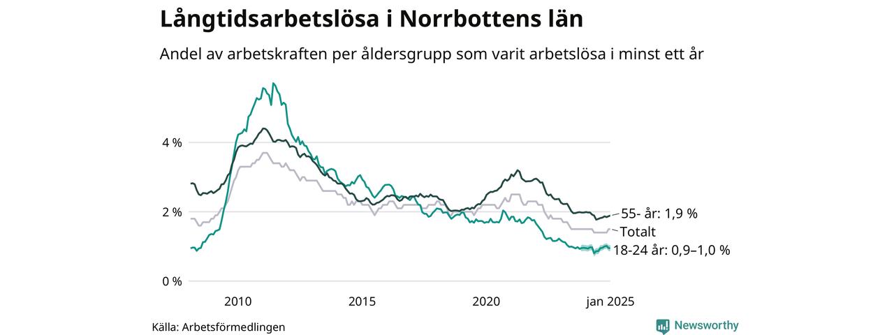 Av de 1 791 personerna som varit arbetslösa i mer än ett år i Norrbottens län är mellan 537 och 540 personer mellan 55 och 651 år och mellan 119 och 143 är mellan 18 och 24 år. För den äldre gruppen är andelen arbetslösa 1,9 procent medan den i den yngre gruppen är mellan 0,9 och 1,0 procent. Även i riket som helhet är långtidsarbetslösheten högre i gruppen äldre.