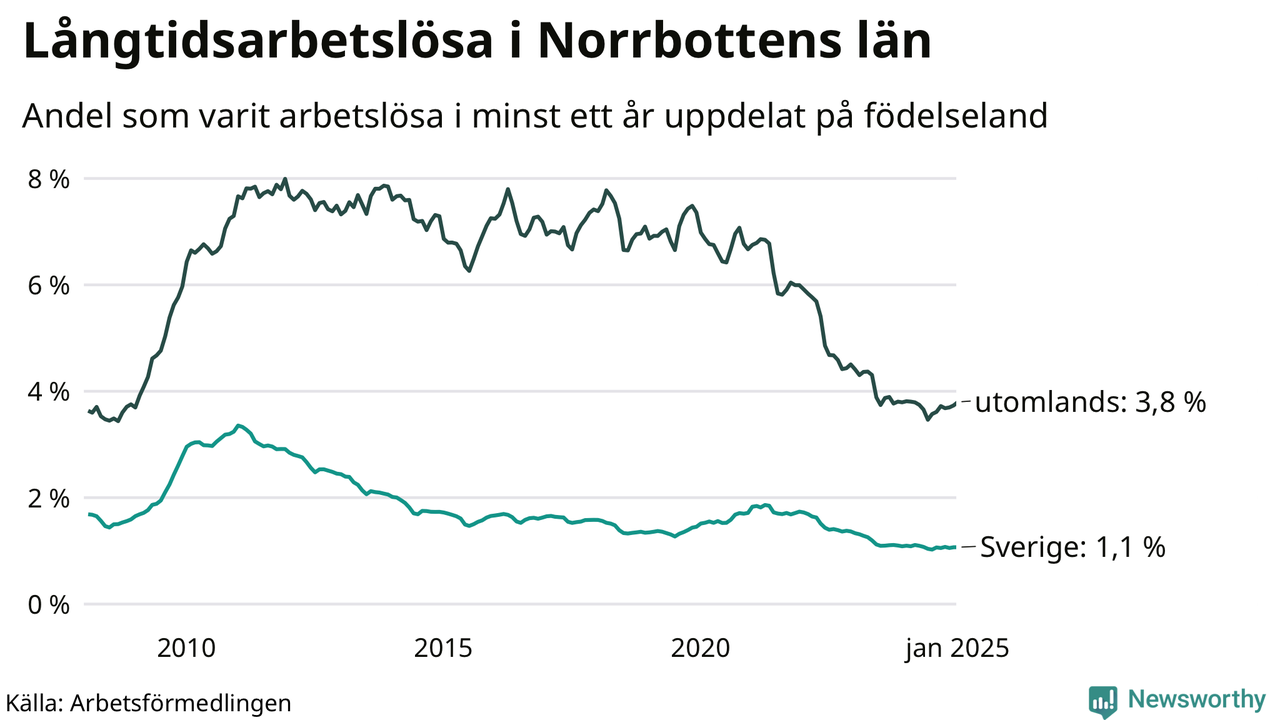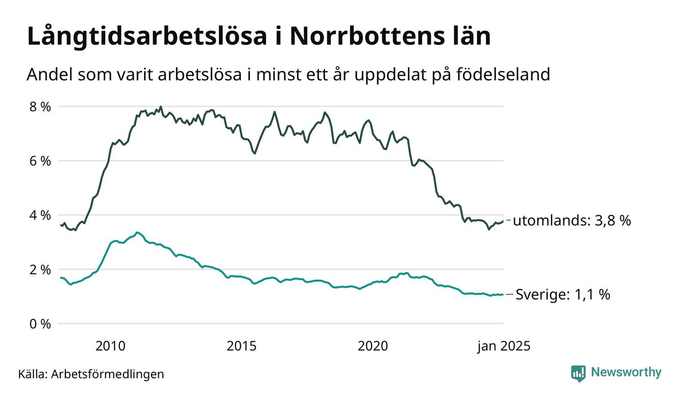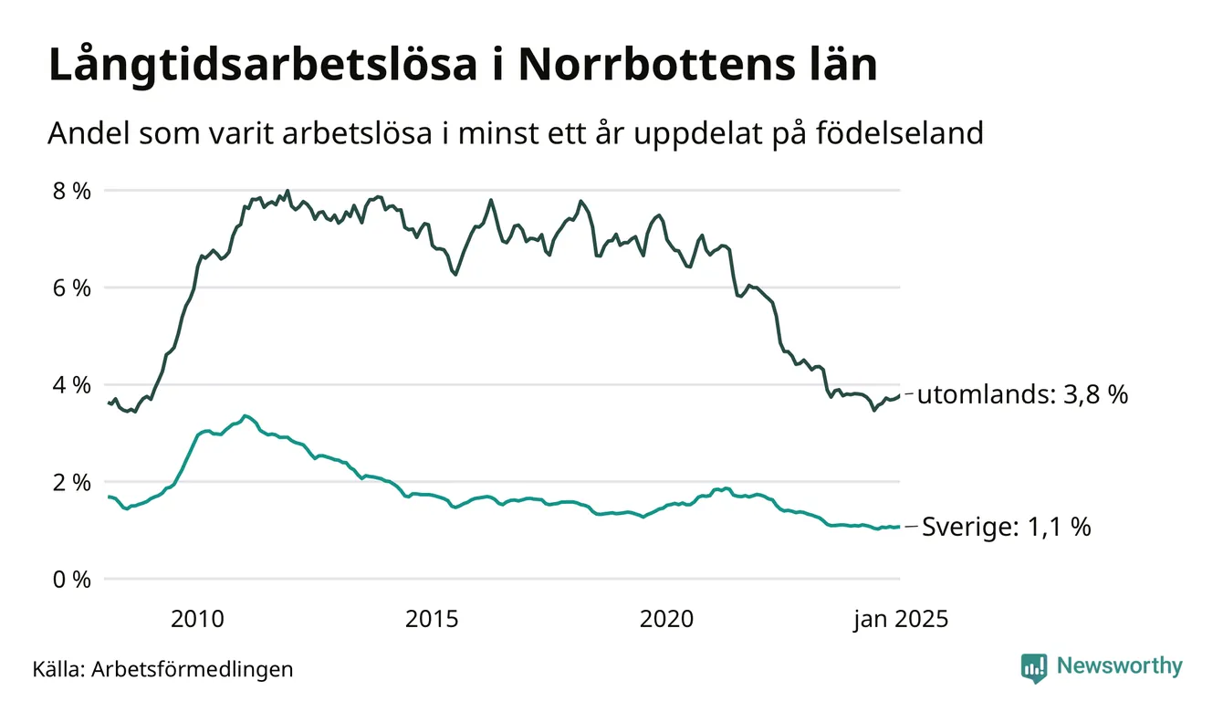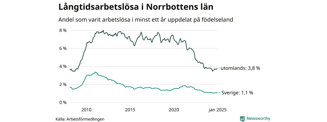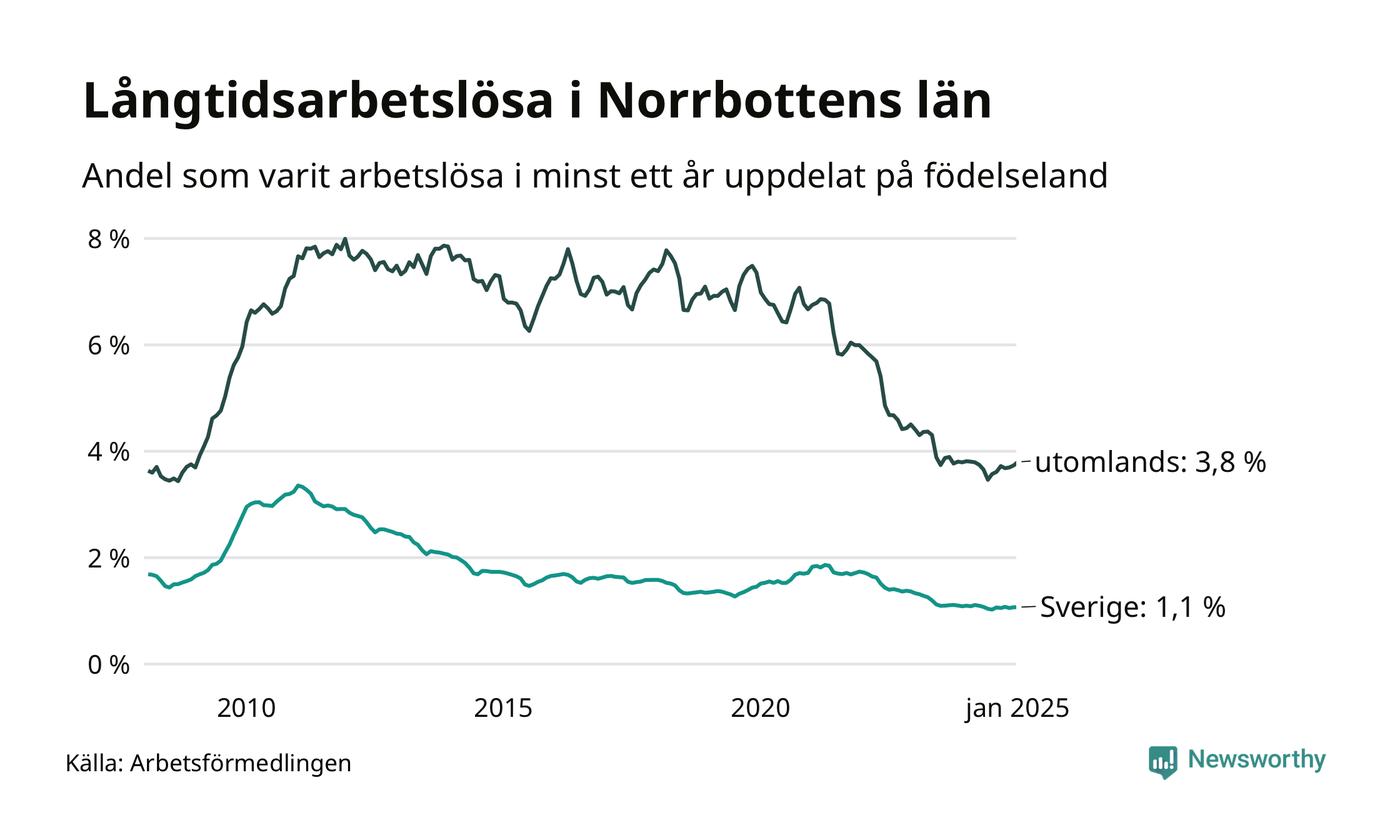 1 120 av de långtidsarbetslösa i Norrbotten är födda i Sverige, medan 671 är födda utomlands. Det innebär att långtidsarbetslösheten bland Sverigefödda är 1,1 procent, medan den är tre gånger så hög – 3,8 procent – bland födda utomlands. Även i riket som helhet är arbetslösheten högre bland utrikesfödda.