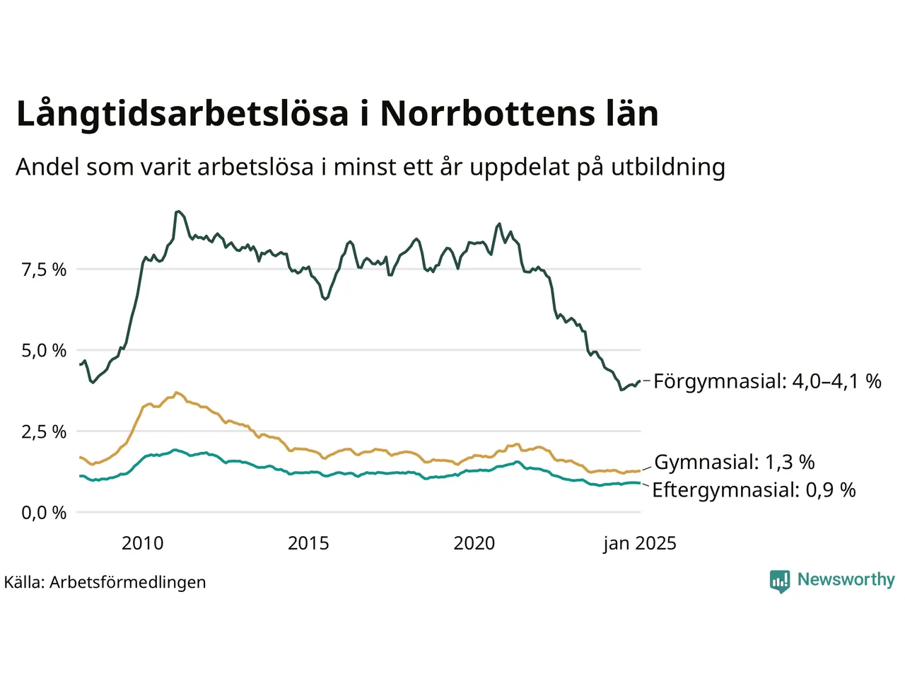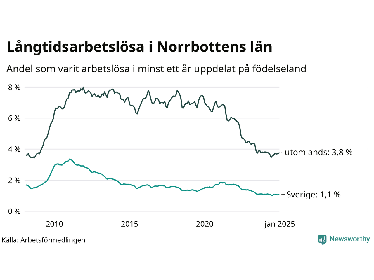 | Andel arbetslösa i minst två år | 0,8 % | 1,5 % |