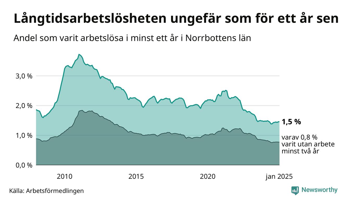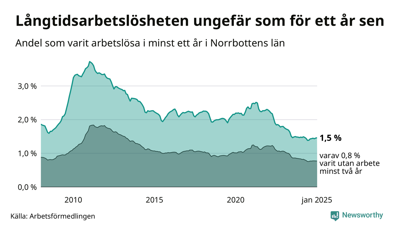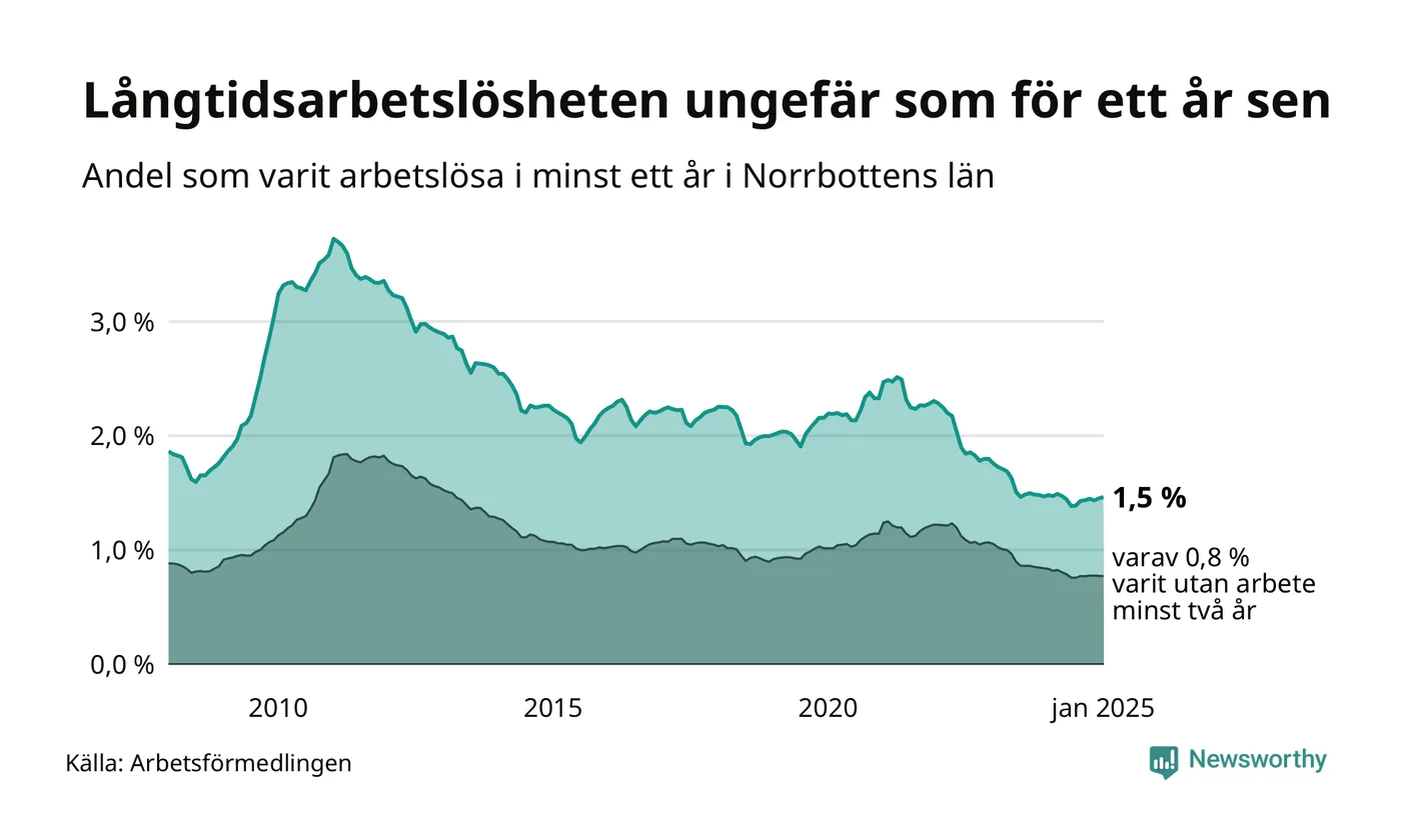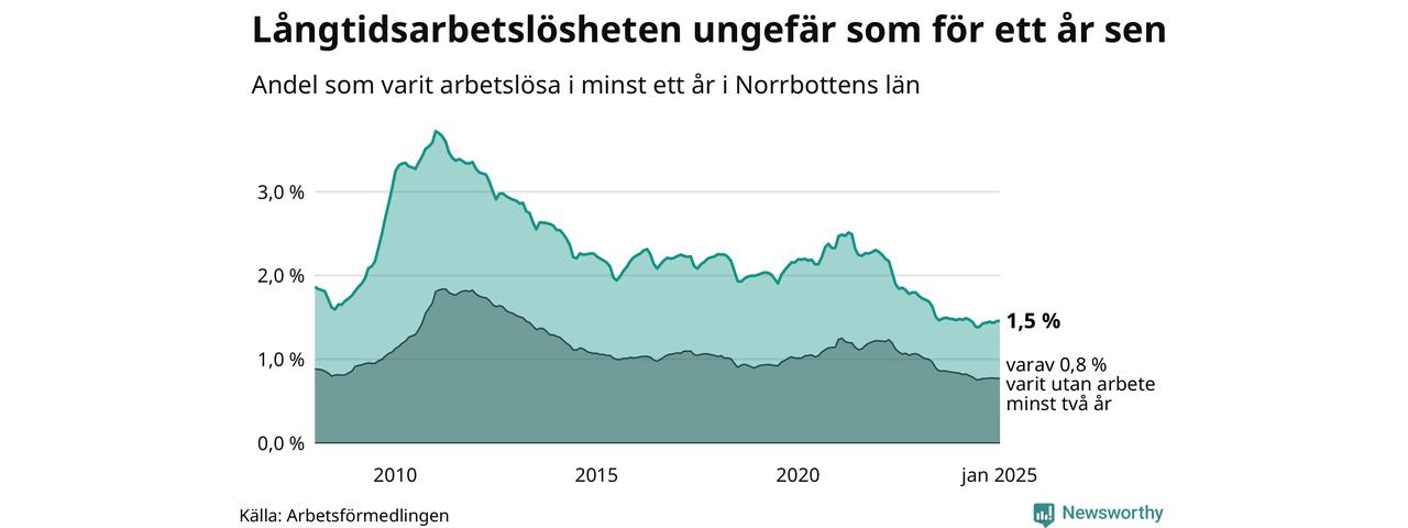 I januari hade 1 791 Norrbottensbor varit arbetslösa i minst ett år, vilket är 13 fler än månaden innan. 1 791 personer motsvarar 1,5 procent av arbetskraften i länet – andelen långtidsarbetslösa är ungefär på samma nivå som för ett år sedan. Norrbottens län hade tredje lägst andel långtidsarbetslösa i landet i januari.
