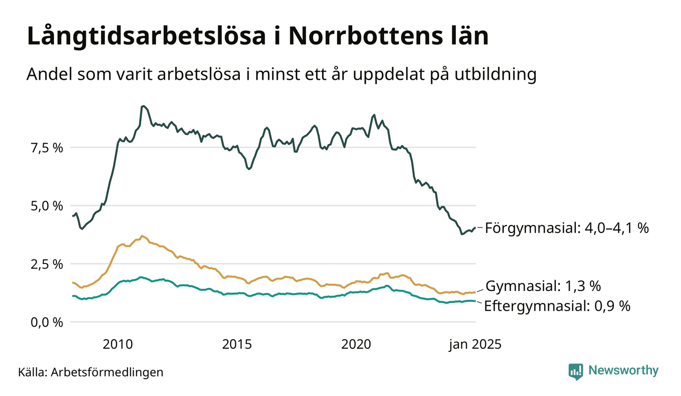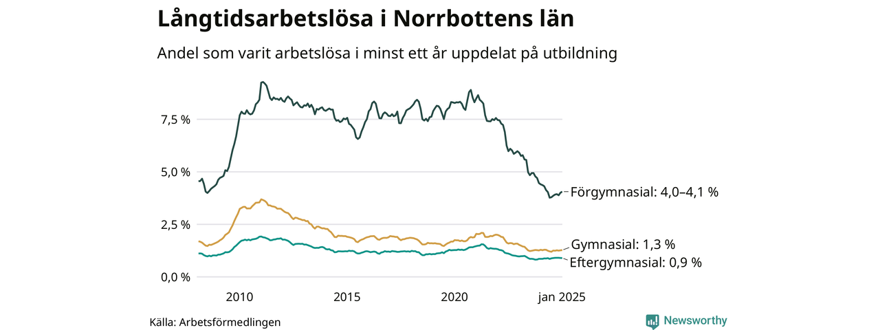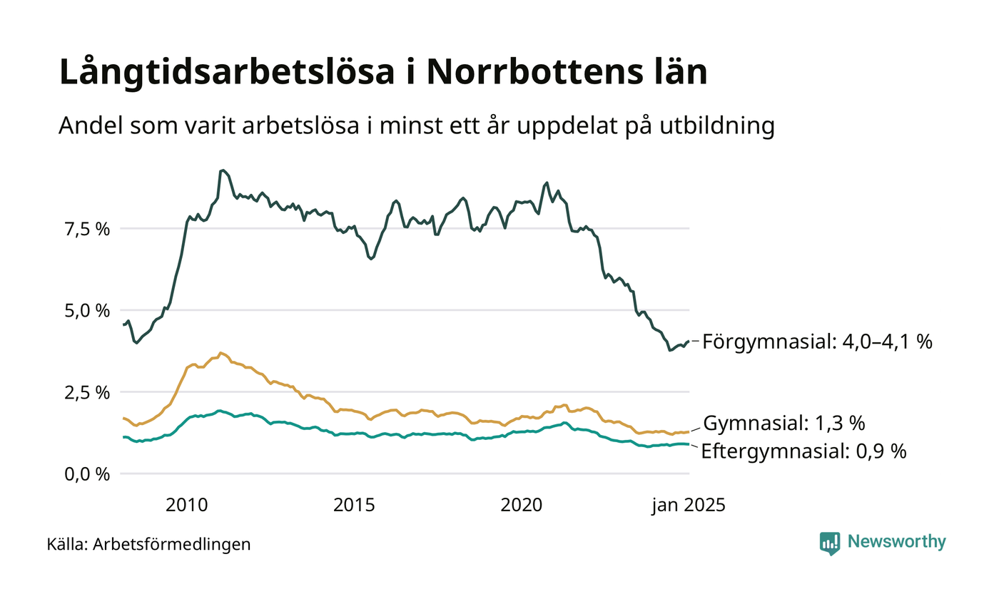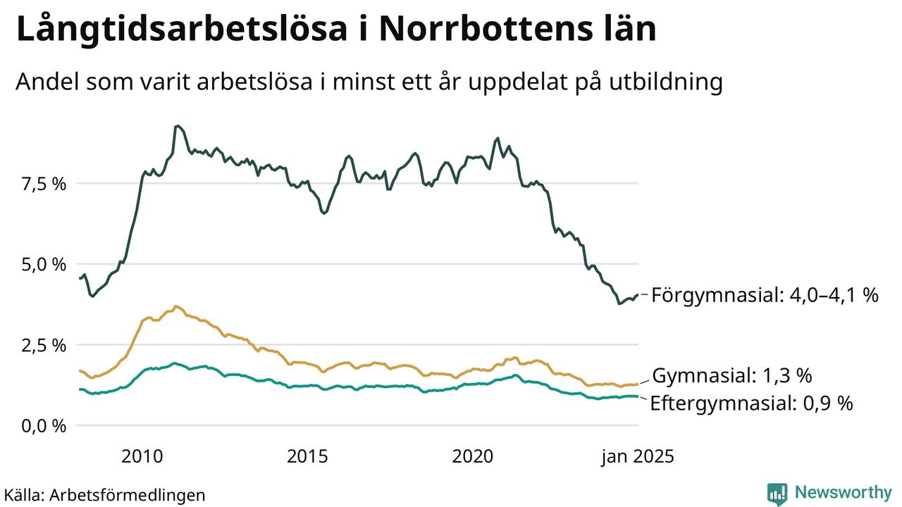 I januari hade 1 791 Norrbottensbor varit arbetslösa i minst ett år, vilket är 13 fler än månaden innan. 1 791 personer motsvarar 1,5 procent av arbetskraften i länet – andelen långtidsarbetslösa är ungefär på samma nivå som för ett år sedan. Norrbottens län hade tredje lägst andel långtidsarbetslösa i landet i januari.