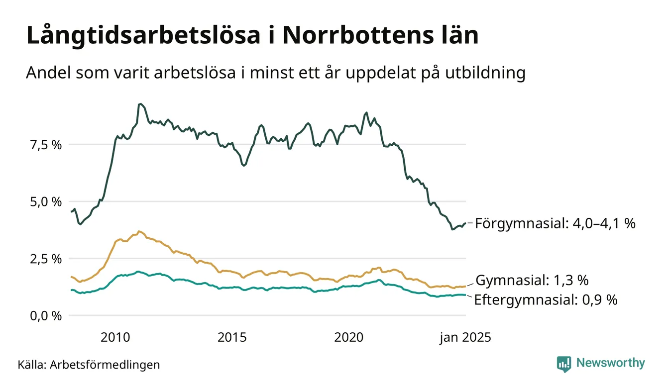 Även när det gäller utbildningsnivå är skillnaderna stora. Mellan 579 och 582 av de som varit arbetslösa i minst ett år har inte någon gymnasieutbildning, vilket motsvarar en långtidsarbetslöhet på mellan 4,0 och 4,1 procent i den gruppen. Det kan jämföras med 1,3 procent bland dem som gått ut gymnasiet och 0,9 procent bland dem som studerat vidare efter gymnasiet.