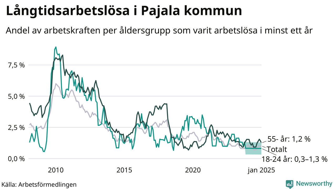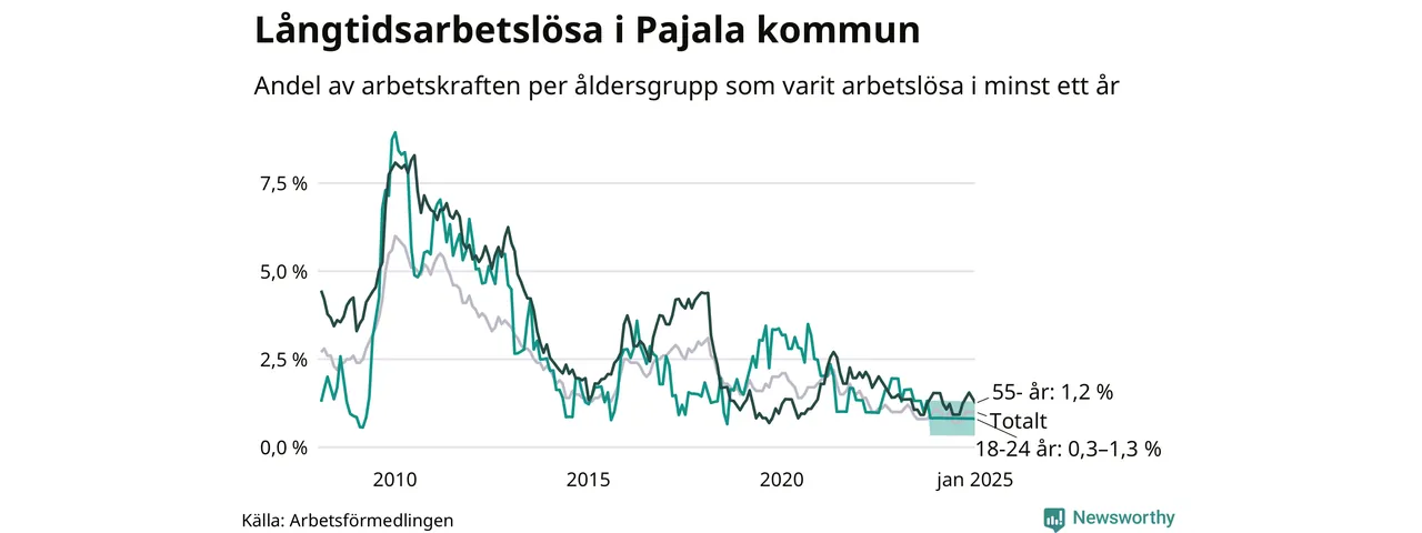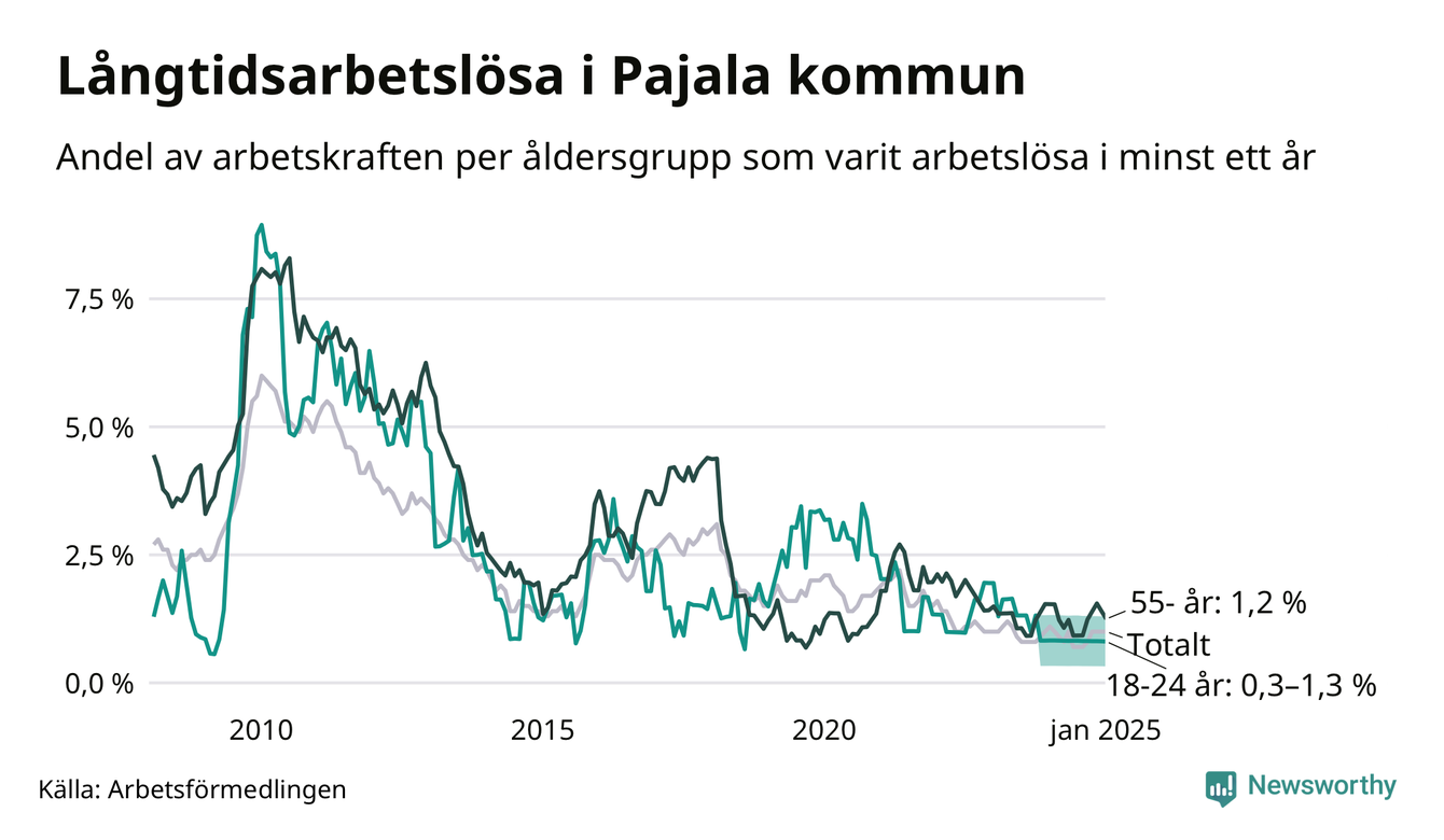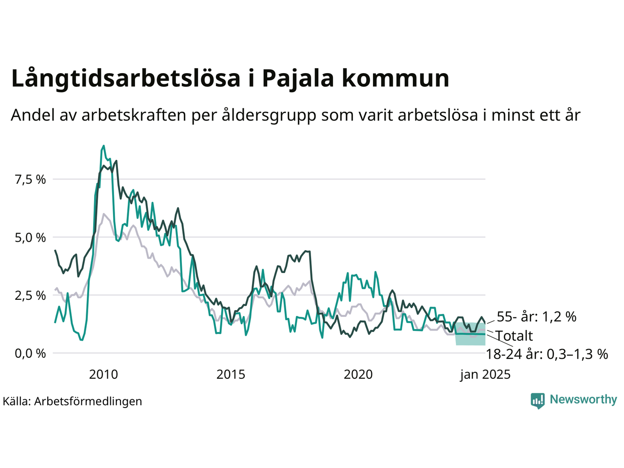 Av de 25 personerna som varit arbetslösa i mer än ett år i Pajala kommun är åtta personer mellan 55 och 651 år och mellan en och fyra är mellan 18 och 24 år. För den äldre gruppen är andelen arbetslösa 1,2 procent medan den i den yngre gruppen är mellan 0,3 och 1,3 procent. Även i riket som helhet är långtidsarbetslösheten högre i gruppen äldre.
